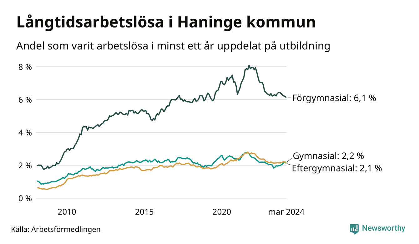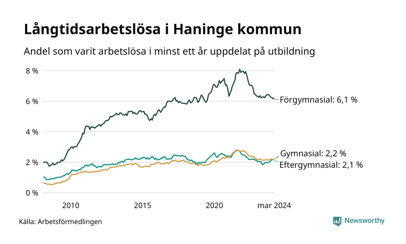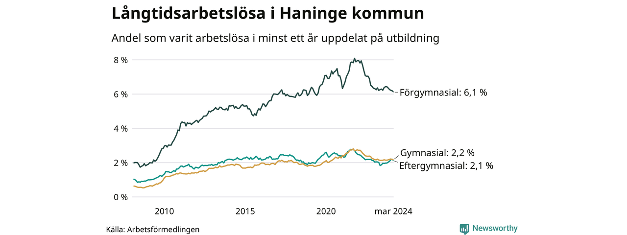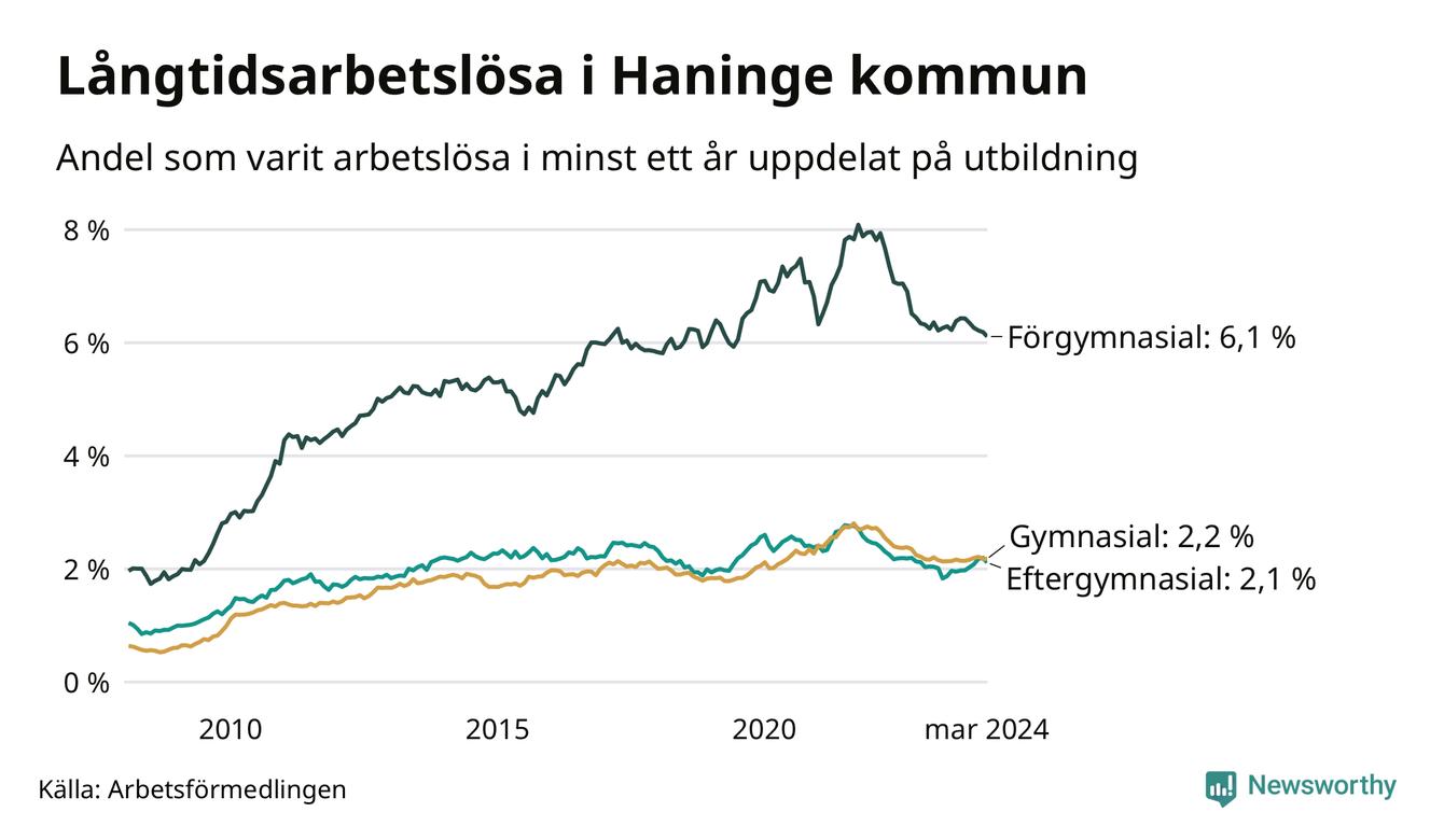 Graf över andel långtidsarbetslösa i Haninge uppdelat på utbildningsnivå