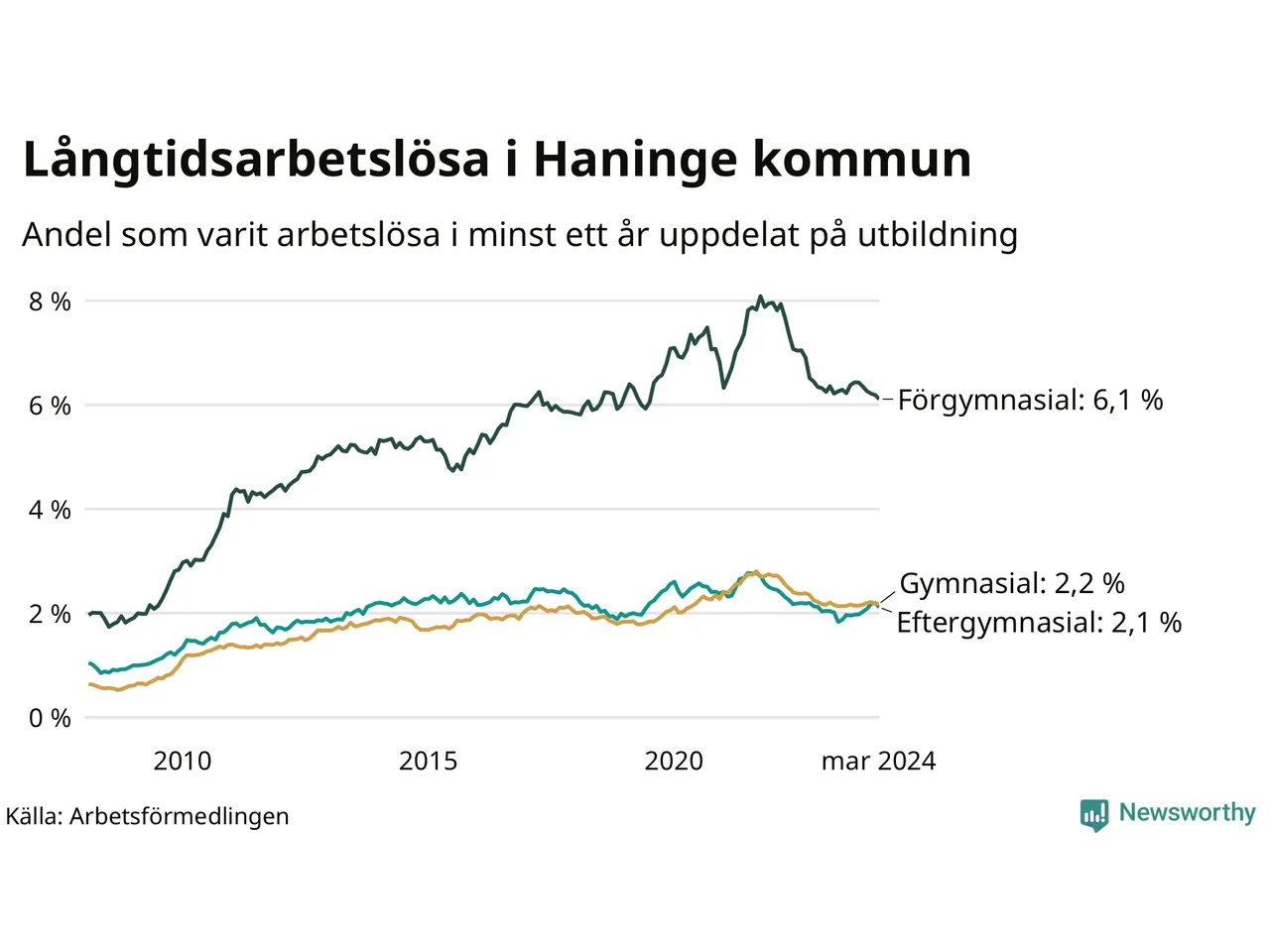 Graf: Andel arbetslösa i Haninge som varit utan arbete i minst 12 månader