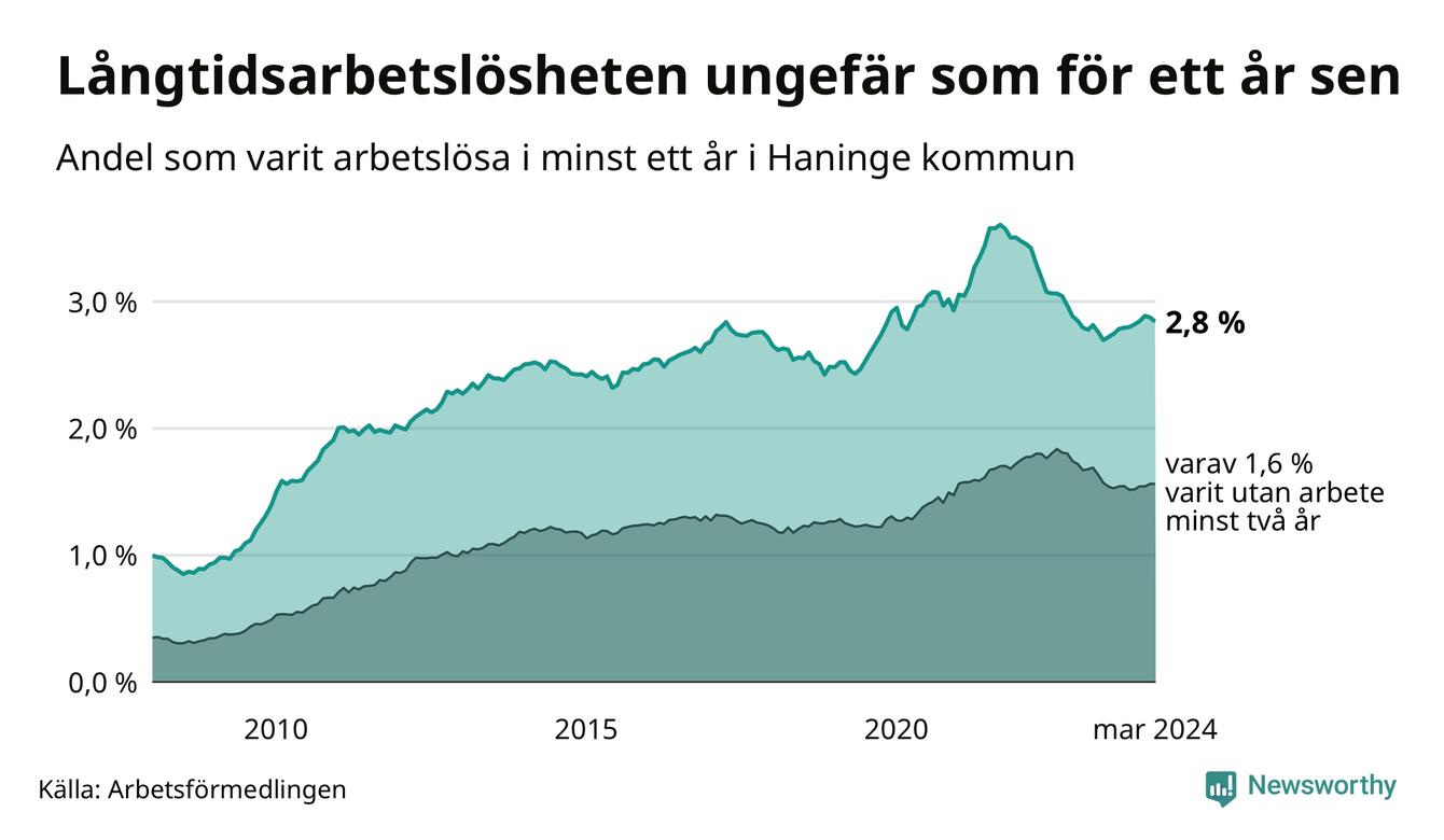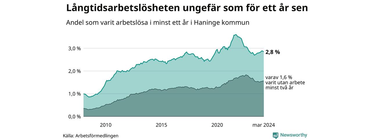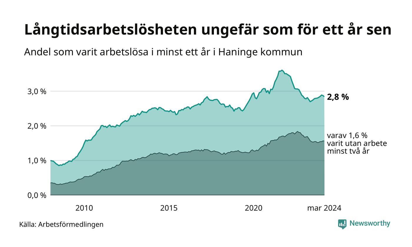 I mars hade 1 477 Haningebor varit arbetslösa i minst ett år, vilket är 14 färre än månaden innan. 1 477 personer motsvarar 2,8 procent av arbetskraften i kommunen – andelen långtidsarbetslösa är ungefär på samma nivå som för ett år sedan.