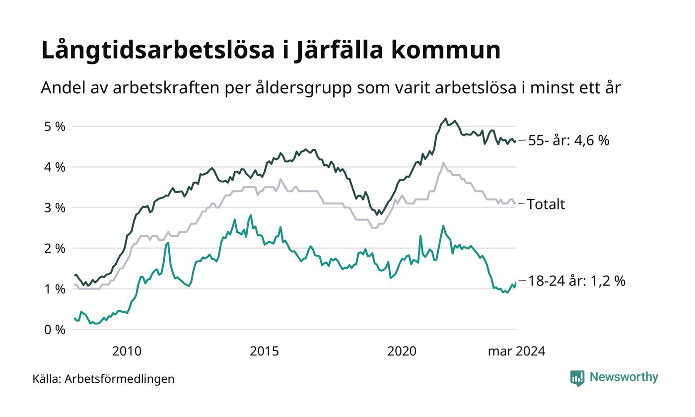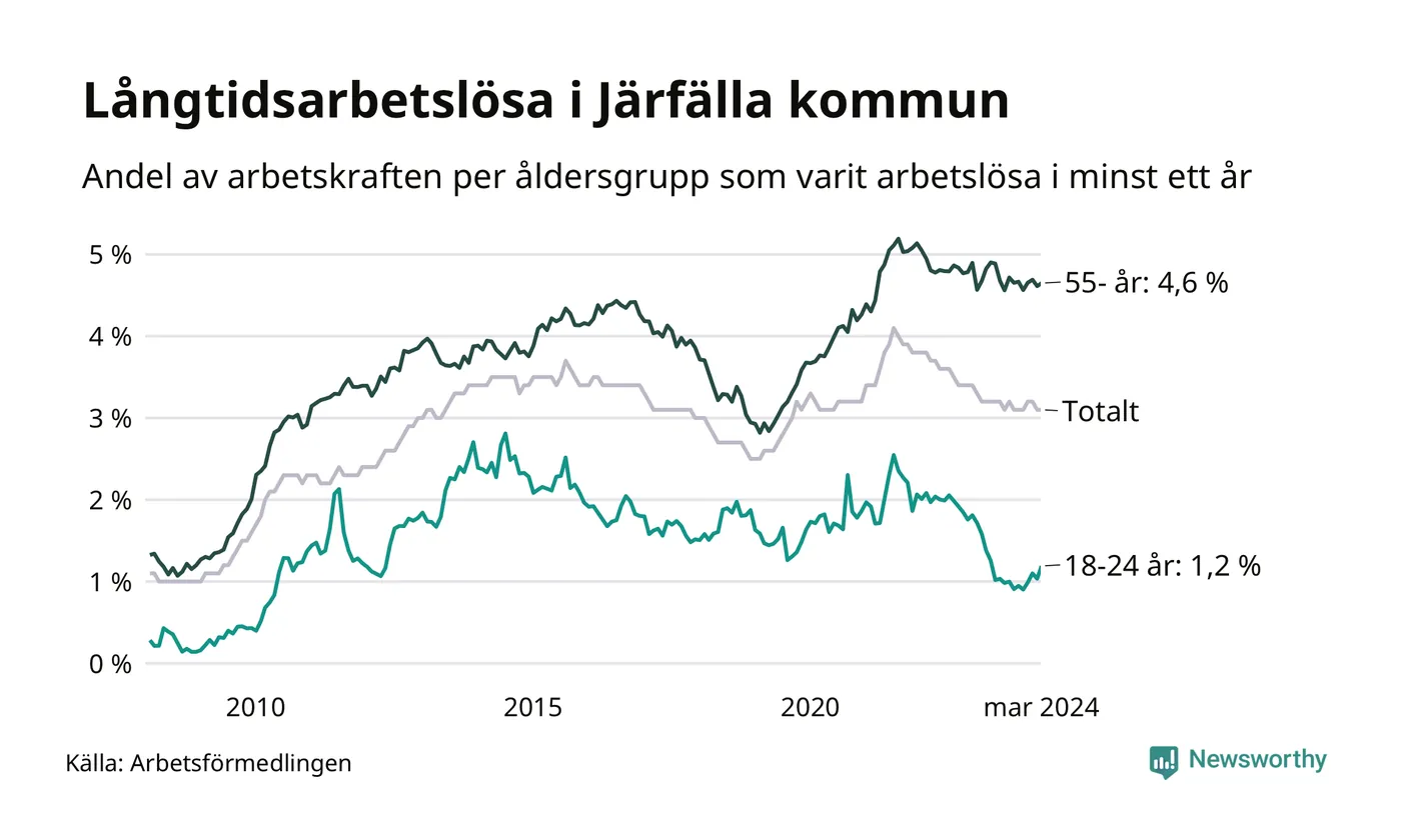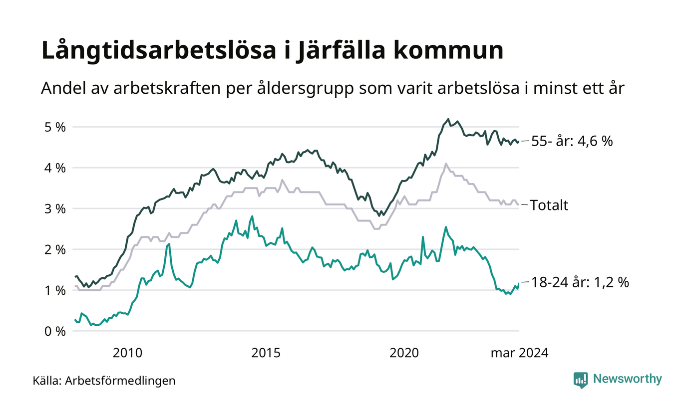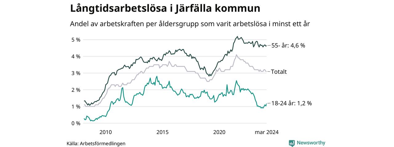 Av de 1 391 personerna som varit arbetslösa i mer än ett år i Järfälla kommun är 364 personer mellan 55 och 651 år och 54 är mellan 18 och 24 år. För den äldre gruppen är andelen arbetslösa 4,6 procent medan den i den yngre gruppen är 1,2 procent. Även i riket som helhet är långtidsarbetslösheten högre i gruppen äldre.