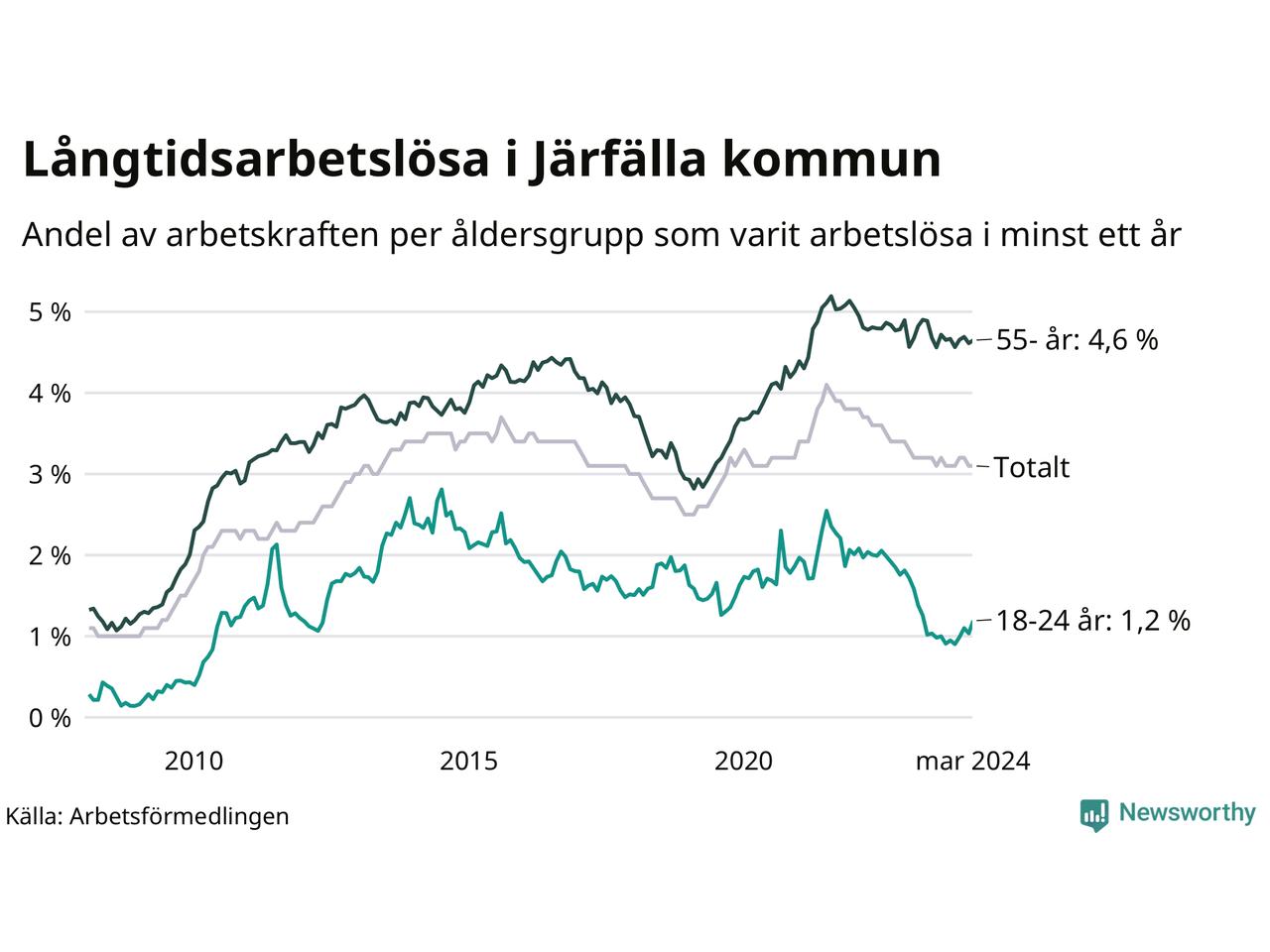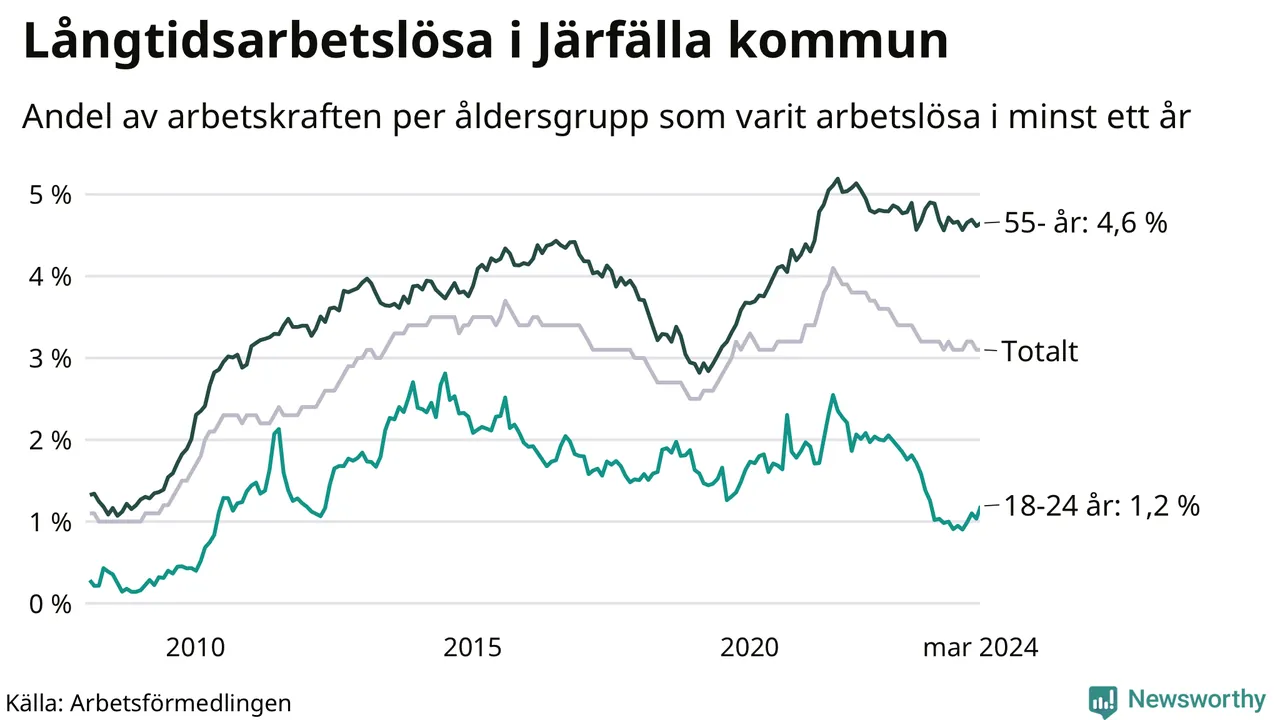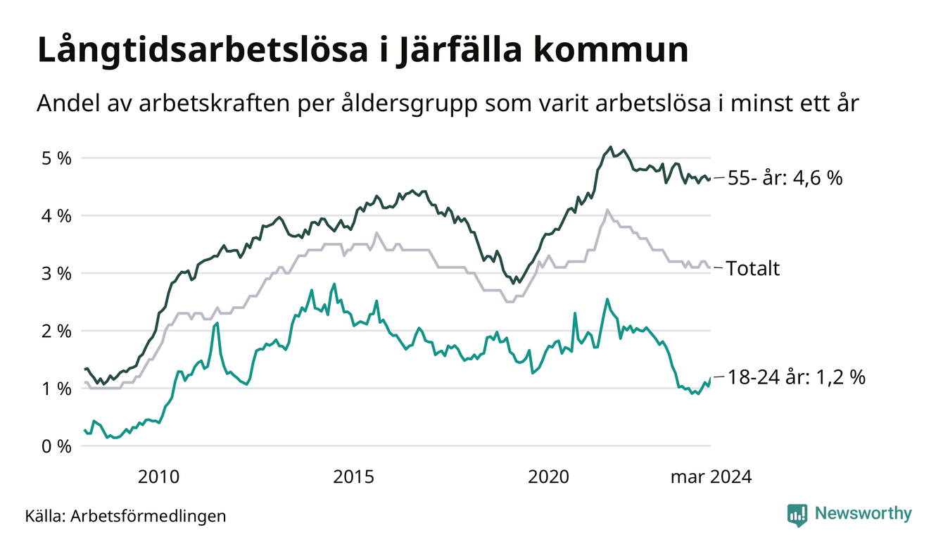 Av de 1 391 personerna som varit arbetslösa i mer än ett år i Järfälla kommun är 364 personer mellan 55 och 651 år och 54 är mellan 18 och 24 år. För den äldre gruppen är andelen arbetslösa 4,6 procent medan den i den yngre gruppen är 1,2 procent. Även i riket som helhet är långtidsarbetslösheten högre i gruppen äldre.