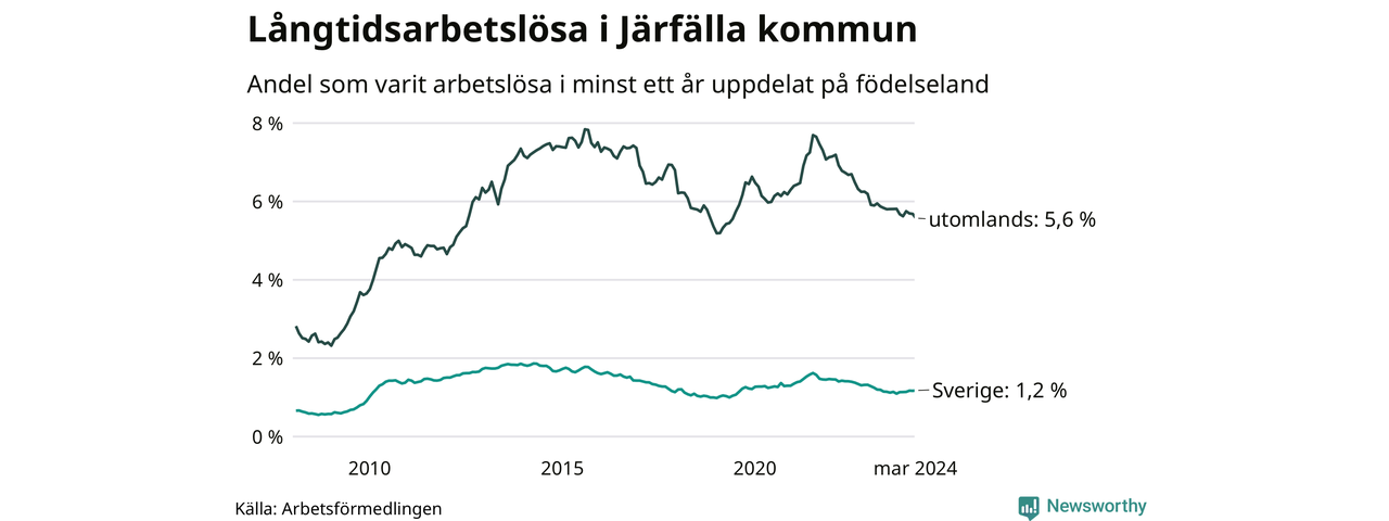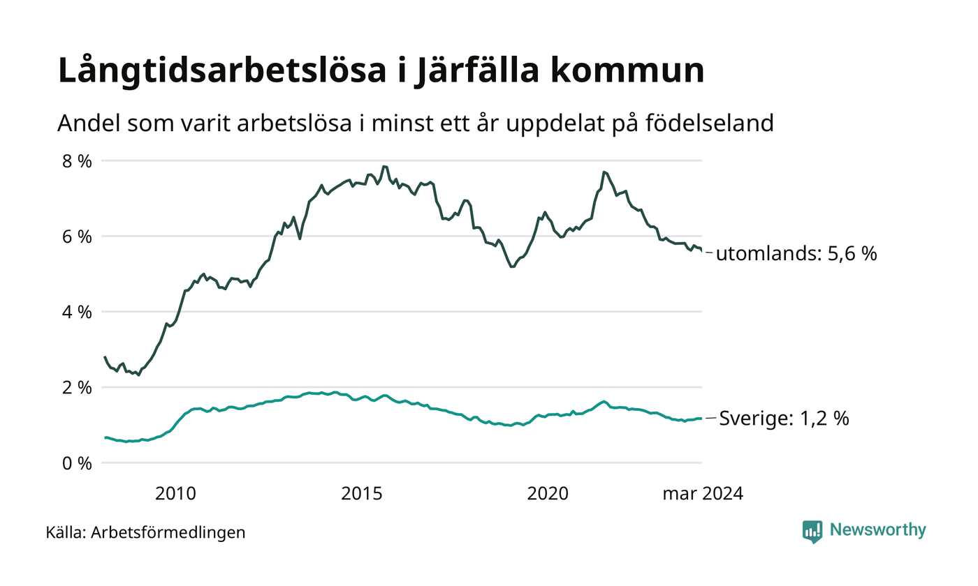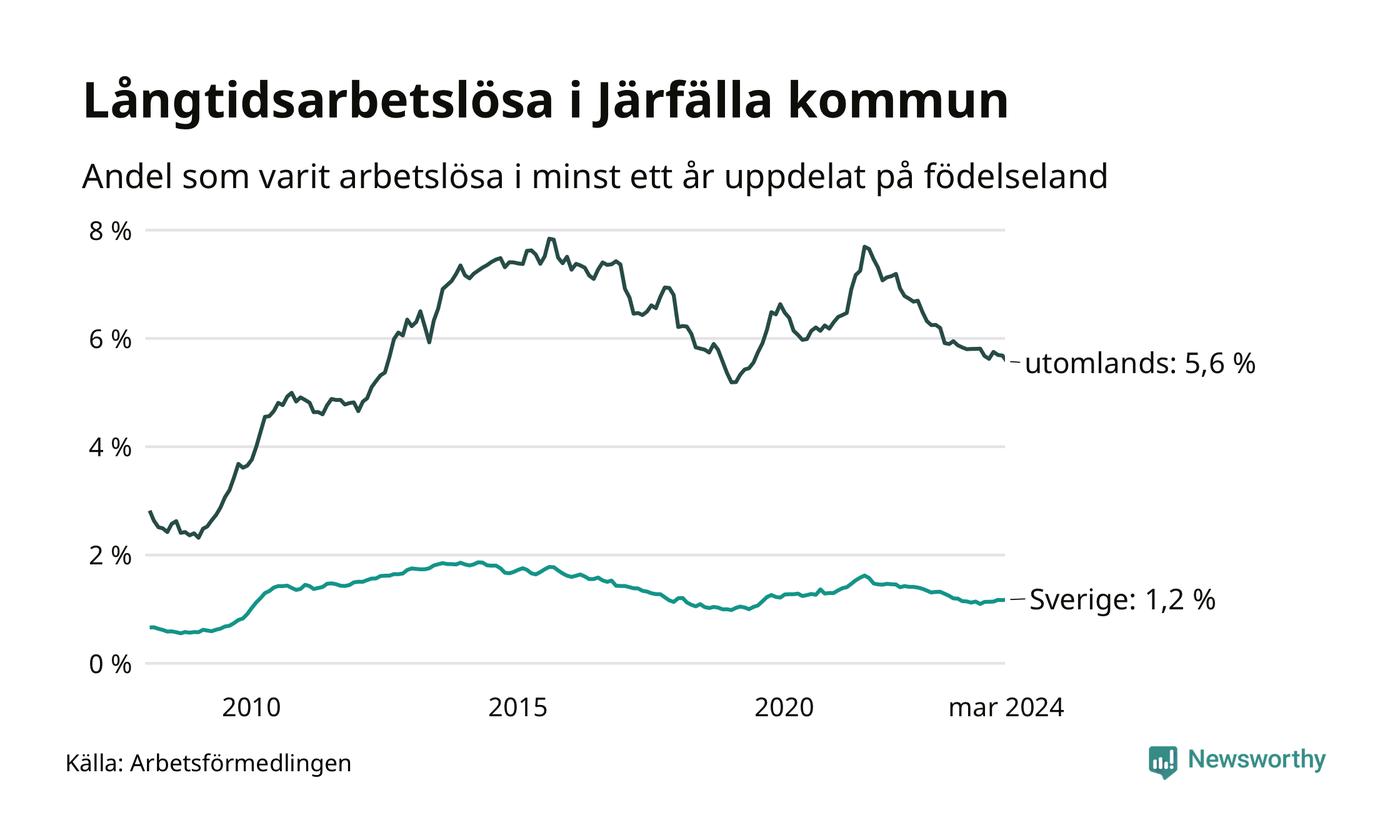 295 av de långtidsarbetslösa i Järfälla är födda i Sverige, medan 1 096 är födda utomlands. Det innebär att långtidsarbetslösheten bland Sverigefödda är 1,2 procent, medan den är fem gånger så hög – 5,6 procent – bland födda utomlands. Även i riket som helhet är arbetslösheten högre bland utrikesfödda.