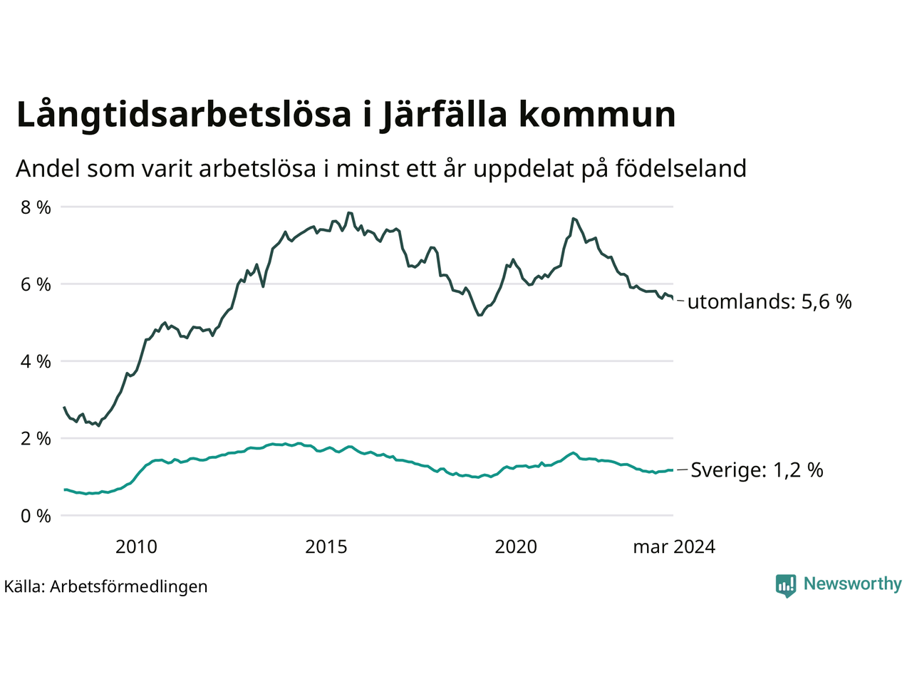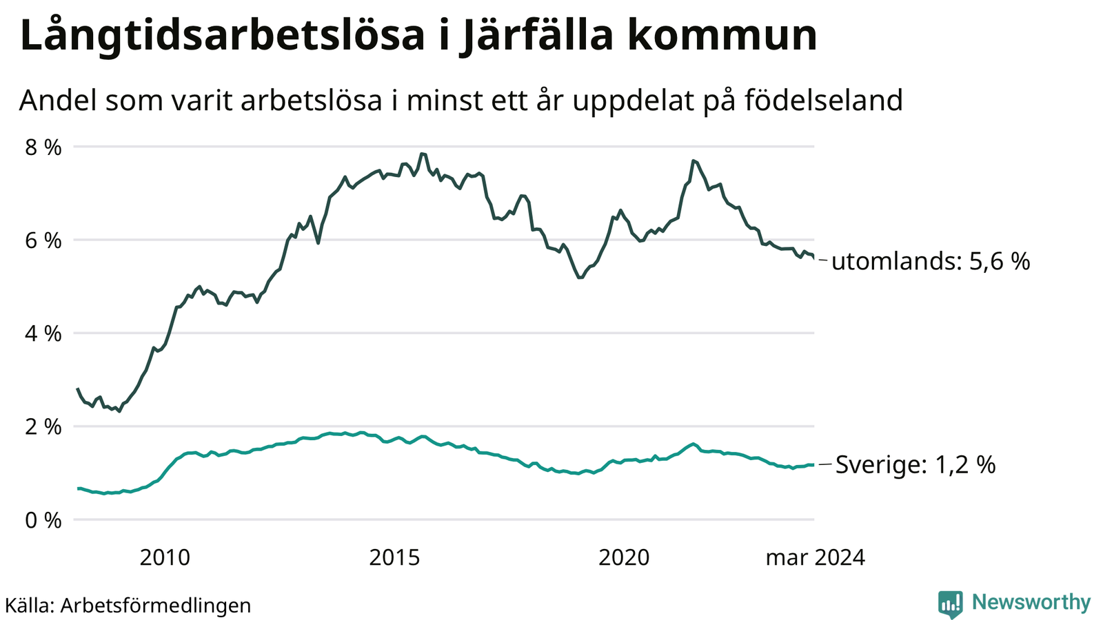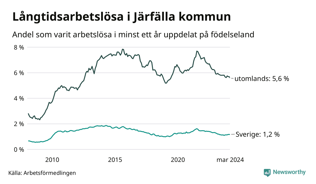 295 av de långtidsarbetslösa i Järfälla är födda i Sverige, medan 1 096 är födda utomlands. Det innebär att långtidsarbetslösheten bland Sverigefödda är 1,2 procent, medan den är fem gånger så hög – 5,6 procent – bland födda utomlands. Även i riket som helhet är arbetslösheten högre bland utrikesfödda.