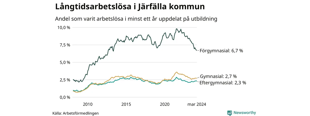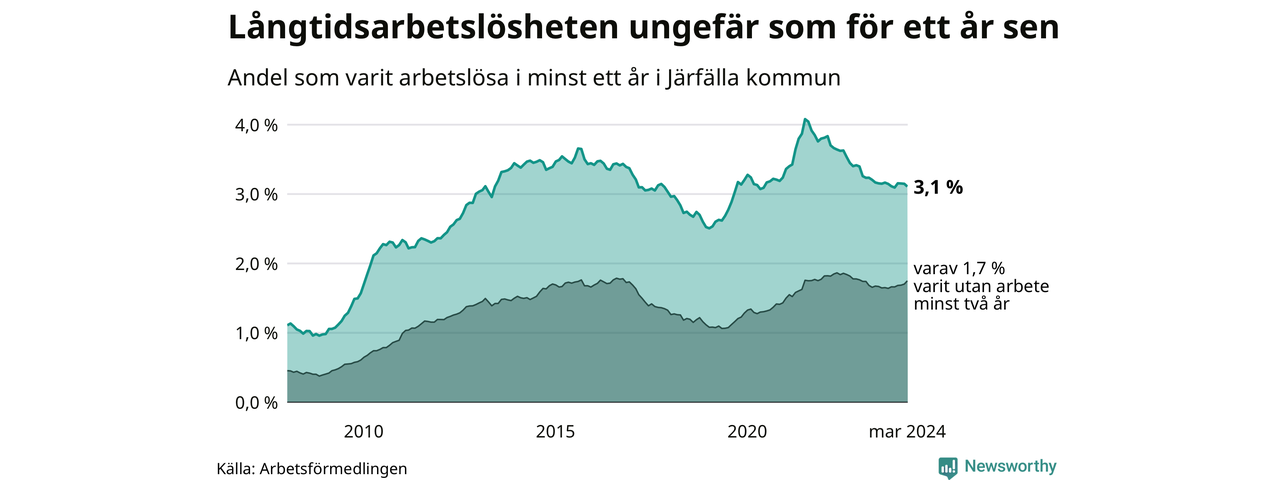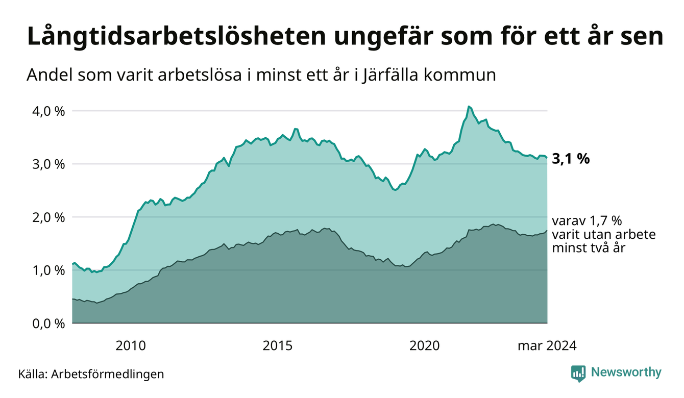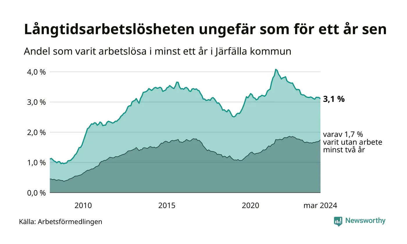 I mars hade 1 391 Järfällabor varit arbetslösa i minst ett år, vilket är 16 färre än månaden innan. 1 391 personer motsvarar 3,1 procent av arbetskraften i kommunen – andelen långtidsarbetslösa är ungefär på samma nivå som för ett år sedan.
