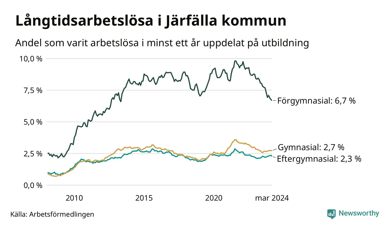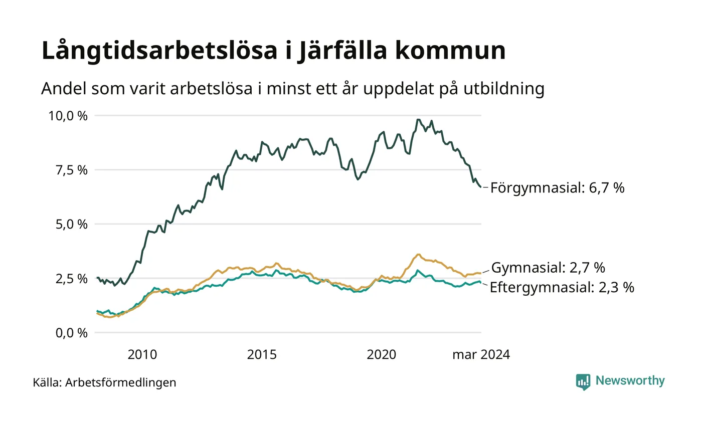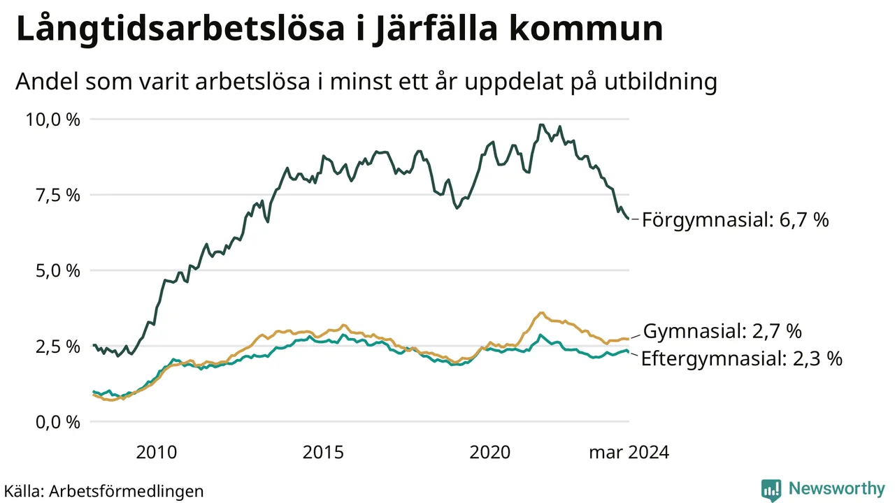 I mars hade 1 391 Järfällabor varit arbetslösa i minst ett år, vilket är 16 färre än månaden innan. 1 391 personer motsvarar 3,1 procent av arbetskraften i kommunen – andelen långtidsarbetslösa är ungefär på samma nivå som för ett år sedan.