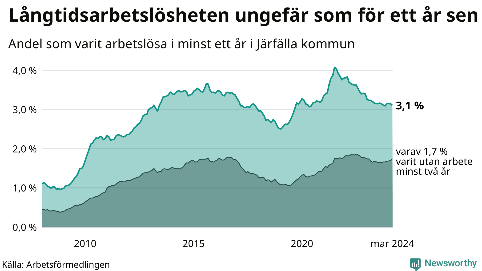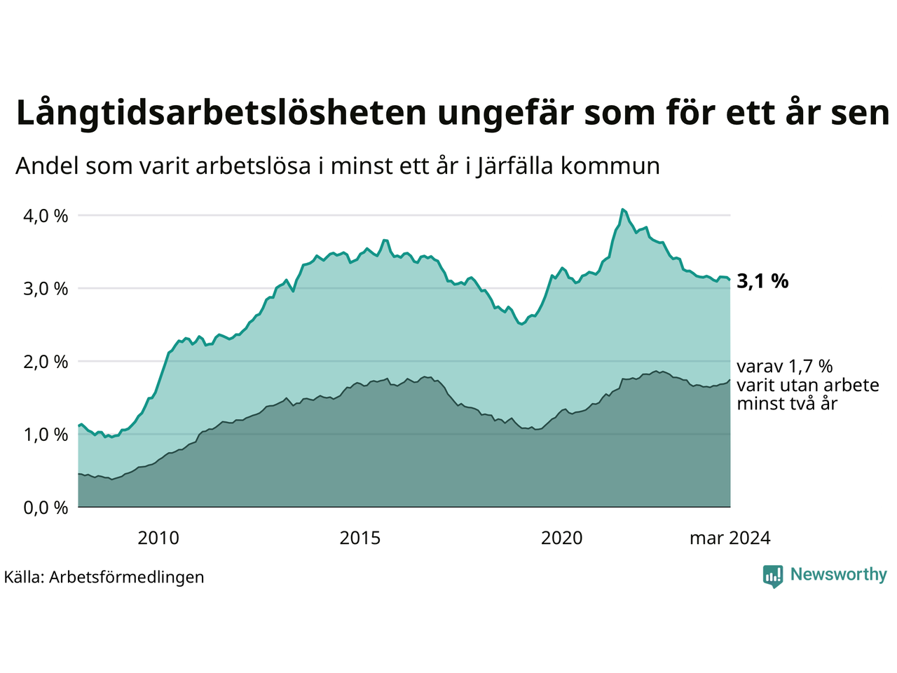 | Andel arbetslösa i minst ett år | 3,1 % | 2,6 % | 2,7 % |