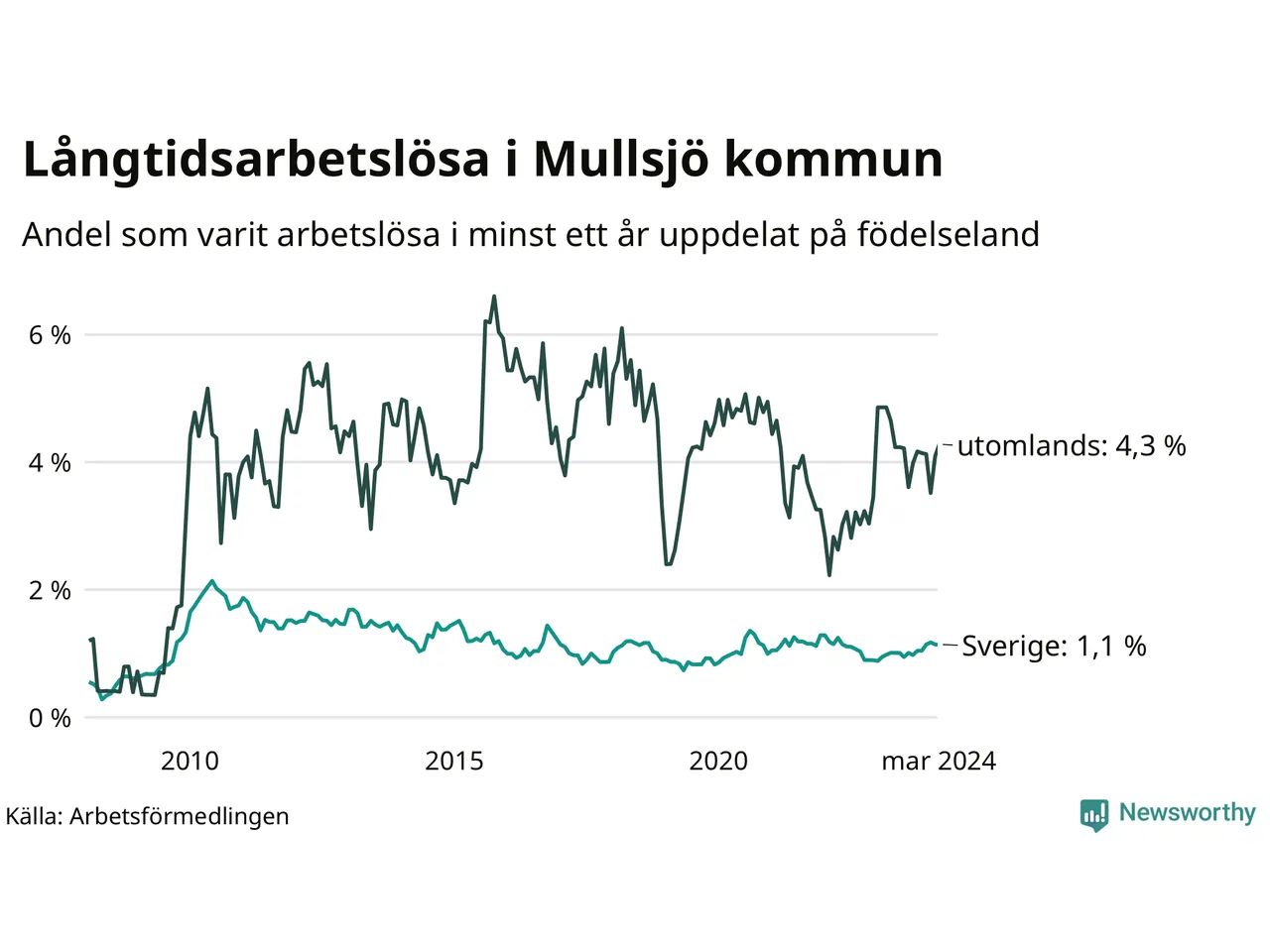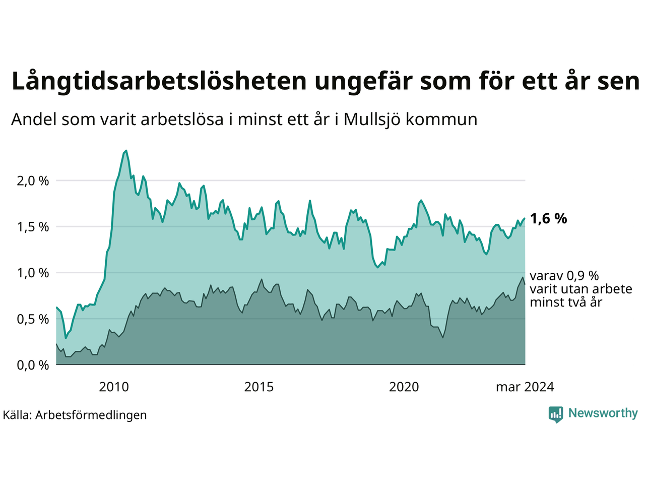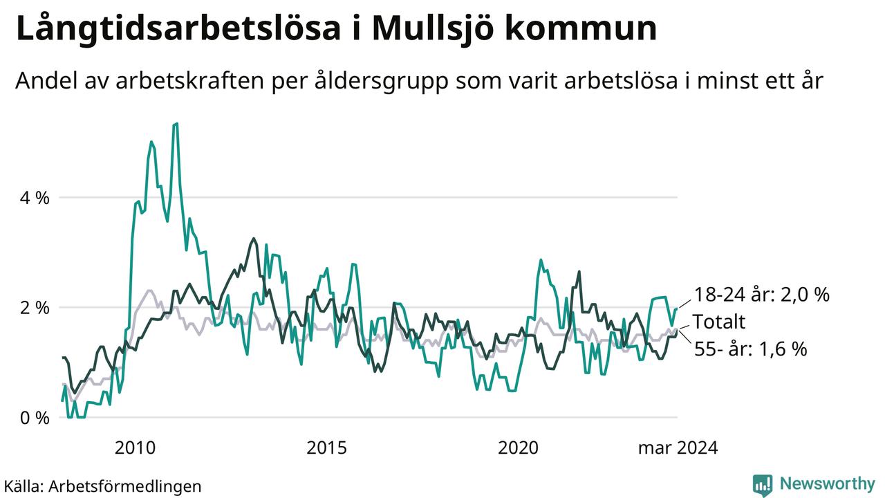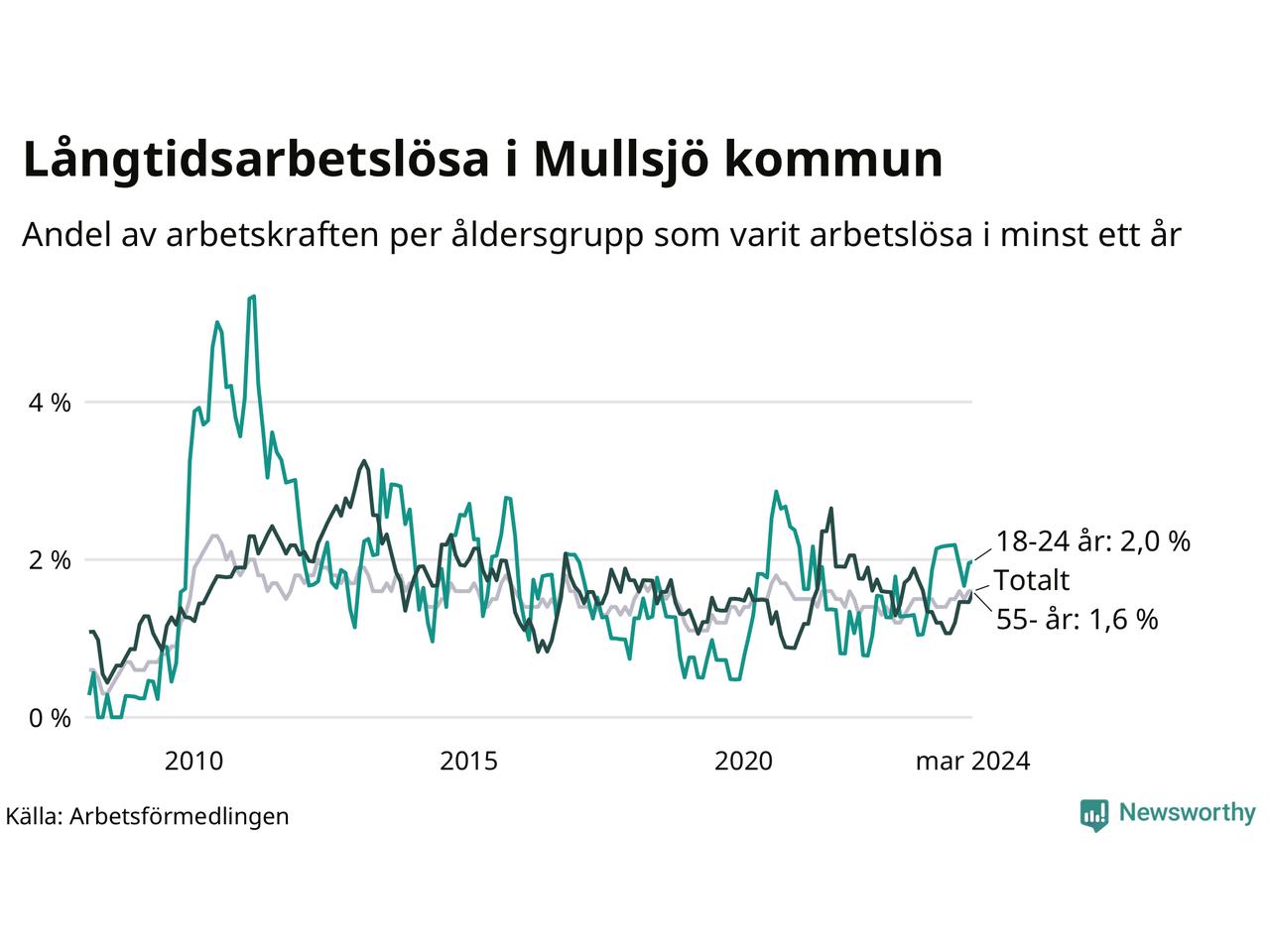 I mars hade 57 Mullsjöbor varit arbetslösa i minst ett år, vilket är en fler än månaden innan. 57 personer motsvarar 1,6 procent av arbetskraften i kommunen – andelen långtidsarbetslösa är ungefär på samma nivå som för ett år sedan.