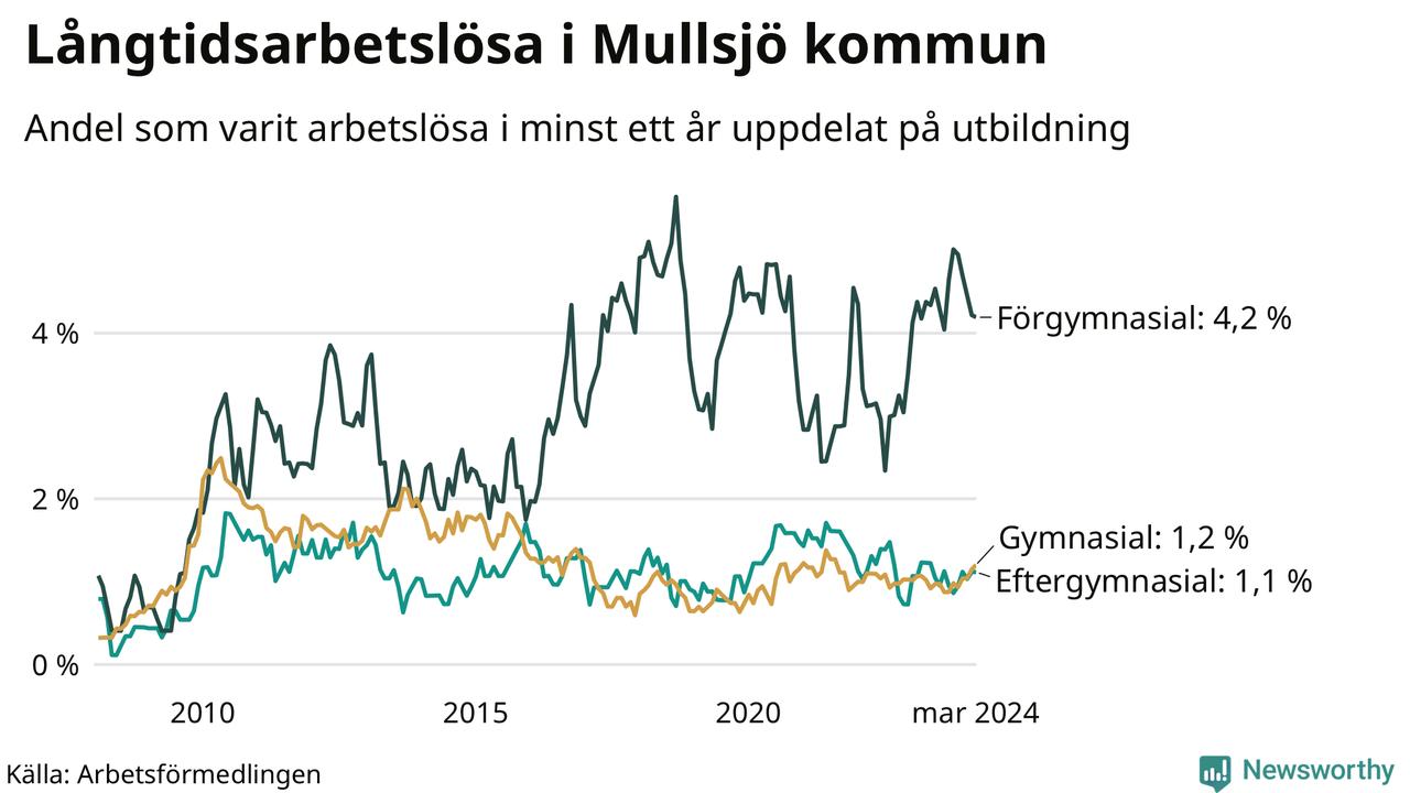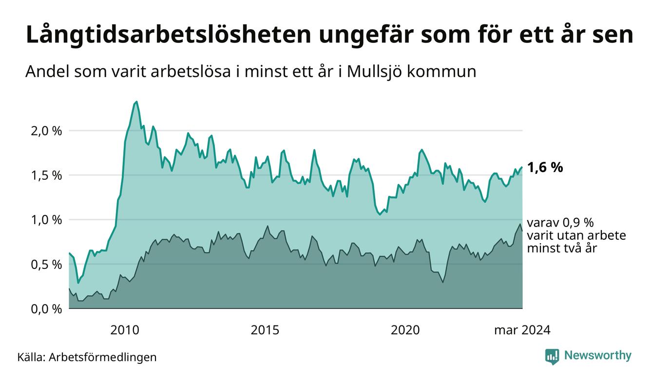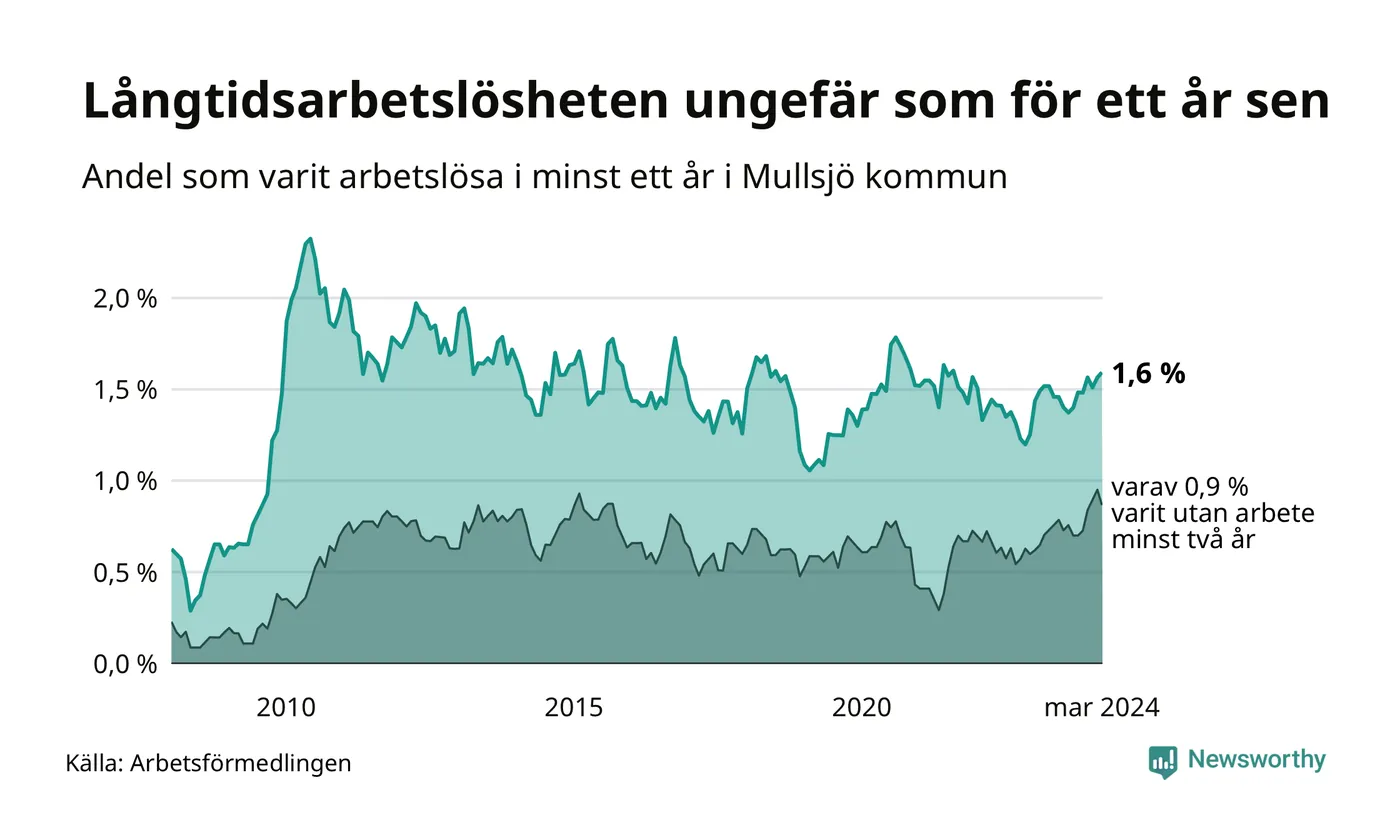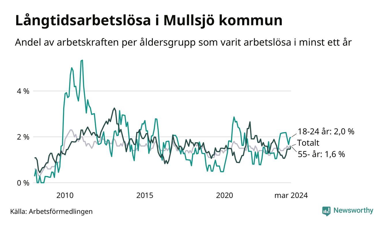 I mars hade 57 Mullsjöbor varit arbetslösa i minst ett år, vilket är en fler än månaden innan. 57 personer motsvarar 1,6 procent av arbetskraften i kommunen – andelen långtidsarbetslösa är ungefär på samma nivå som för ett år sedan.