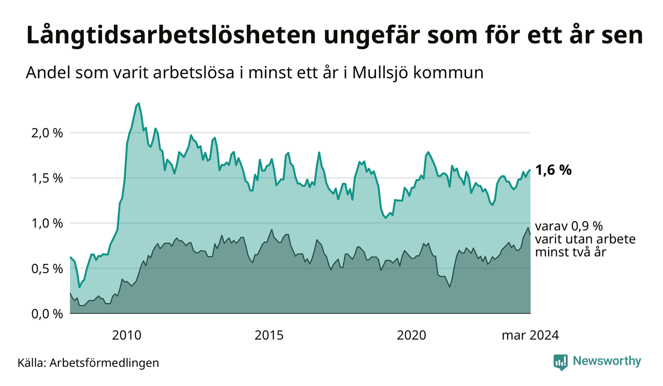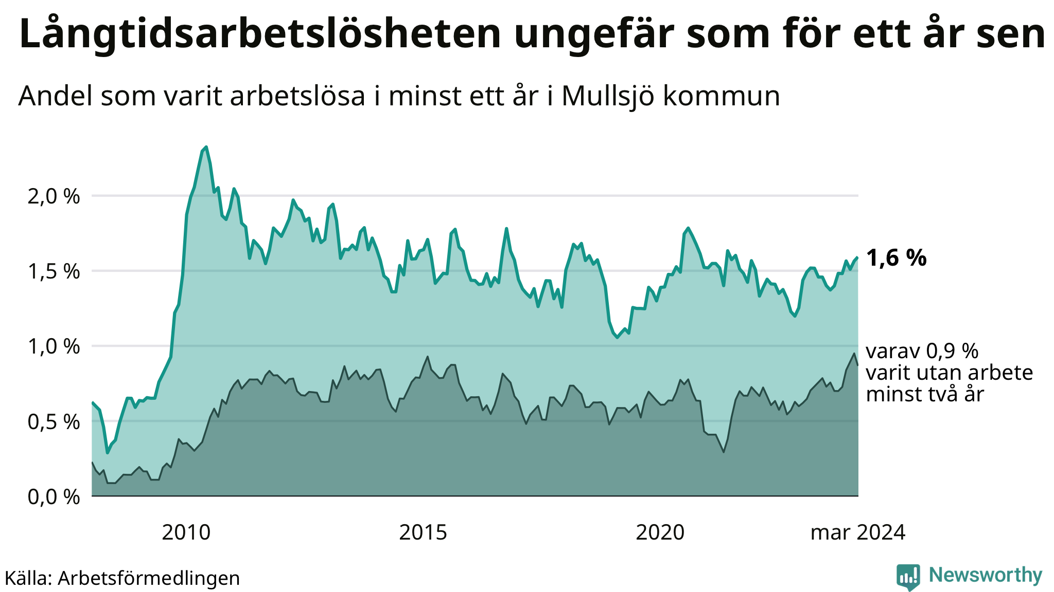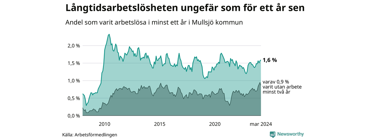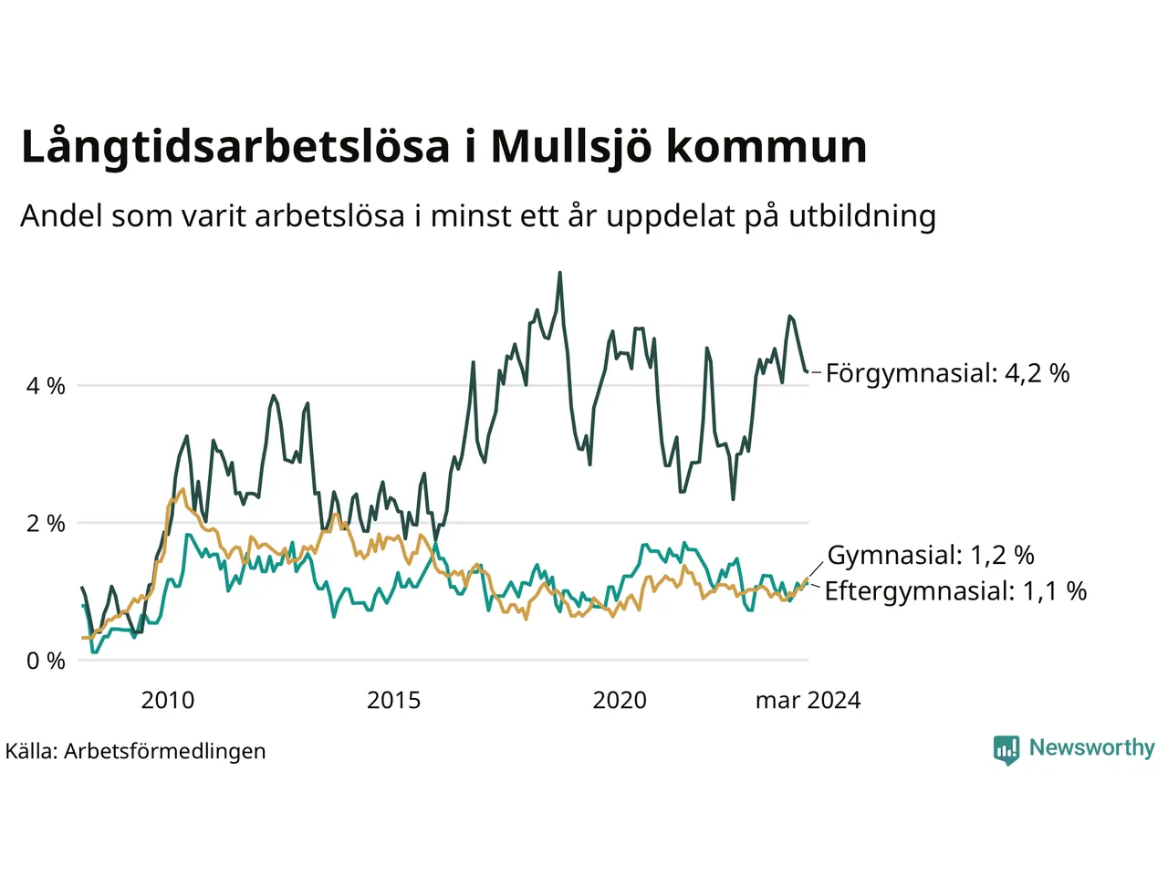 I mars hade 57 Mullsjöbor varit arbetslösa i minst ett år, vilket är en fler än månaden innan. 57 personer motsvarar 1,6 procent av arbetskraften i kommunen – andelen långtidsarbetslösa är ungefär på samma nivå som för ett år sedan.