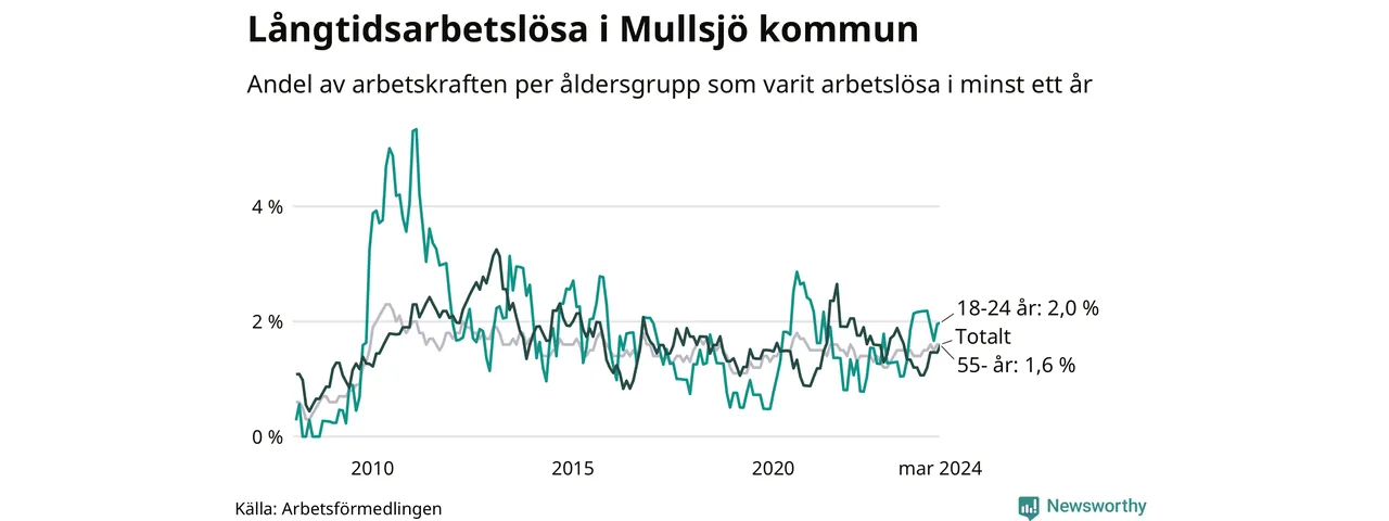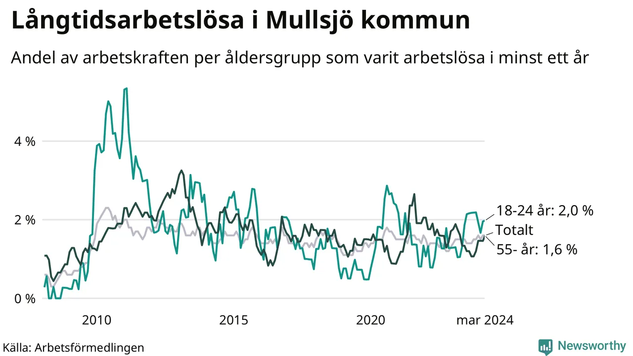 Av de 57 personerna som varit arbetslösa i mer än ett år i Mullsjö kommun är tolv personer mellan 55 och 651 år och sju är mellan 18 och 24 år.