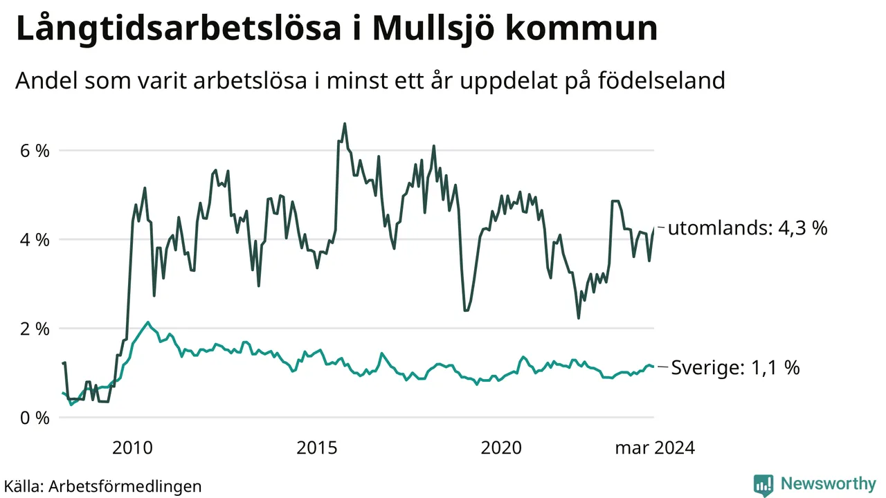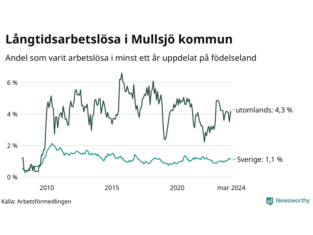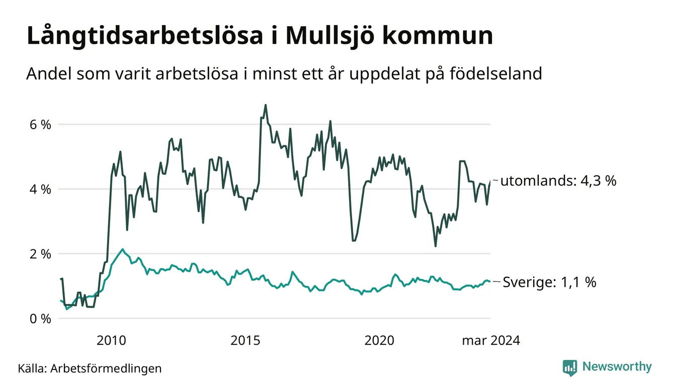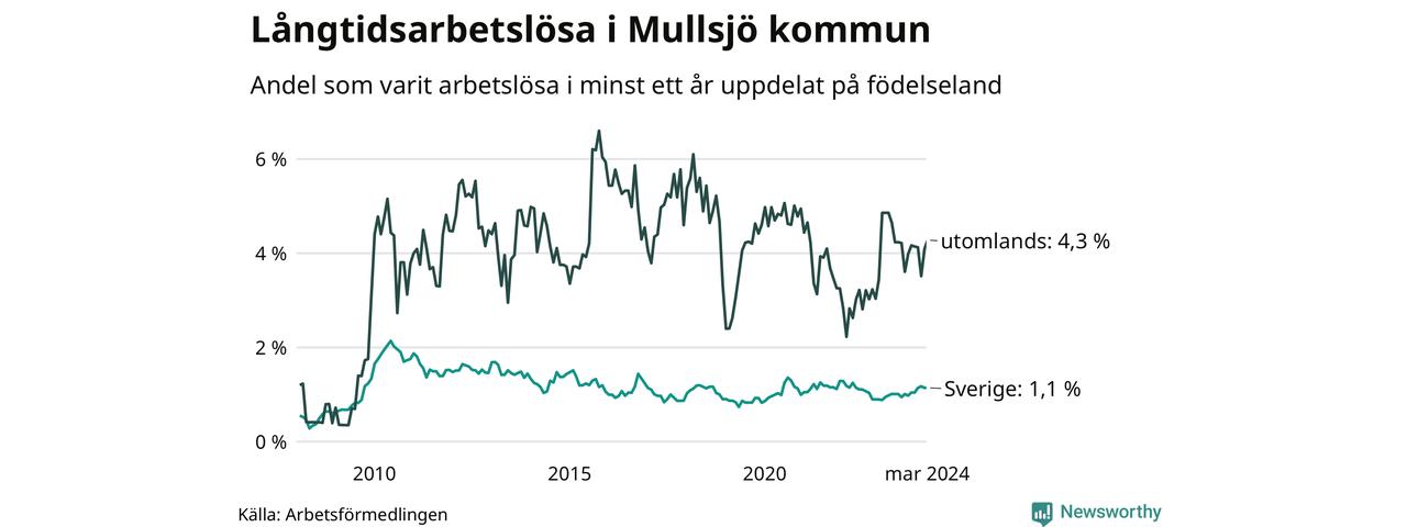 35 av de långtidsarbetslösa i Mullsjö är födda i Sverige, medan 22 är födda utomlands. Det innebär att långtidsarbetslösheten bland Sverigefödda är 1,1 procent, medan den är fyra gånger så hög – 4,3 procent – bland födda utomlands. Även i riket som helhet är arbetslösheten högre bland utrikesfödda.