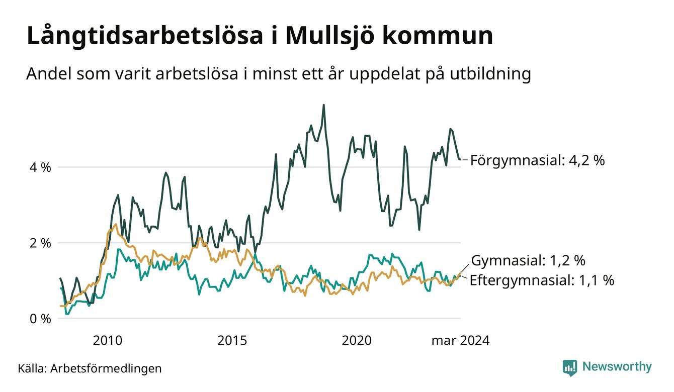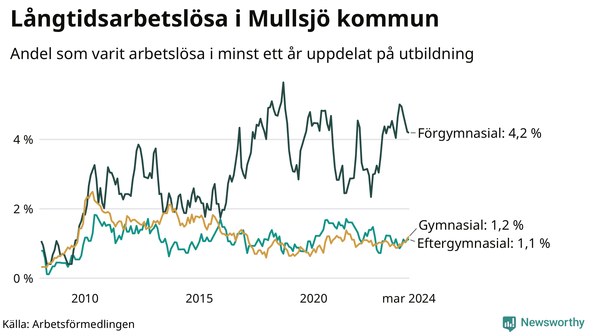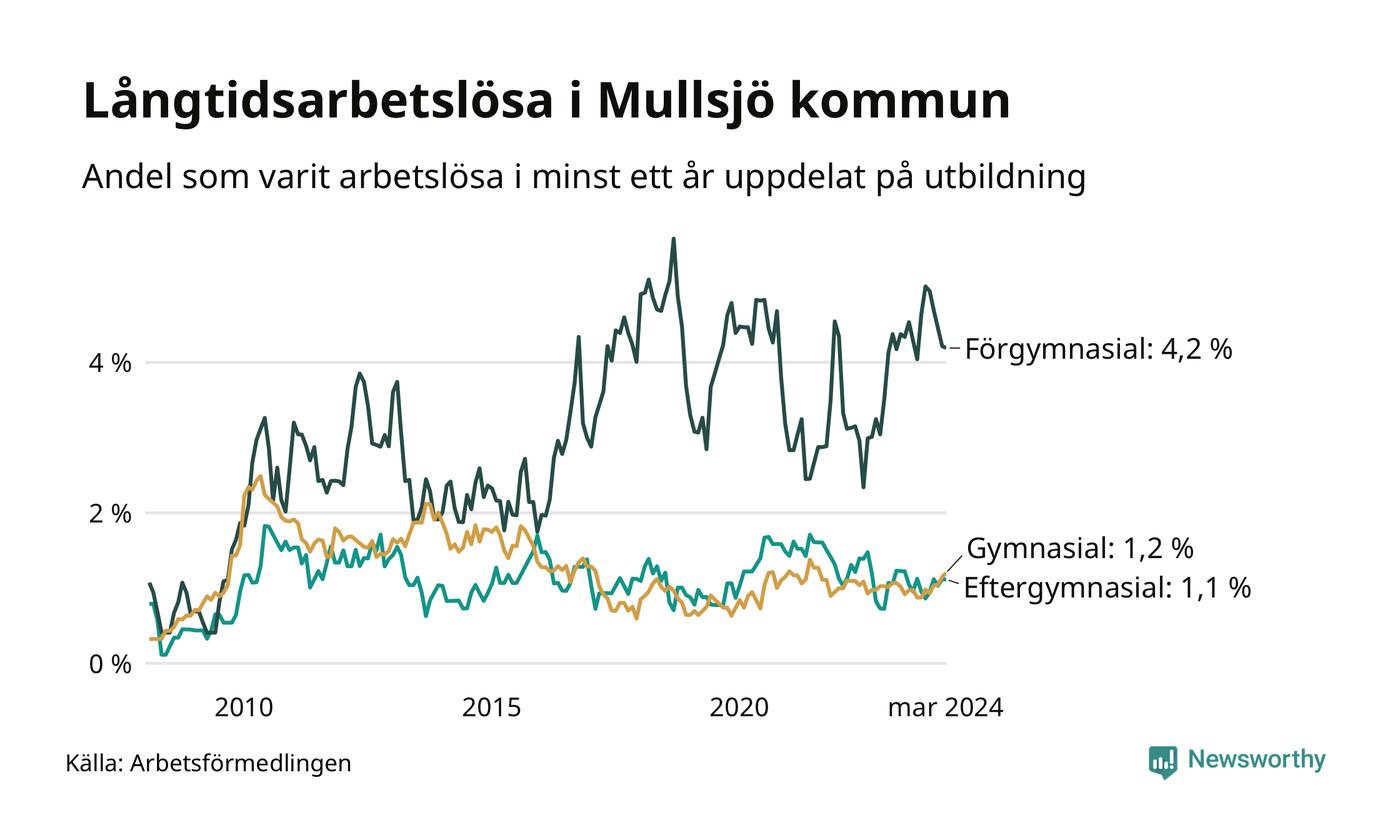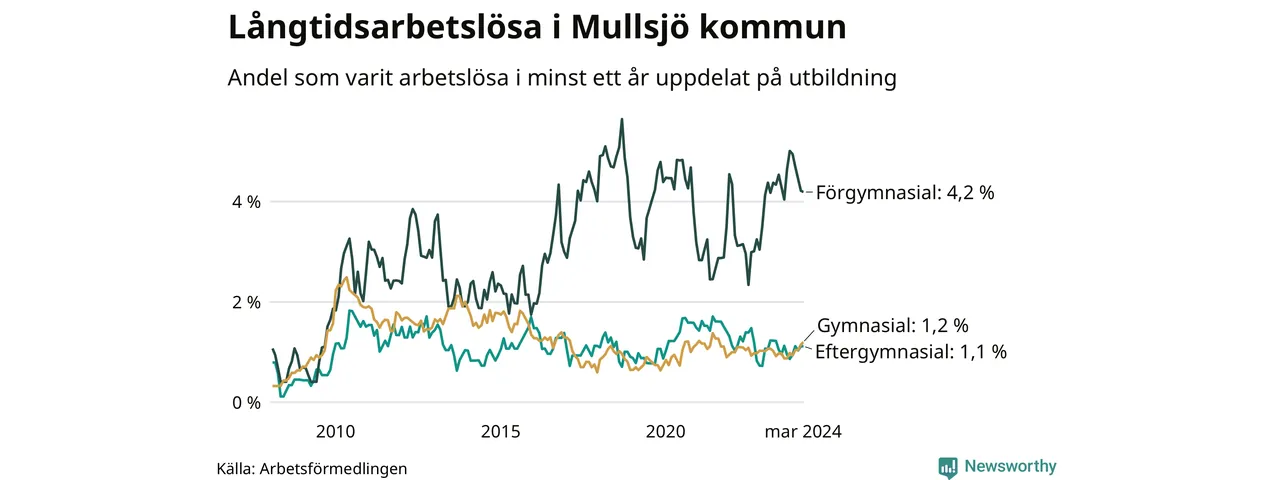Graf över andel långtidsarbetslösa i Mullsjö uppdelat på utbildningsnivå