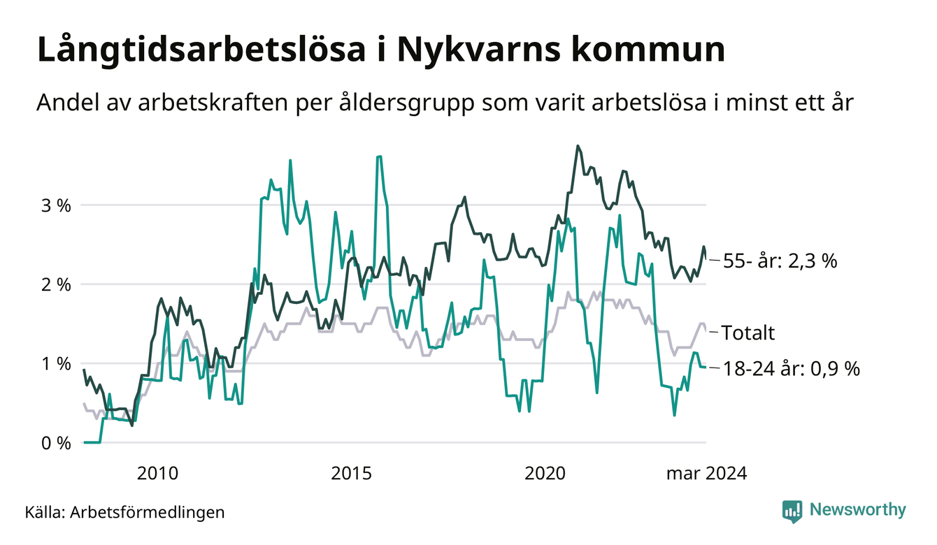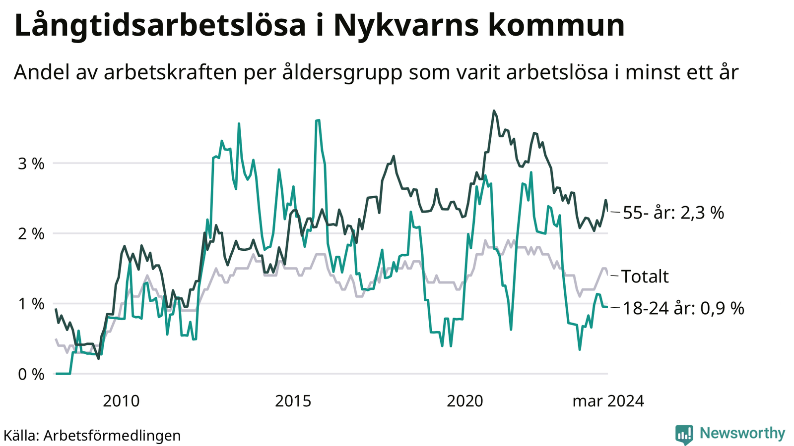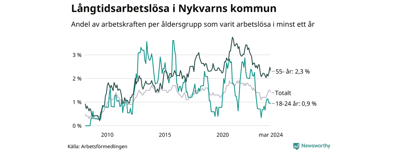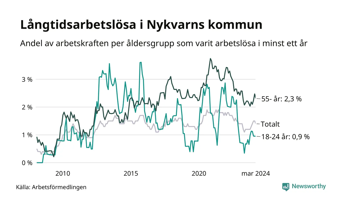 Av de 91 personerna som varit arbetslösa i mer än ett år i Nykvarns kommun är 30 personer mellan 55 och 651 år och sex är mellan 18 och 24 år. För den äldre gruppen är andelen arbetslösa 2,3 procent medan den i den yngre gruppen är 0,9 procent. Även i riket som helhet är långtidsarbetslösheten högre i gruppen äldre.