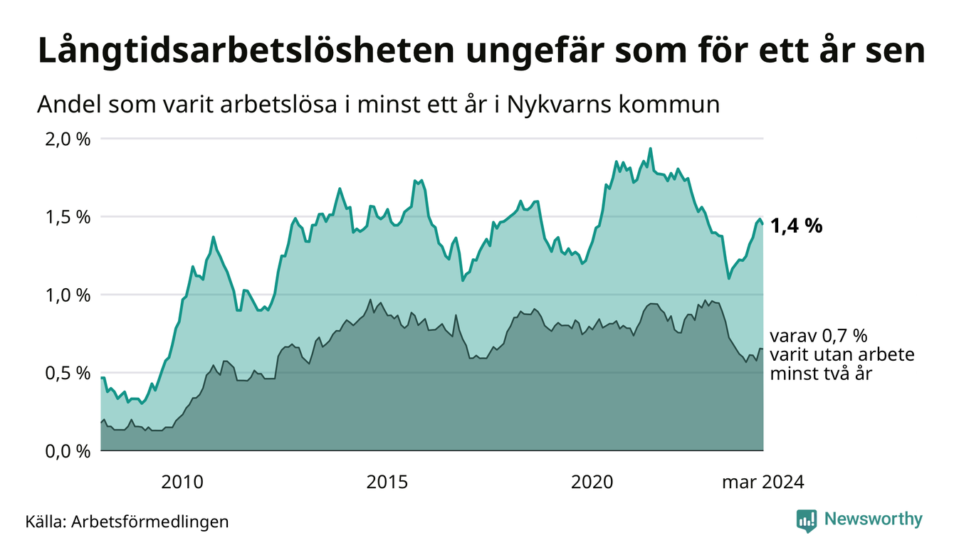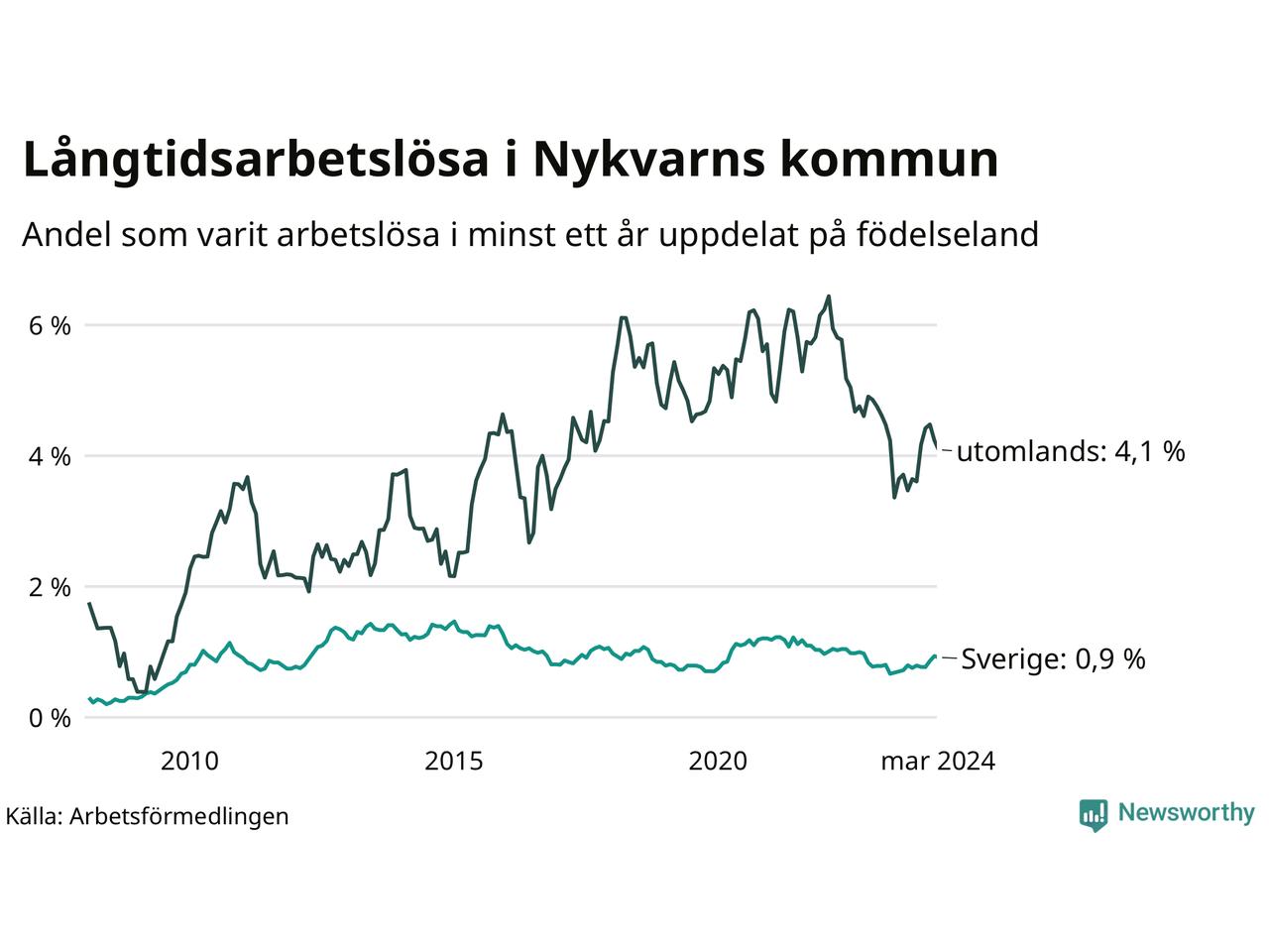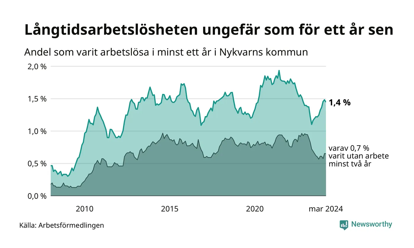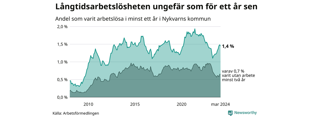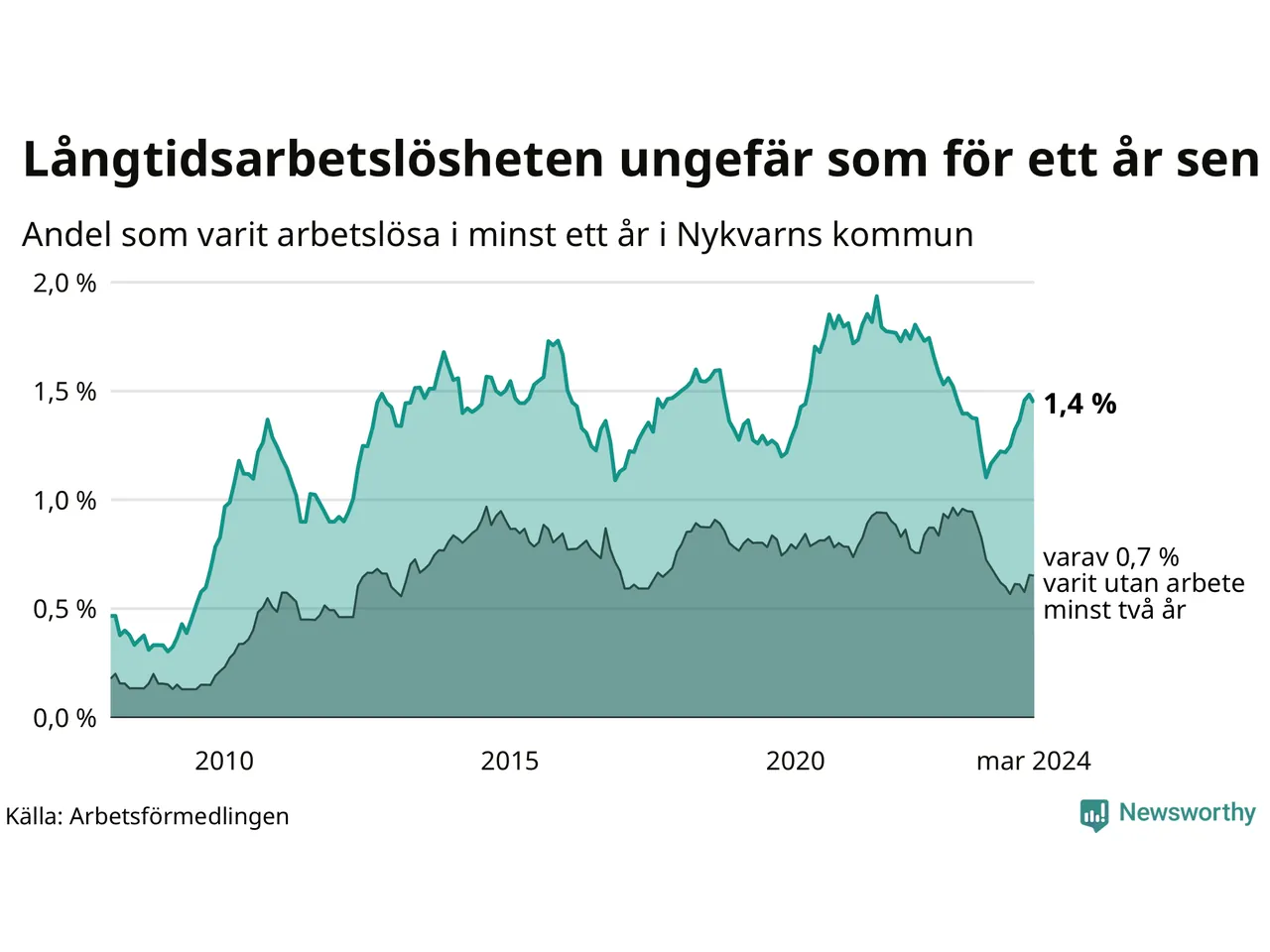 I mars hade 91 Nykvarnsbor varit arbetslösa i minst ett år, vilket är två färre än månaden innan. Det är den första månaden sedan maj 2023 som antalet arbetslösa minskar. 91 personer motsvarar 1,4 procent av arbetskraften i kommunen – andelen långtidsarbetslösa är ungefär på samma nivå som för ett år sedan.