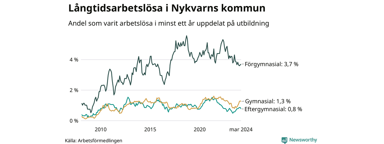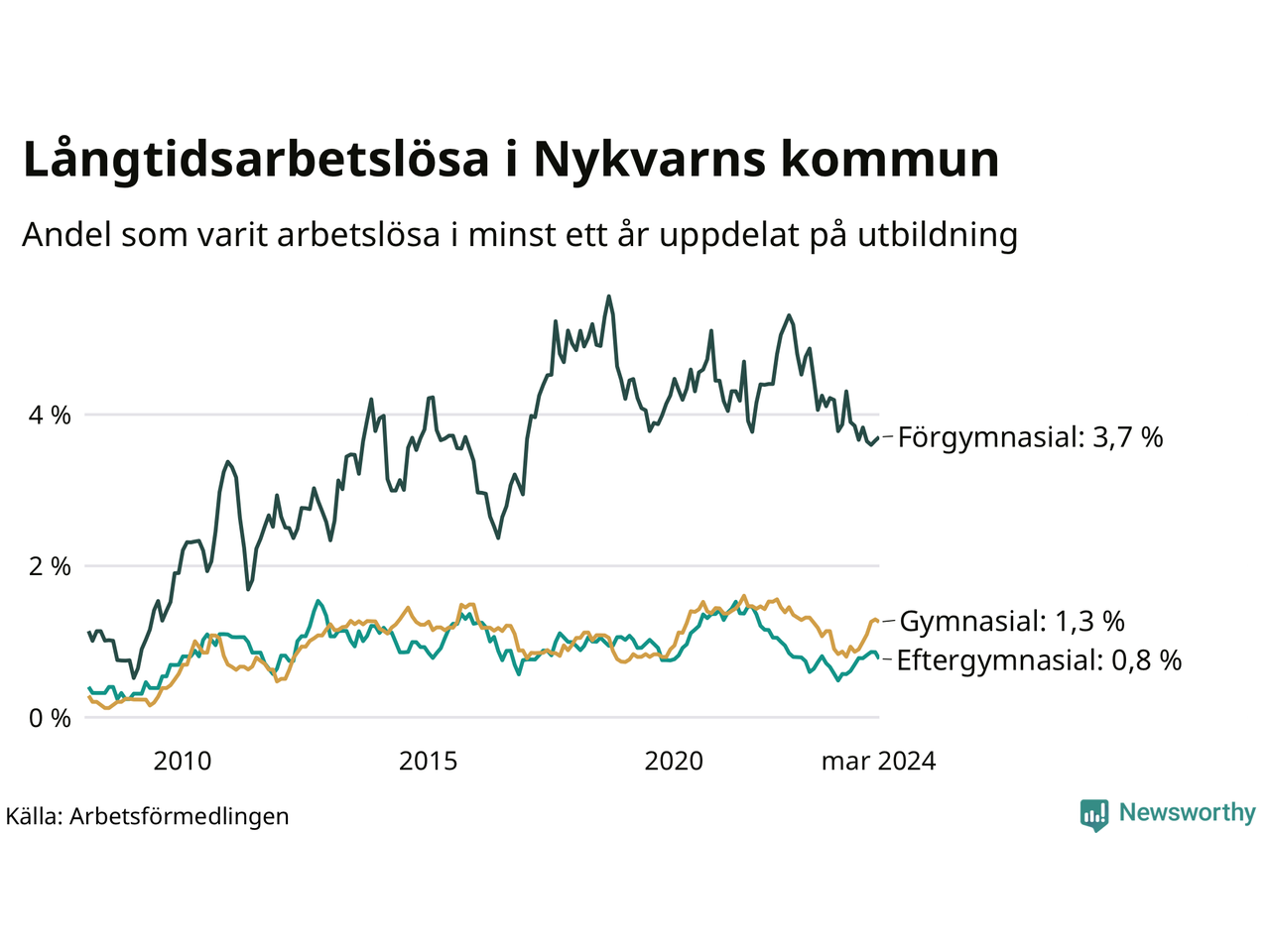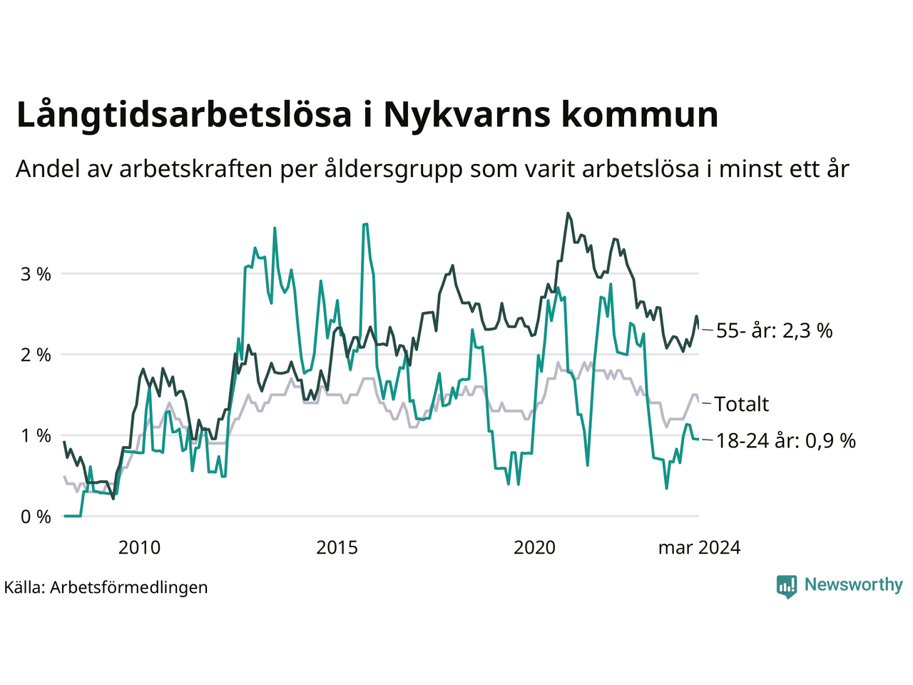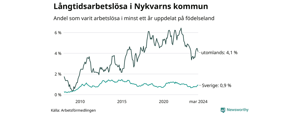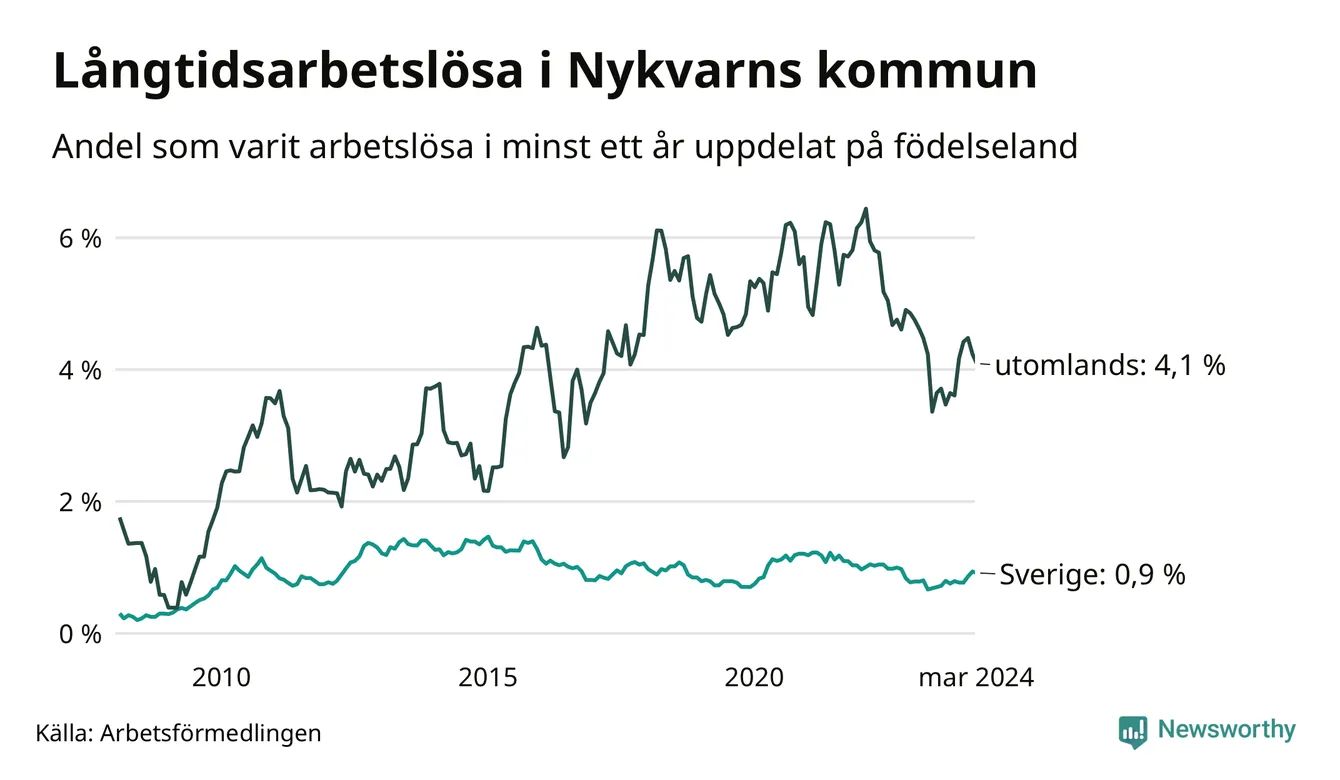 I mars hade 91 Nykvarnsbor varit arbetslösa i minst ett år, vilket är två färre än månaden innan. Det är den första månaden sedan maj 2023 som antalet arbetslösa minskar. 91 personer motsvarar 1,4 procent av arbetskraften i kommunen – andelen långtidsarbetslösa är ungefär på samma nivå som för ett år sedan.