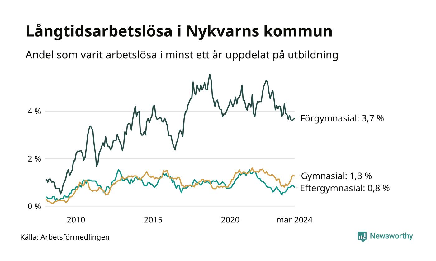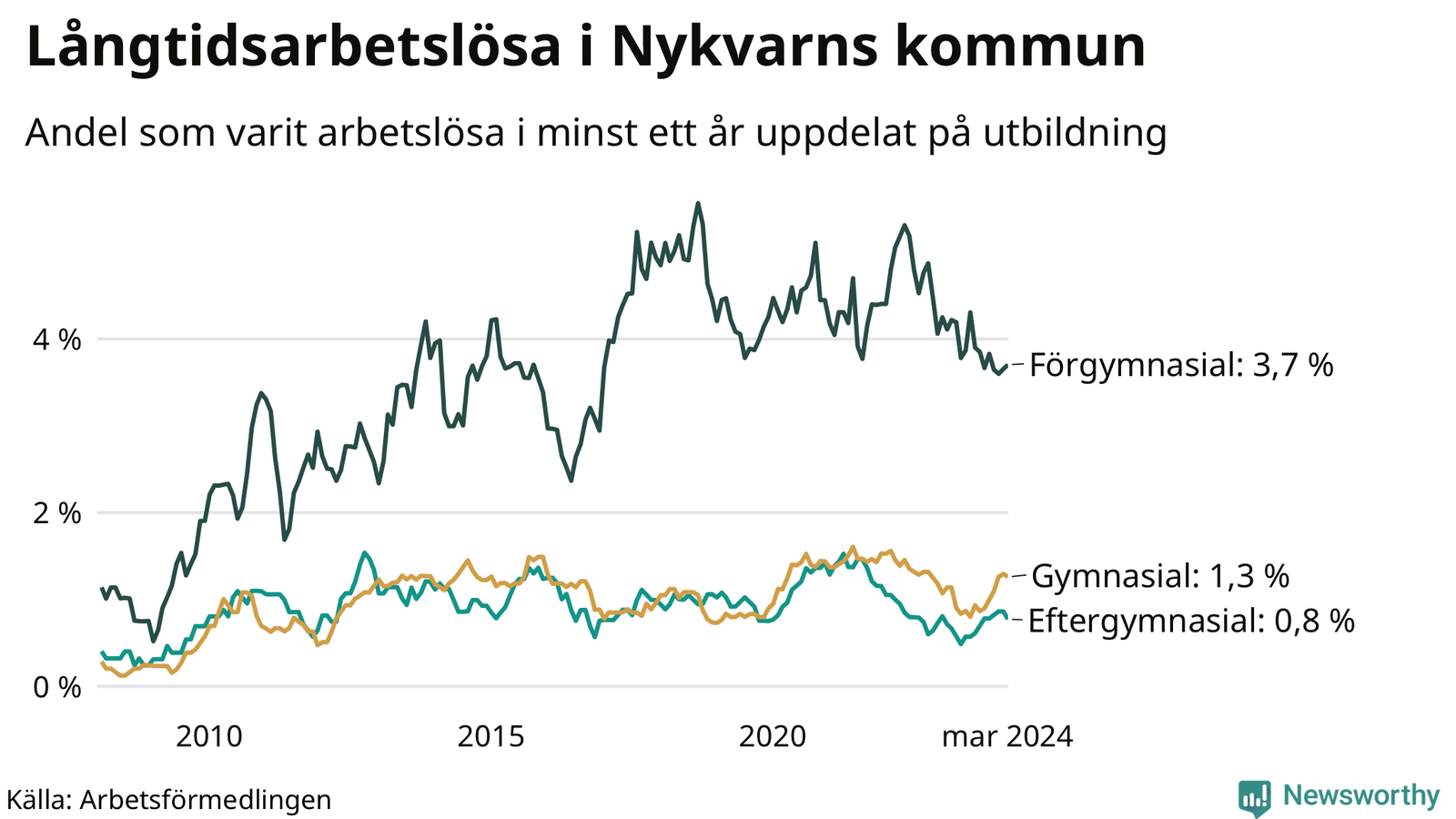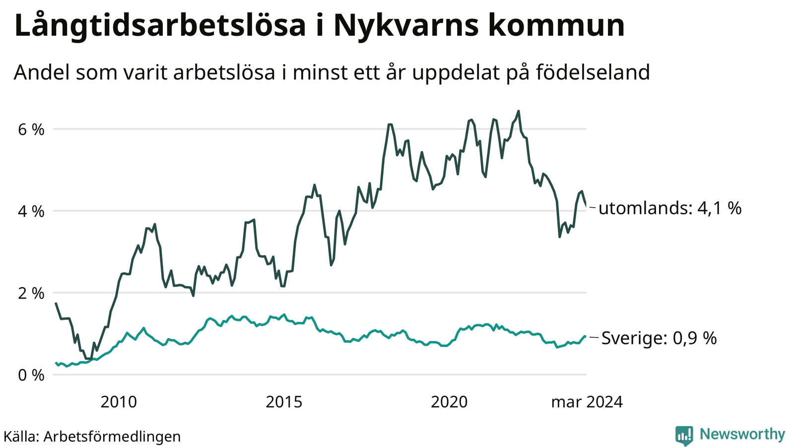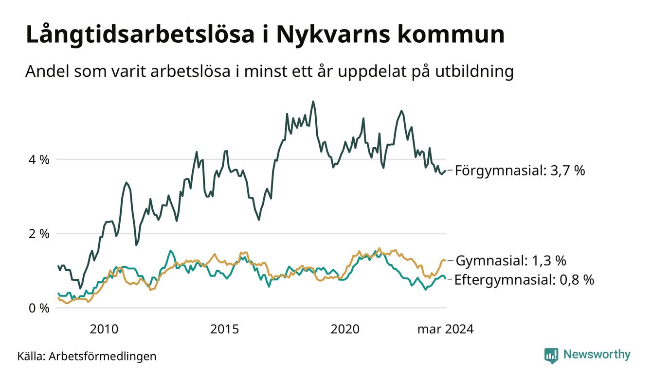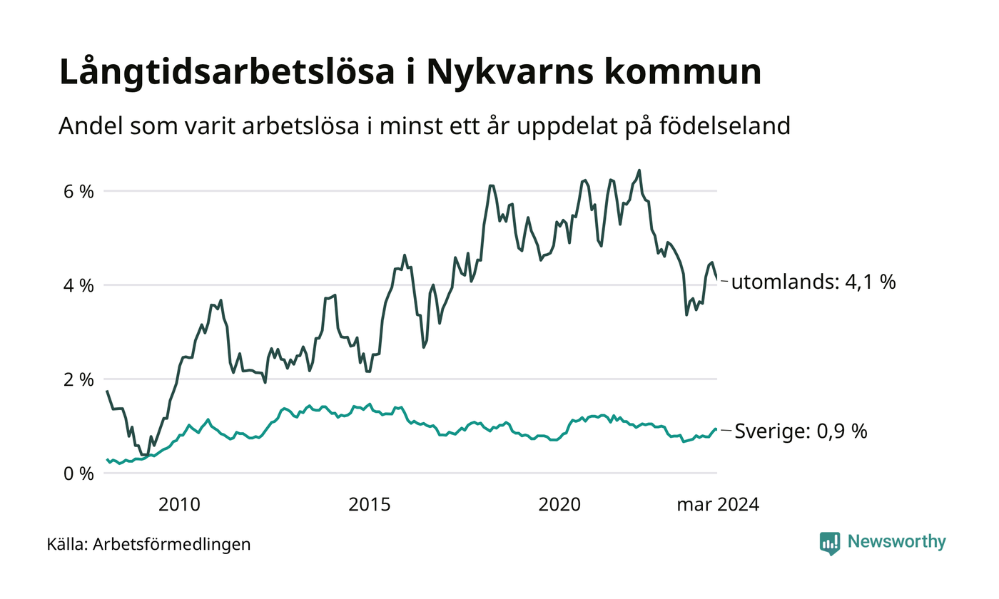 I mars hade 91 Nykvarnsbor varit arbetslösa i minst ett år, vilket är två färre än månaden innan. Det är den första månaden sedan maj 2023 som antalet arbetslösa minskar. 91 personer motsvarar 1,4 procent av arbetskraften i kommunen – andelen långtidsarbetslösa är ungefär på samma nivå som för ett år sedan.