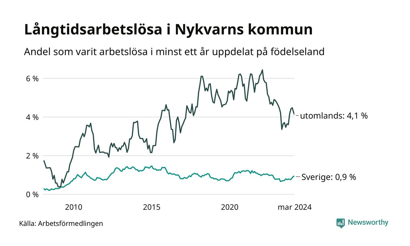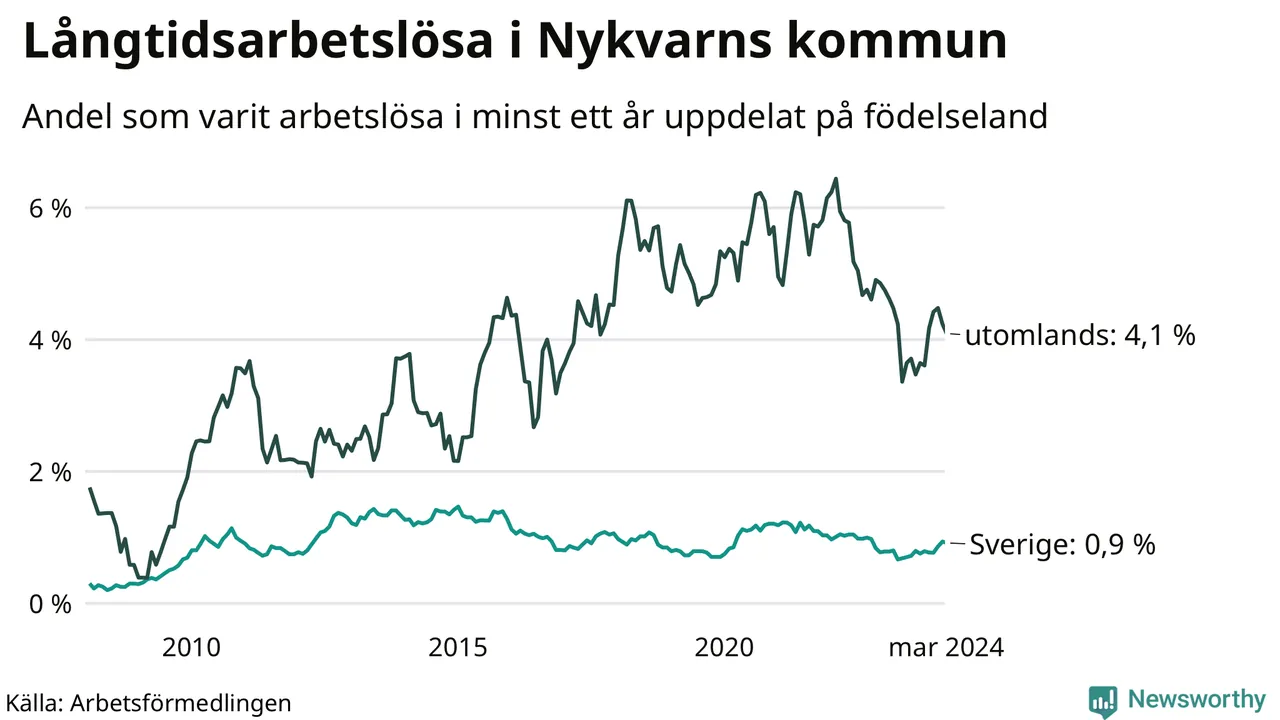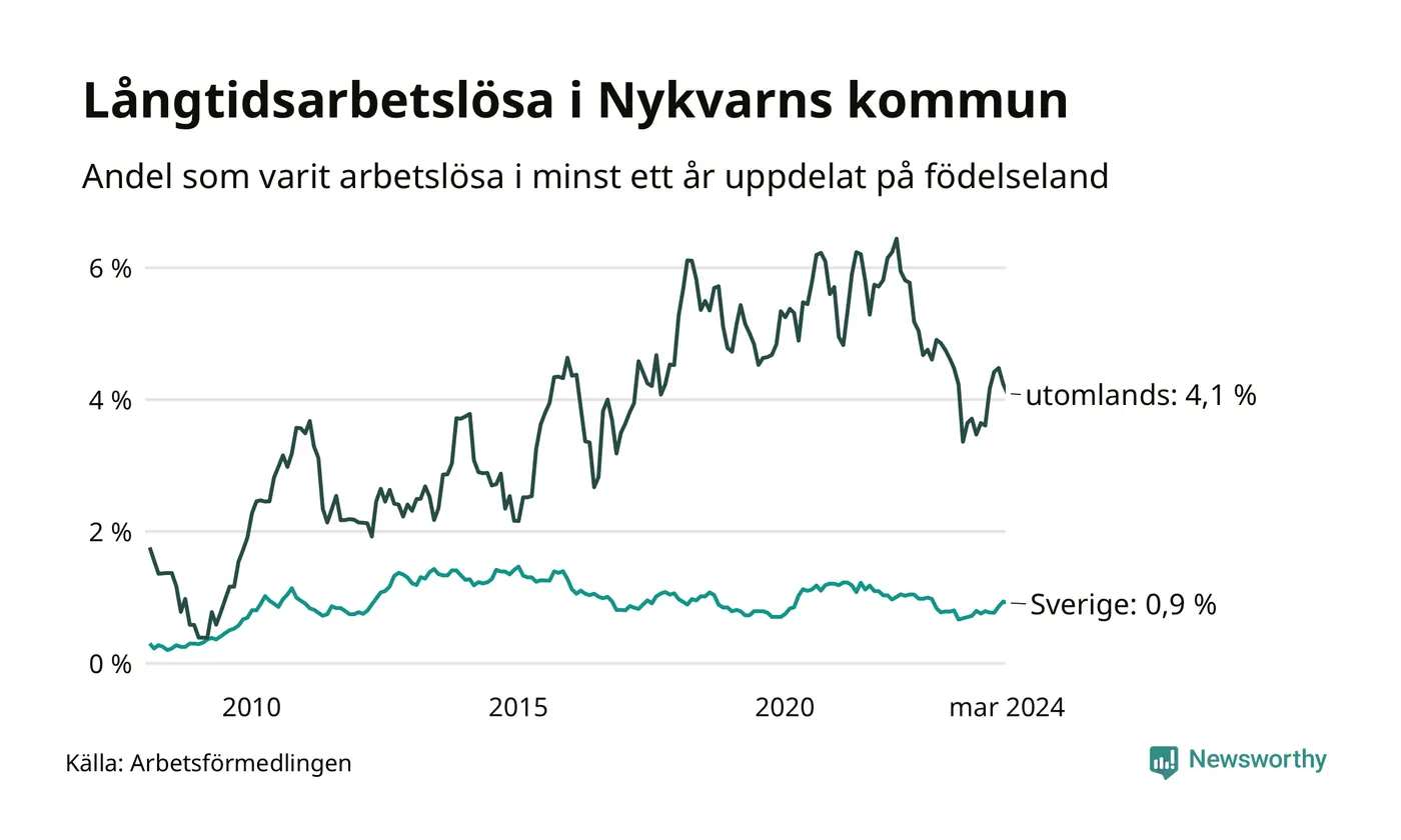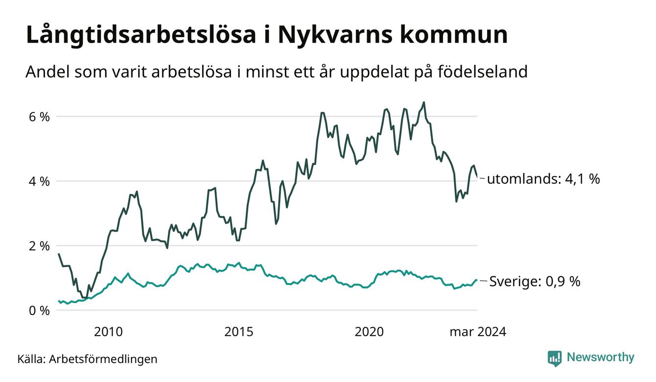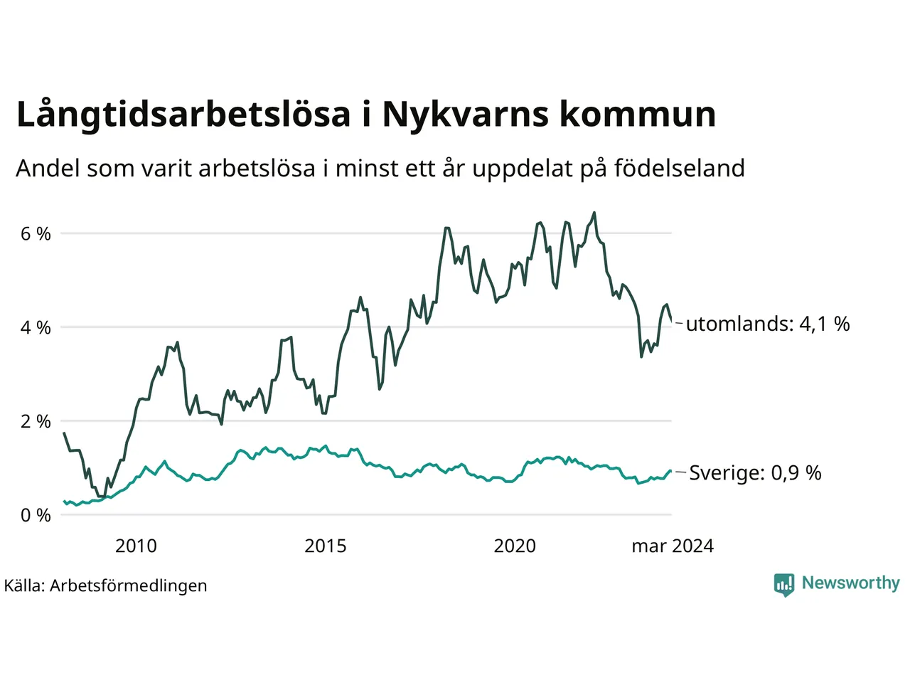 48 av de långtidsarbetslösa i Nykvarn är födda i Sverige, medan 43 är födda utomlands. Det innebär att långtidsarbetslösheten bland Sverigefödda är 0,9 procent, medan den är fem gånger så hög – 4,1 procent – bland födda utomlands. Även i riket som helhet är arbetslösheten högre bland utrikesfödda.