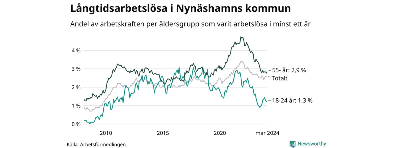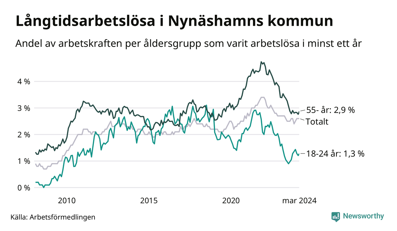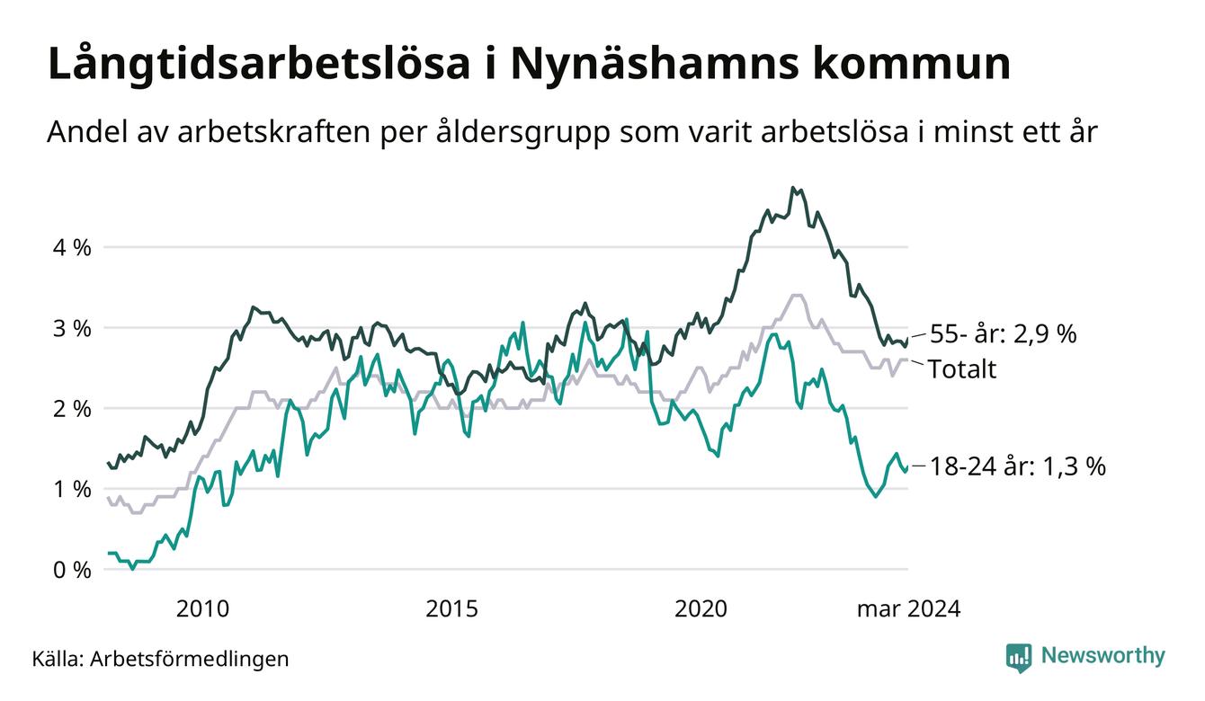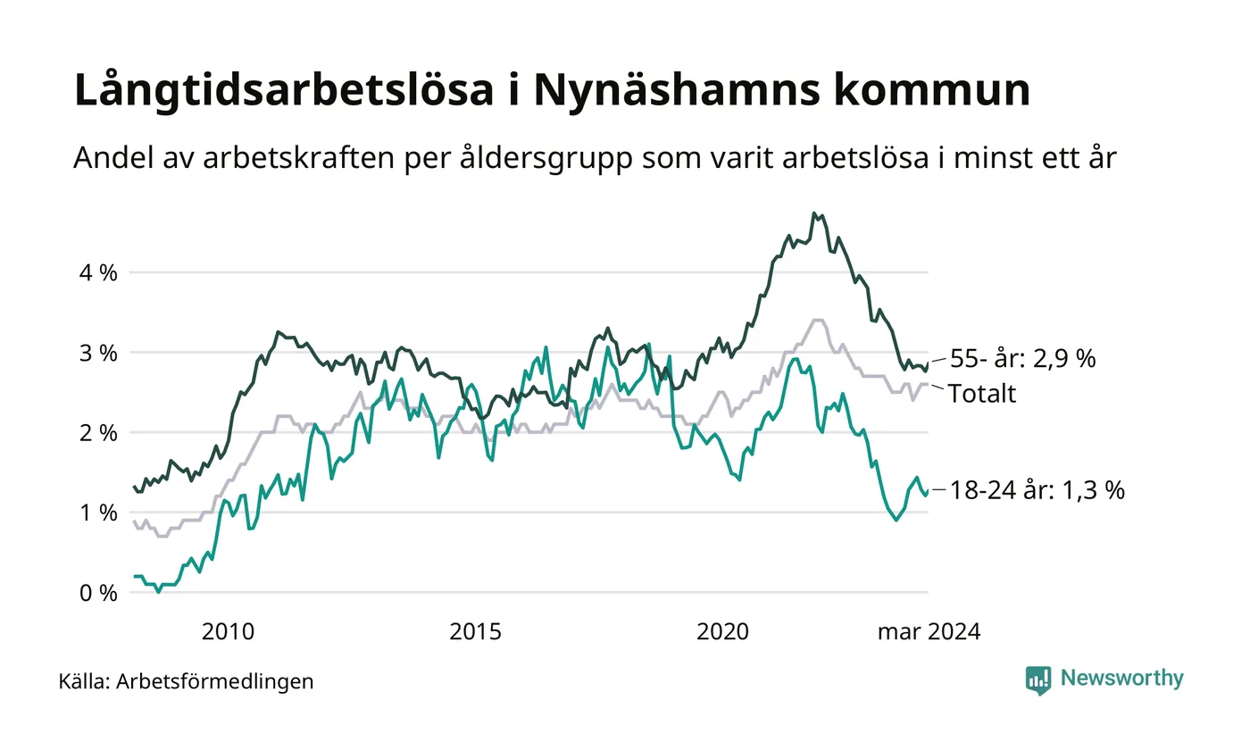 Av de 371 personerna som varit arbetslösa i mer än ett år i Nynäshamns kommun är 95 personer mellan 55 och 651 år och 17 är mellan 18 och 24 år. För den äldre gruppen är andelen arbetslösa 2,9 procent medan den i den yngre gruppen är 1,3 procent. Även i riket som helhet är långtidsarbetslösheten högre i gruppen äldre.