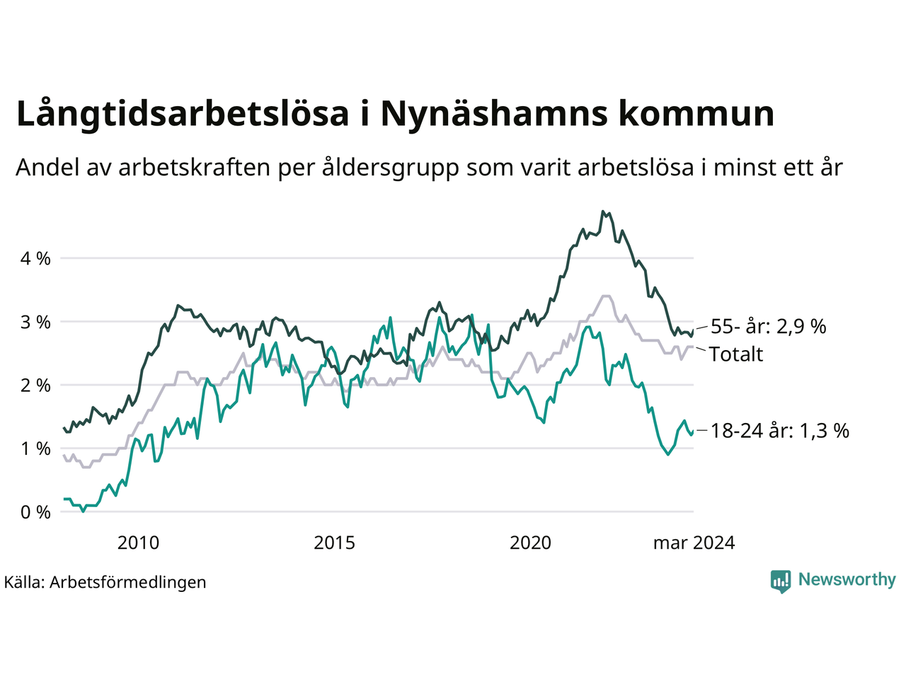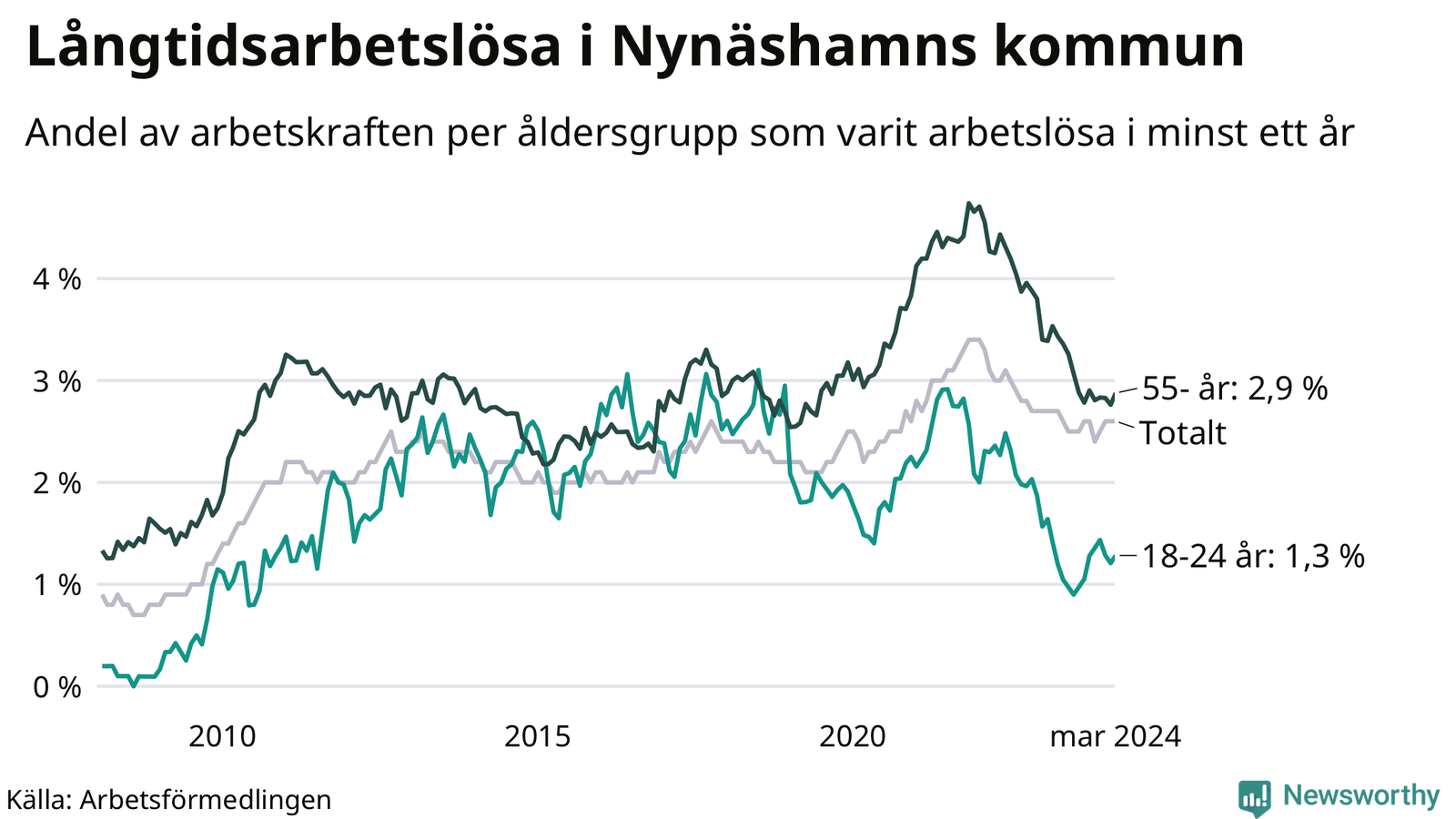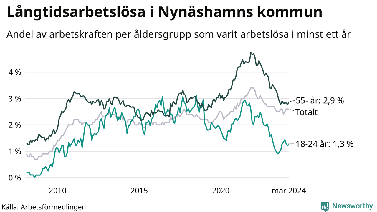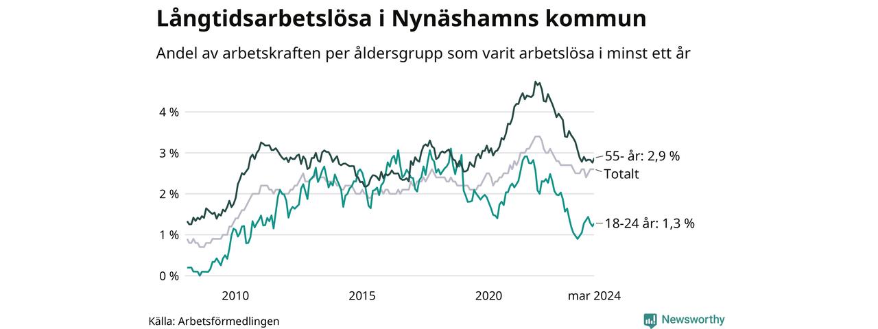 Av de 371 personerna som varit arbetslösa i mer än ett år i Nynäshamns kommun är 95 personer mellan 55 och 651 år och 17 är mellan 18 och 24 år. För den äldre gruppen är andelen arbetslösa 2,9 procent medan den i den yngre gruppen är 1,3 procent. Även i riket som helhet är långtidsarbetslösheten högre i gruppen äldre.
