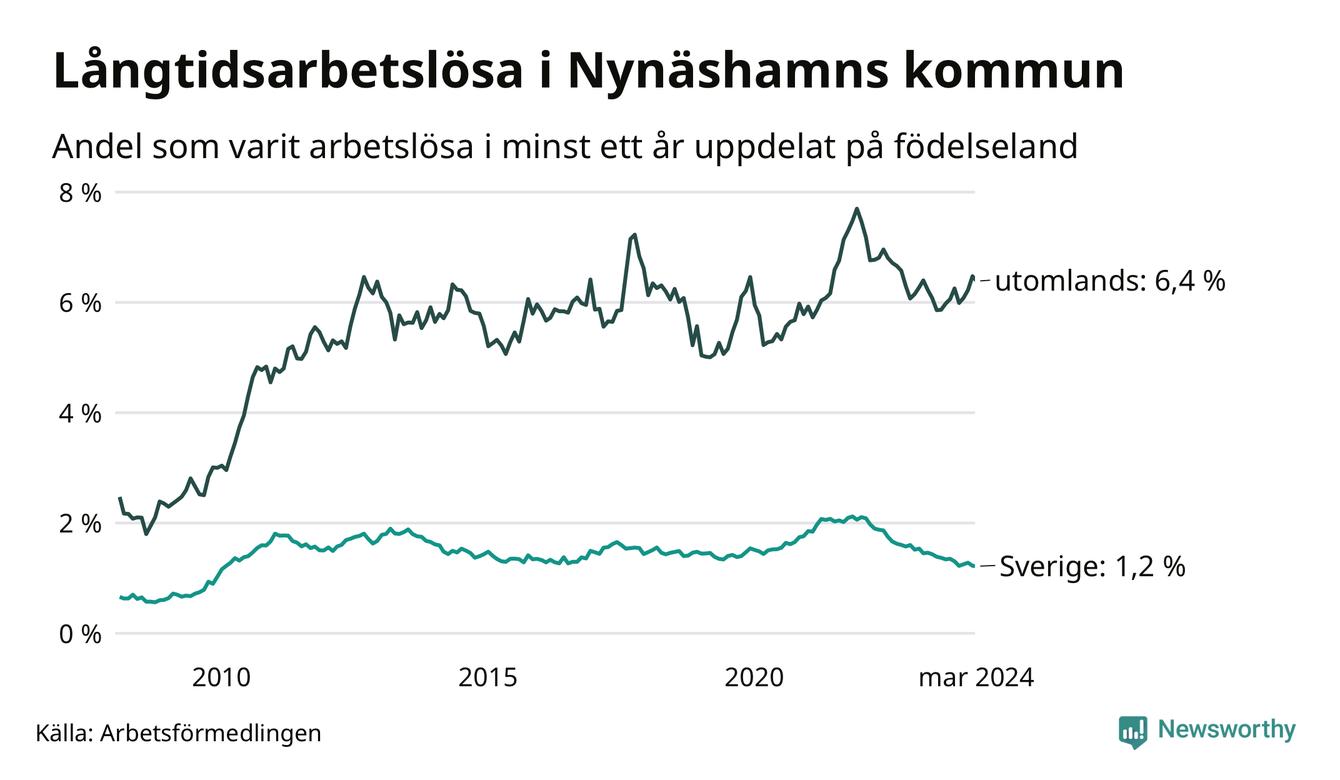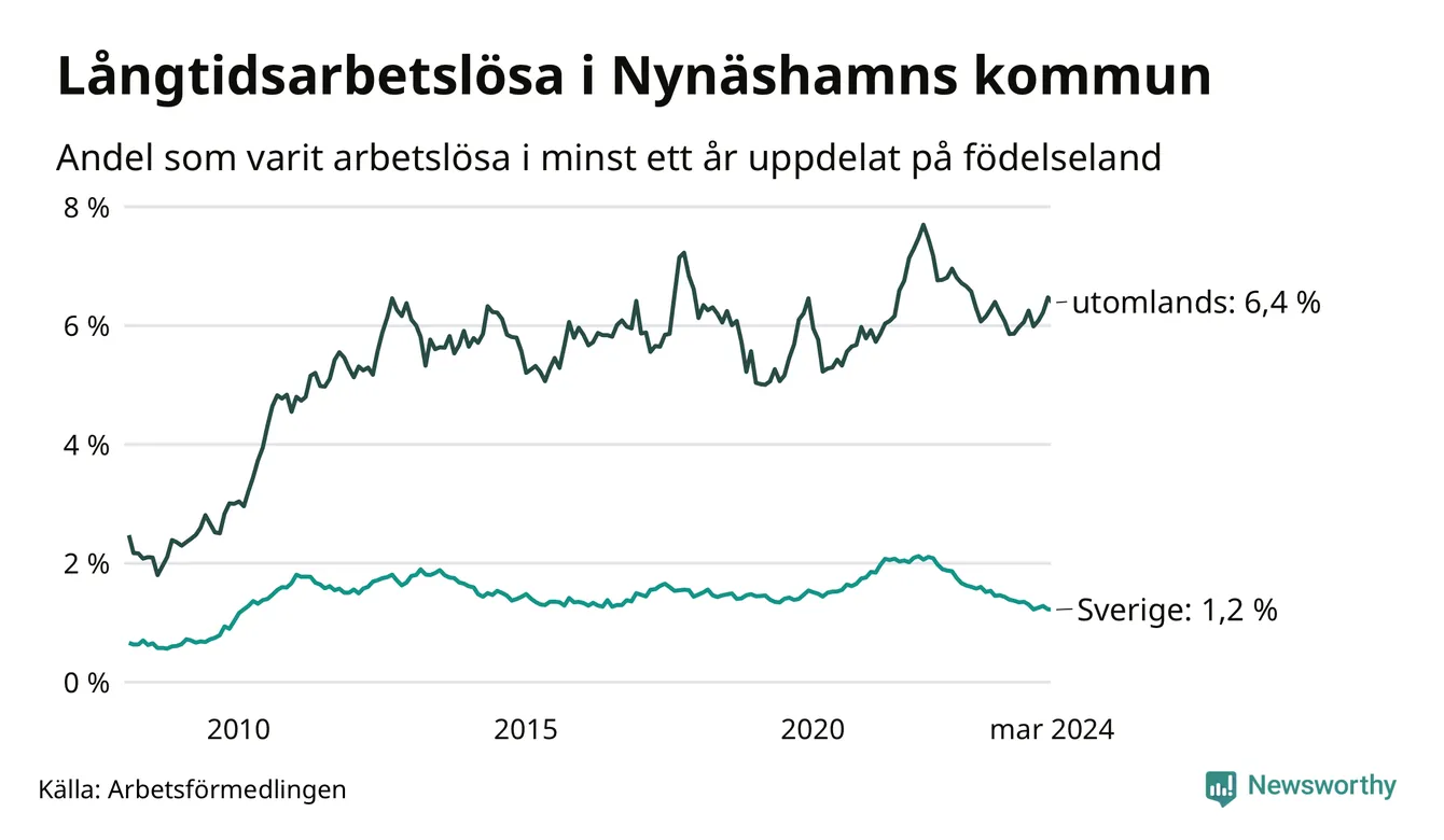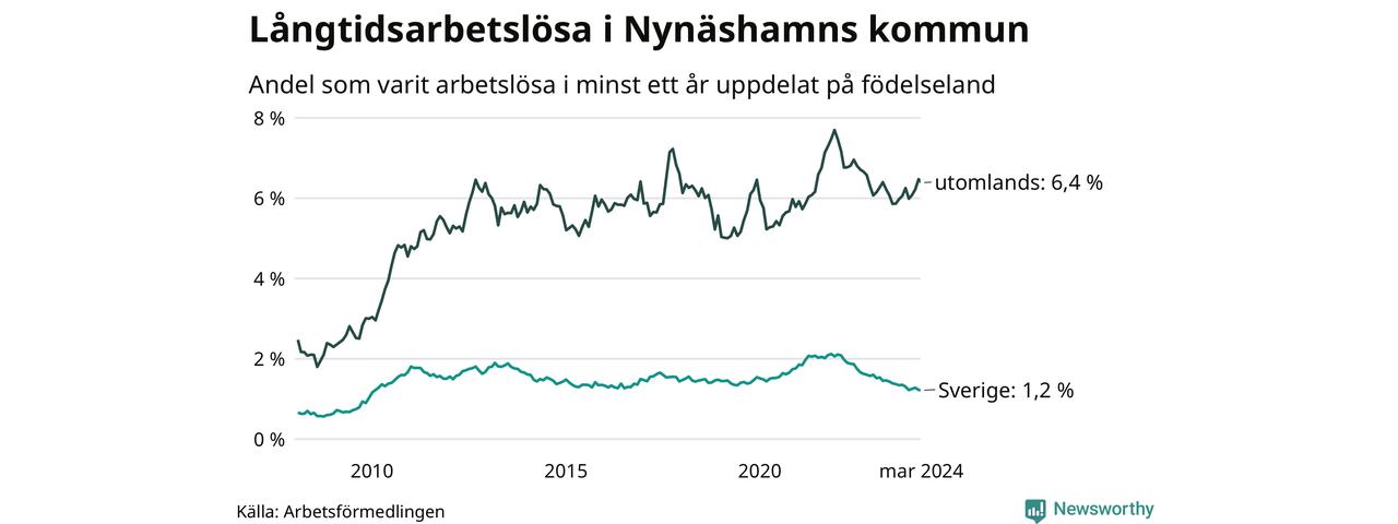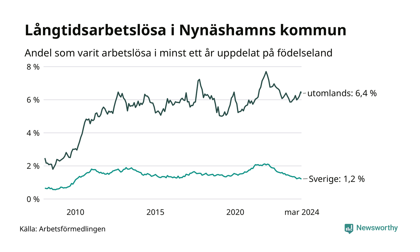 131 av de långtidsarbetslösa i Nynäshamn är födda i Sverige, medan 240 är födda utomlands. Det innebär att långtidsarbetslösheten bland Sverigefödda är 1,2 procent, medan den är fem gånger så hög – 6,4 procent – bland födda utomlands. Även i riket som helhet är arbetslösheten högre bland utrikesfödda.