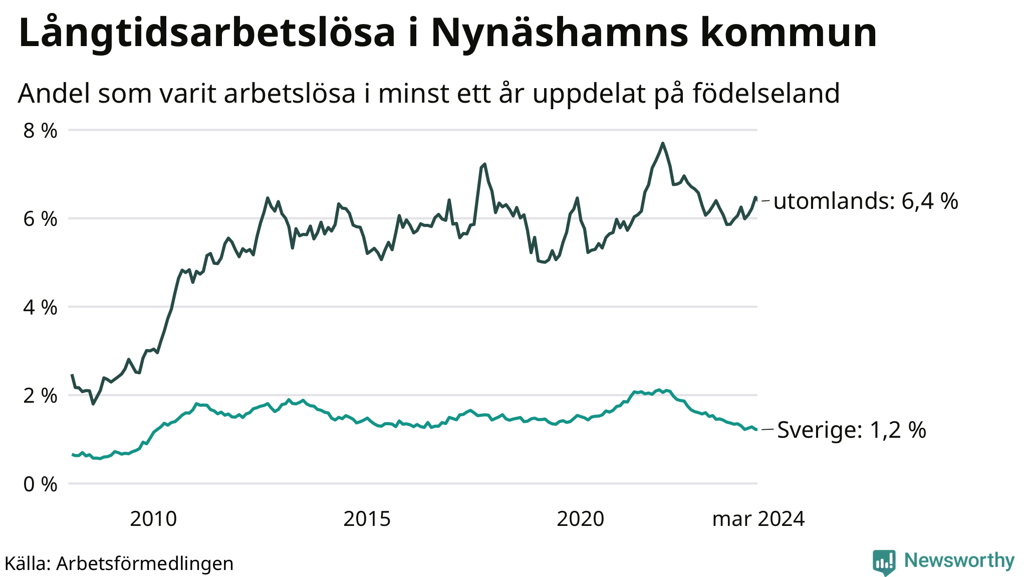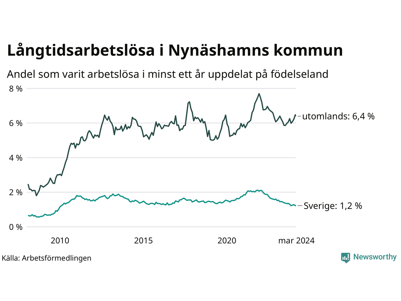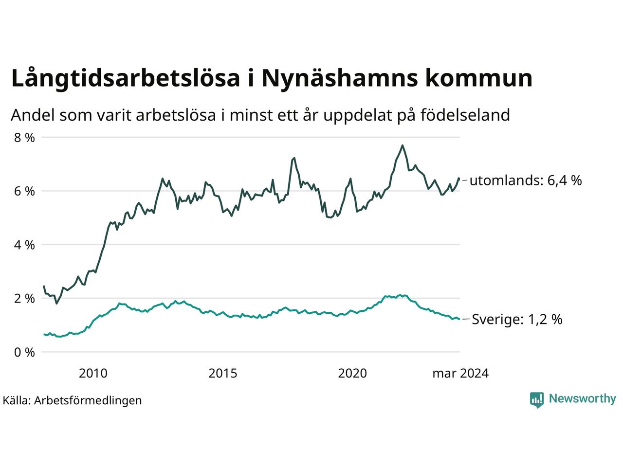131 av de långtidsarbetslösa i Nynäshamn är födda i Sverige, medan 240 är födda utomlands. Det innebär att långtidsarbetslösheten bland Sverigefödda är 1,2 procent, medan den är fem gånger så hög – 6,4 procent – bland födda utomlands. Även i riket som helhet är arbetslösheten högre bland utrikesfödda.