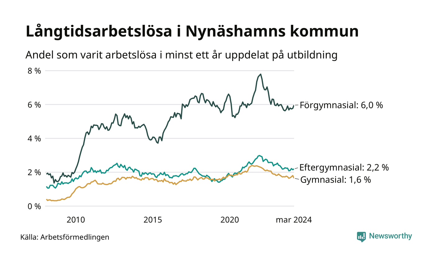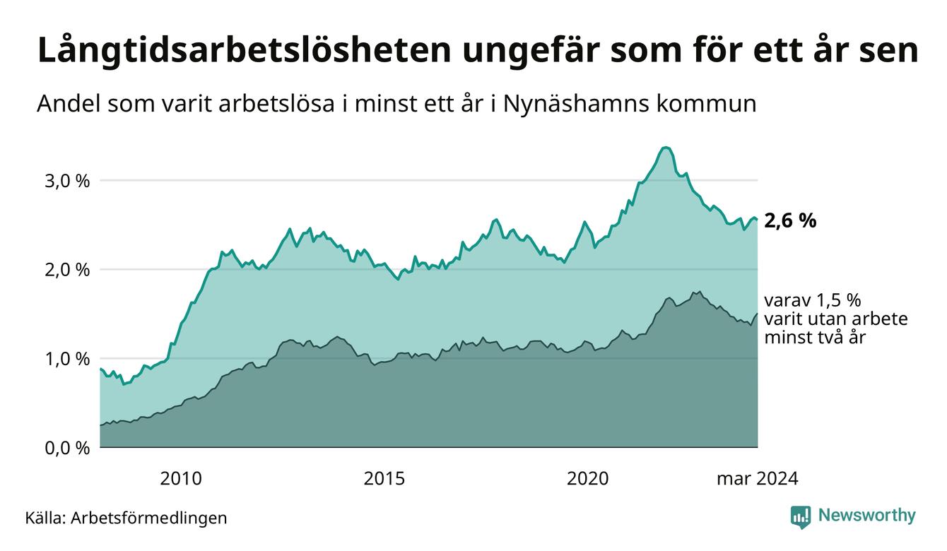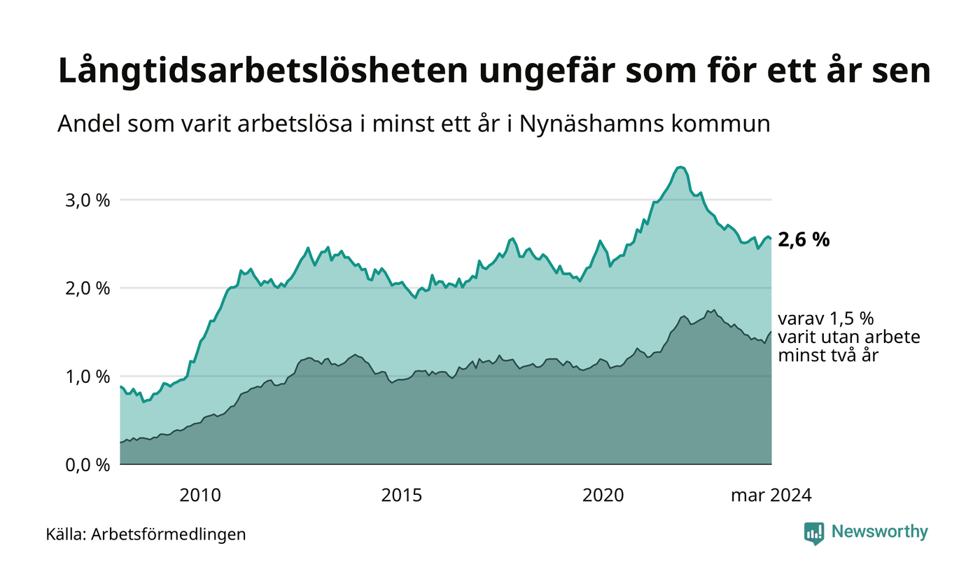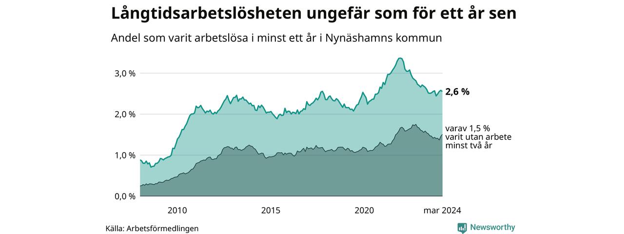 I mars hade 371 Nynäshamnsbor varit arbetslösa i minst ett år, vilket är fyra färre än månaden innan. 371 personer motsvarar 2,6 procent av arbetskraften i kommunen – andelen långtidsarbetslösa är ungefär på samma nivå som för ett år sedan.