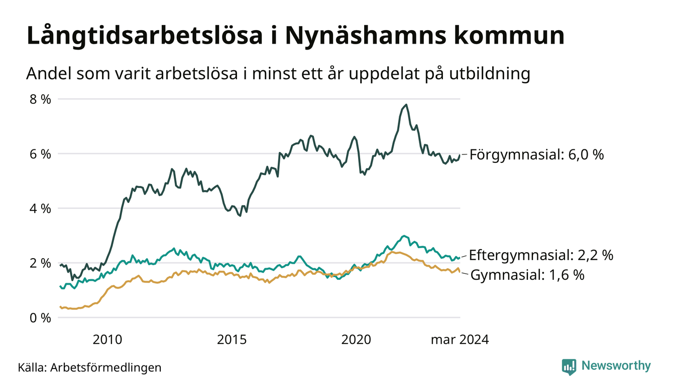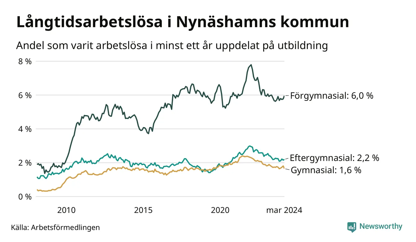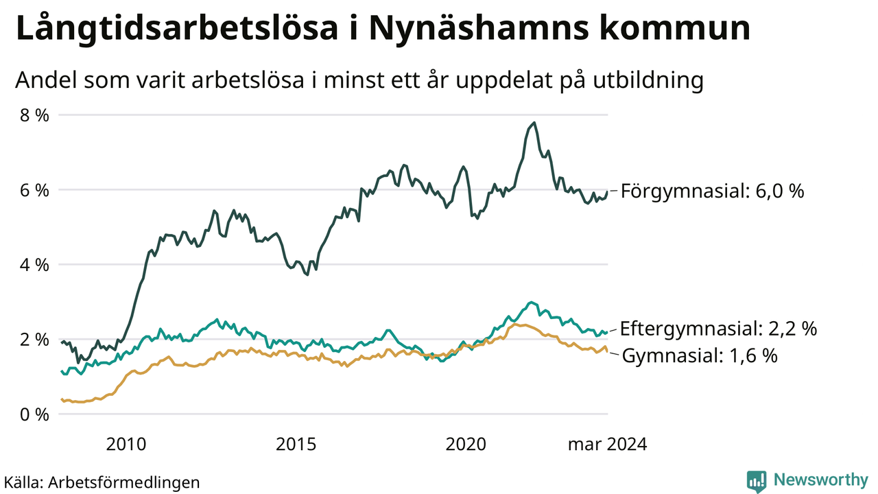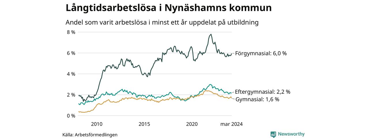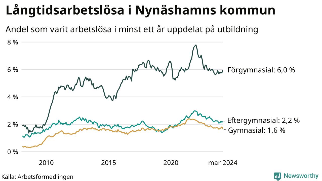 I mars hade 371 Nynäshamnsbor varit arbetslösa i minst ett år, vilket är fyra färre än månaden innan. 371 personer motsvarar 2,6 procent av arbetskraften i kommunen – andelen långtidsarbetslösa är ungefär på samma nivå som för ett år sedan.