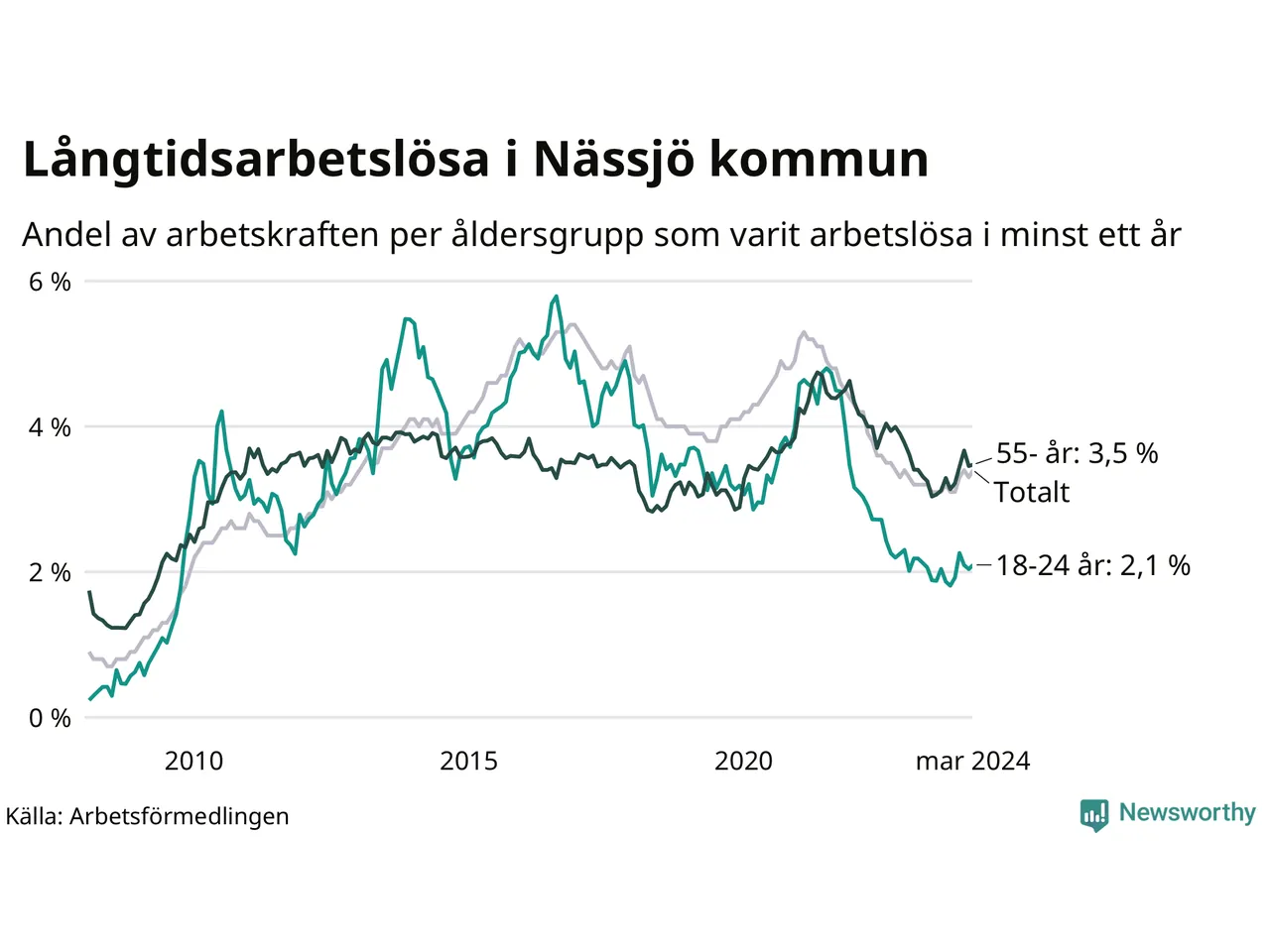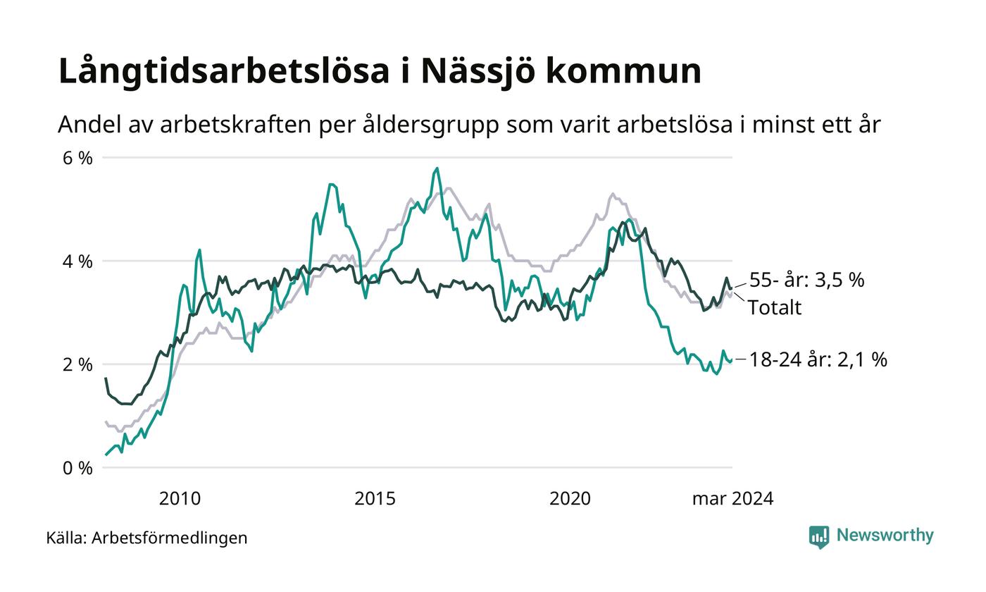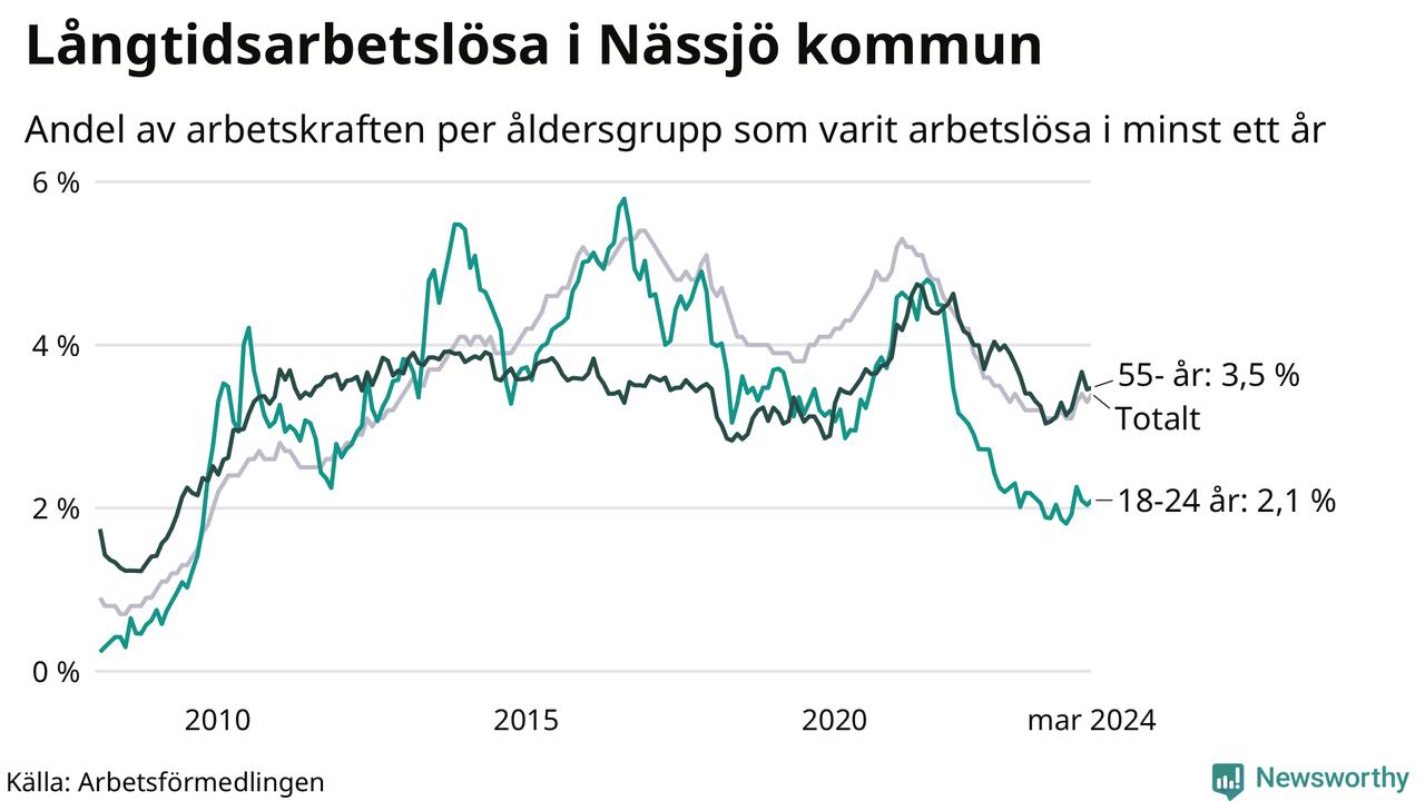 Av de 525 personerna som varit arbetslösa i mer än ett år i Nässjö kommun är 119 personer mellan 55 och 651 år och 37 är mellan 18 och 24 år. För den äldre gruppen är andelen arbetslösa 3,5 procent medan den i den yngre gruppen är 2,1 procent. Även i riket som helhet är långtidsarbetslösheten högre i gruppen äldre.