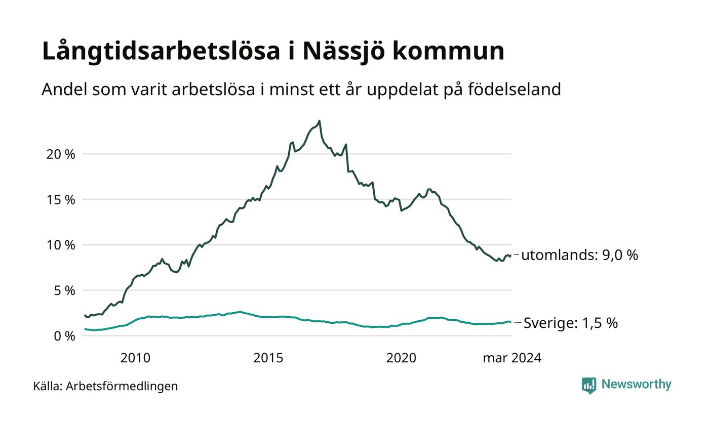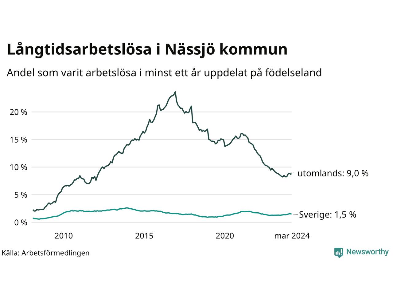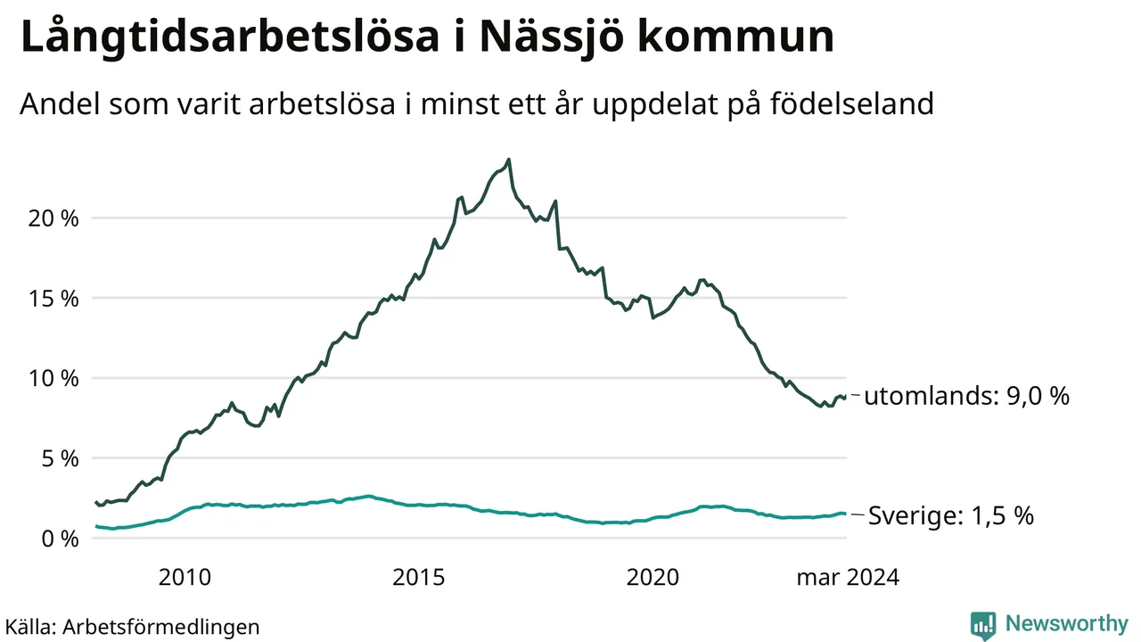 172 av de långtidsarbetslösa i Nässjö är födda i Sverige, medan 353 är födda utomlands. Det innebär att långtidsarbetslösheten bland Sverigefödda är 1,5 procent, medan den är sex gånger så hög – 9,0 procent – bland födda utomlands. Även i riket som helhet är arbetslösheten högre bland utrikesfödda.