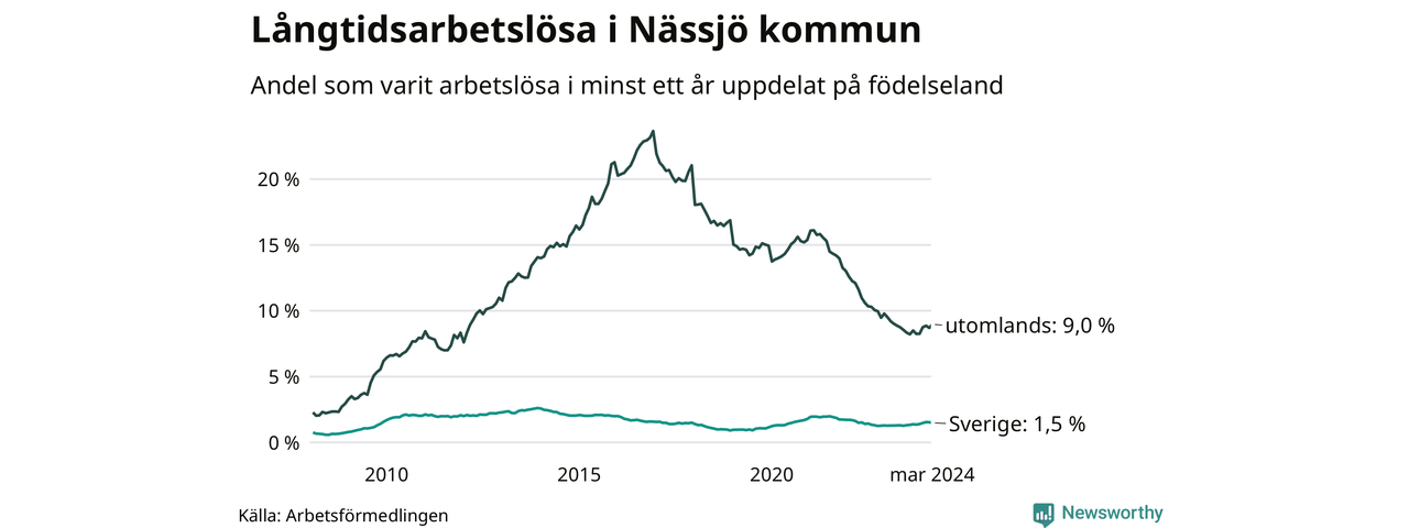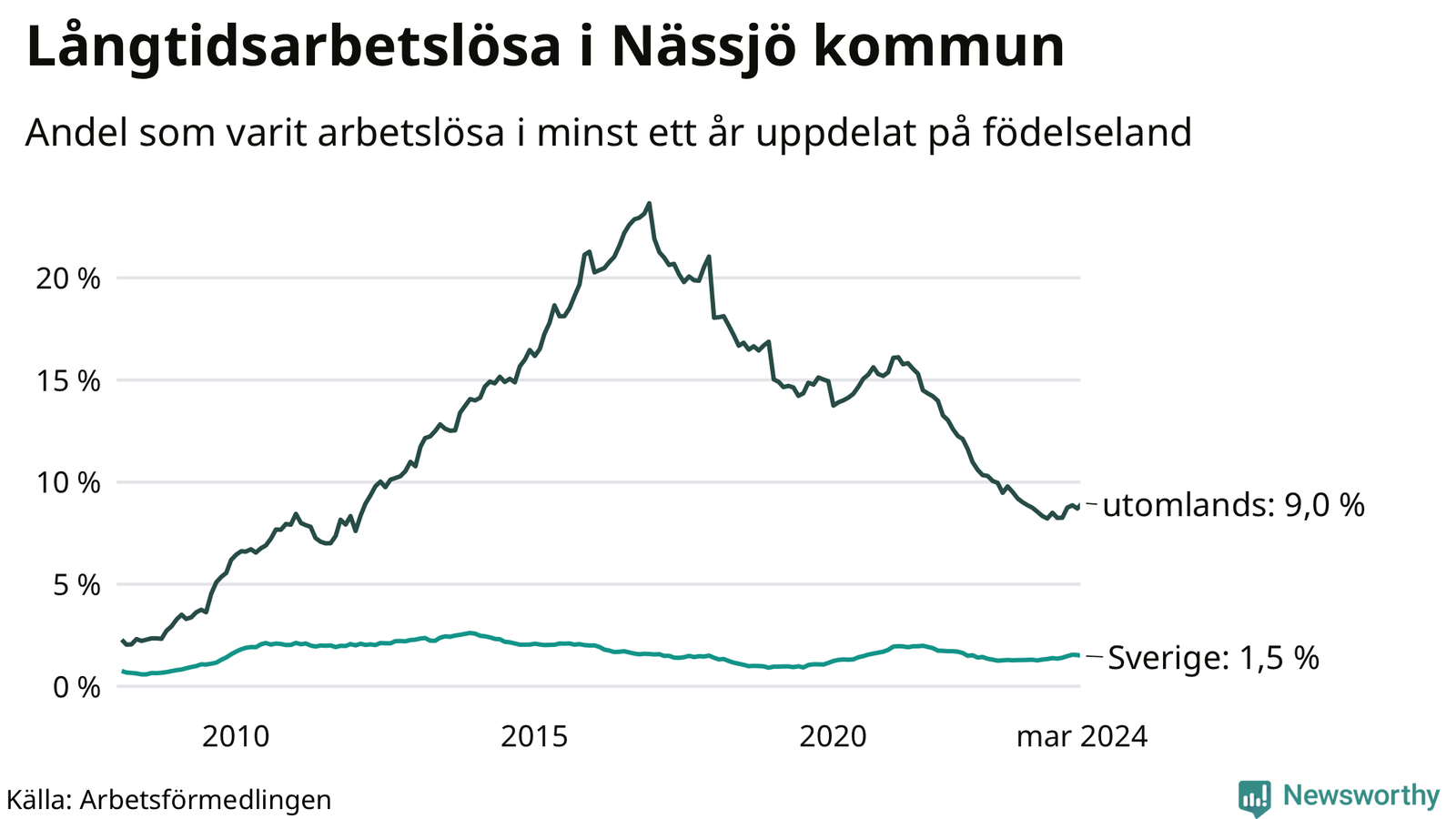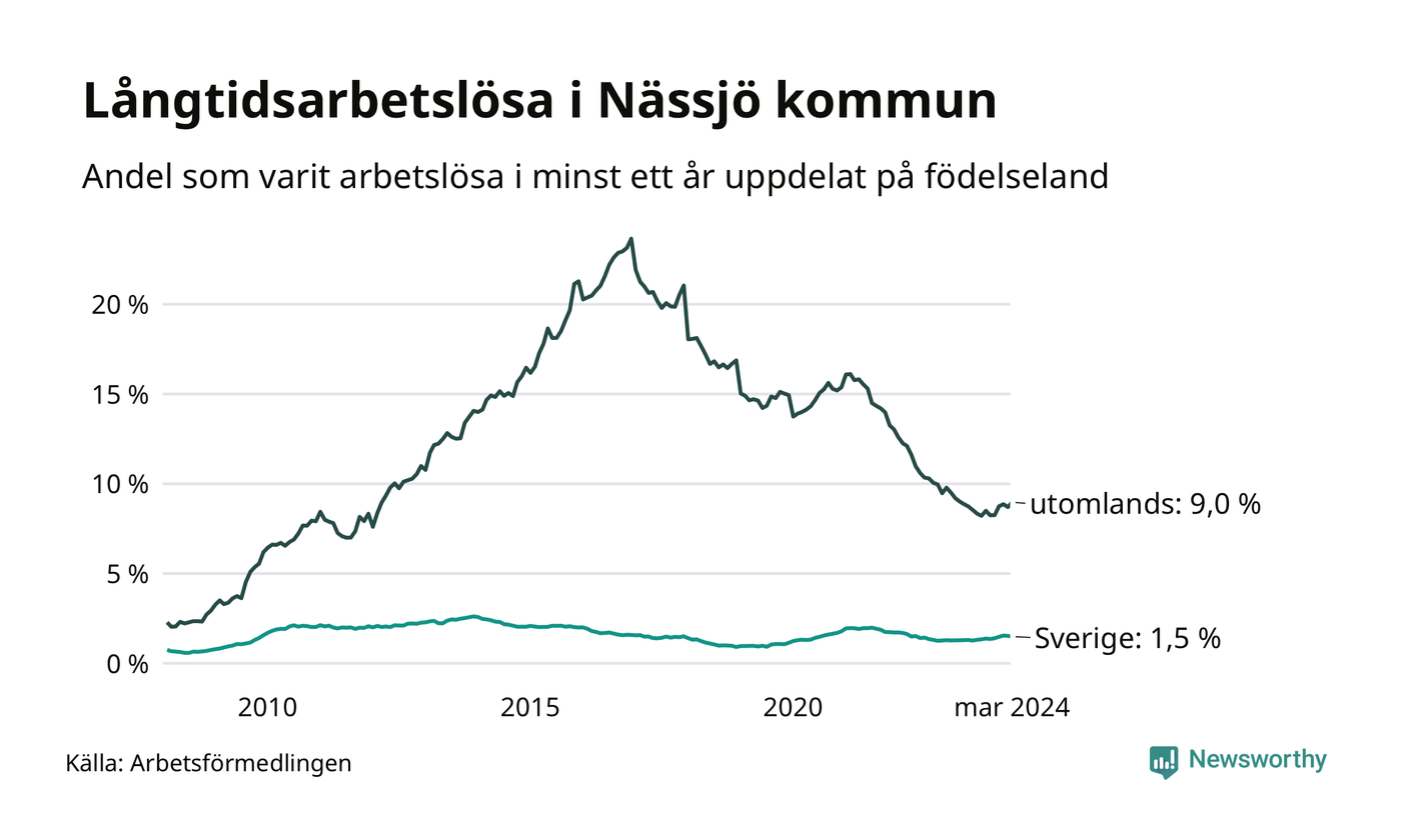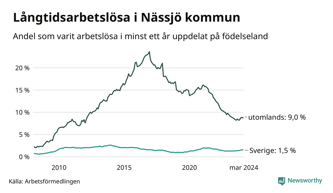 172 av de långtidsarbetslösa i Nässjö är födda i Sverige, medan 353 är födda utomlands. Det innebär att långtidsarbetslösheten bland Sverigefödda är 1,5 procent, medan den är sex gånger så hög – 9,0 procent – bland födda utomlands. Även i riket som helhet är arbetslösheten högre bland utrikesfödda.
