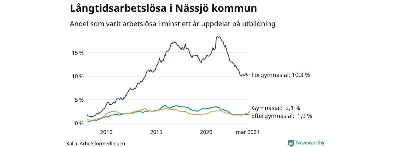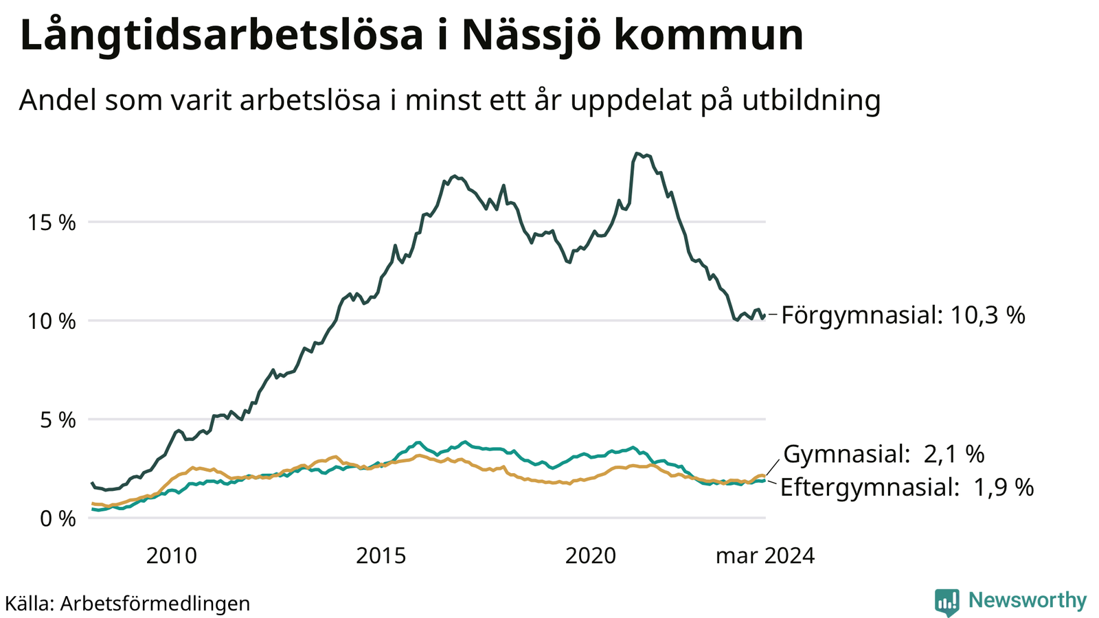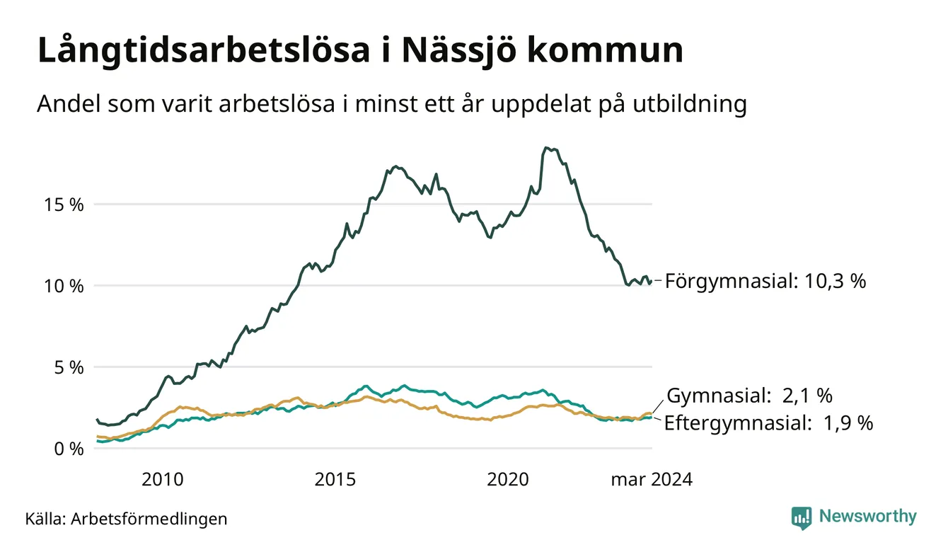 Graf över andel långtidsarbetslösa i Nässjö uppdelat på utbildningsnivå