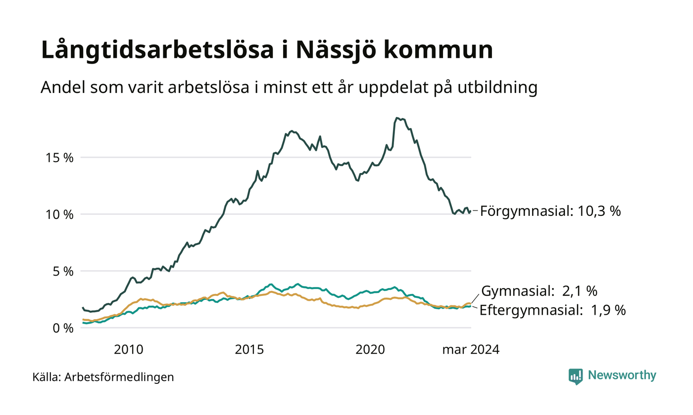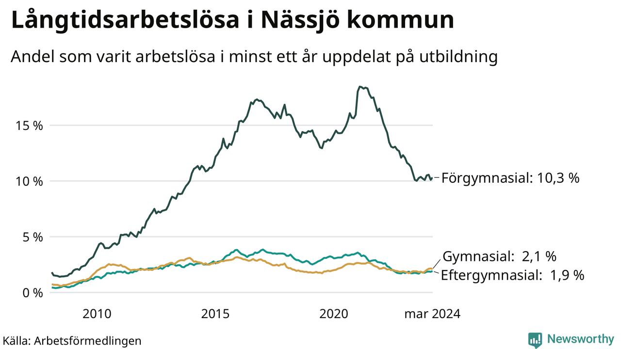 Andelen långtidsarbetslösa i Nässjö är den högsta i Jönköpings län. I Habo finns länets lägsta långtidsarbetslöshet, 1,2 procent. I Jönköpings län som helhet hade 4 071 personer (2,2 procent) varit arbetslösa i minst ett år i mars. Det är 57 personer fler än månaden innan, och det är den åttonde månaden i rad som antalet sjunkit.