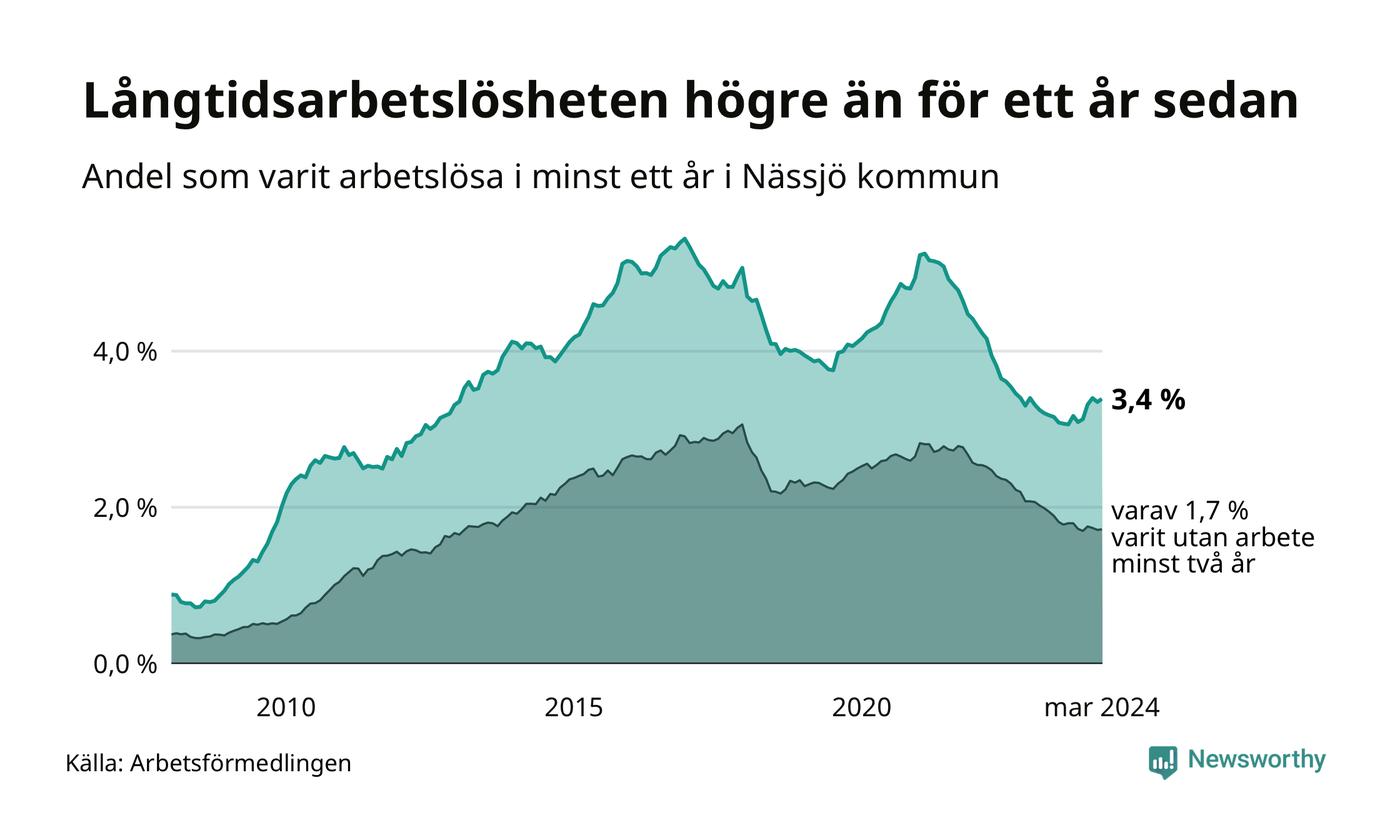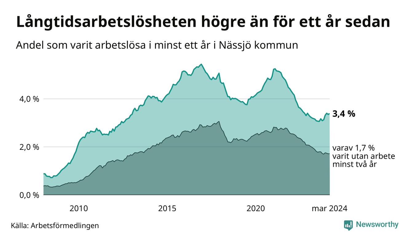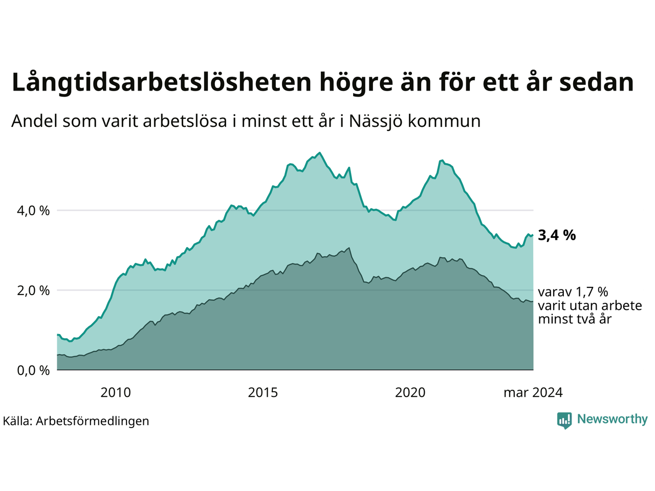 I mars hade 525 Nässjöbor varit arbetslösa i minst ett år, vilket är sex fler än månaden innan. 525 personer motsvarar 3,4 procent av arbetskraften i kommunen – andelen långtidsarbetslösa är 0,2 procentenheter högre än samma månad för ett år sedan.