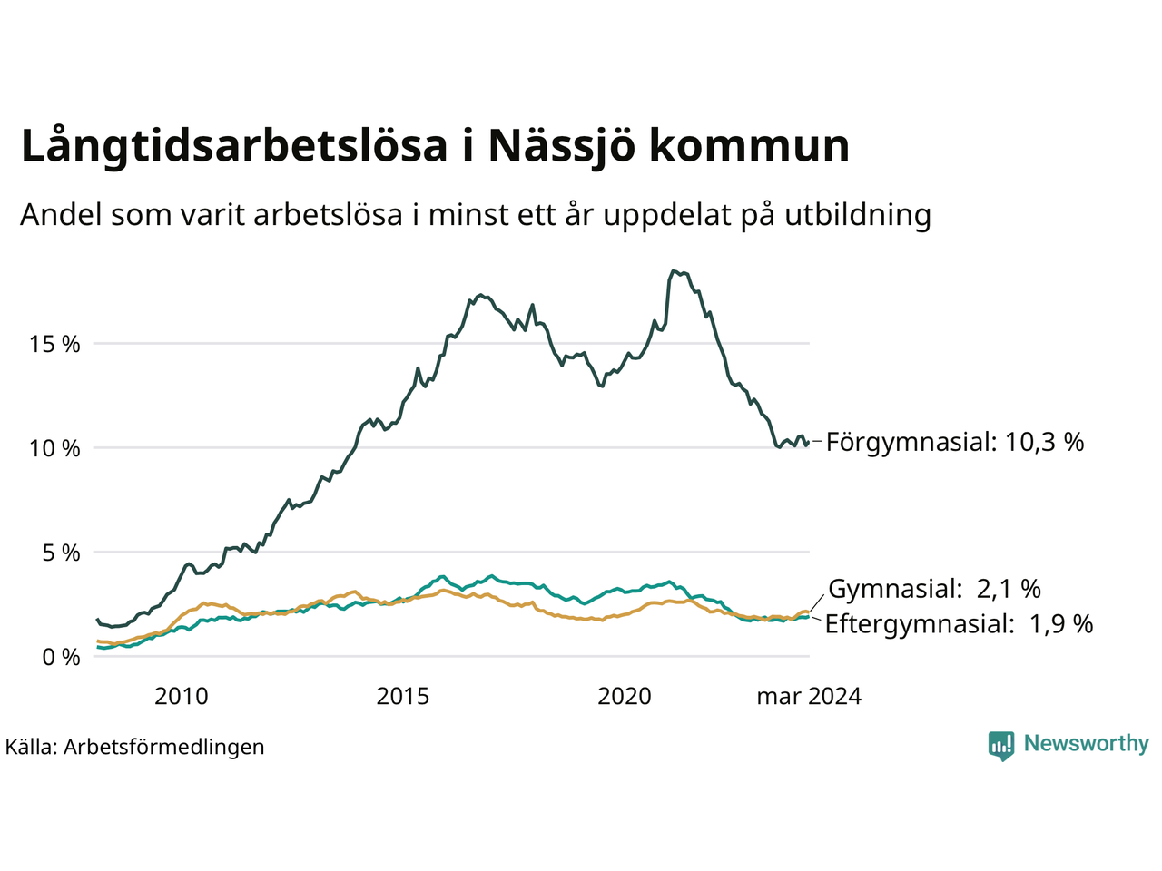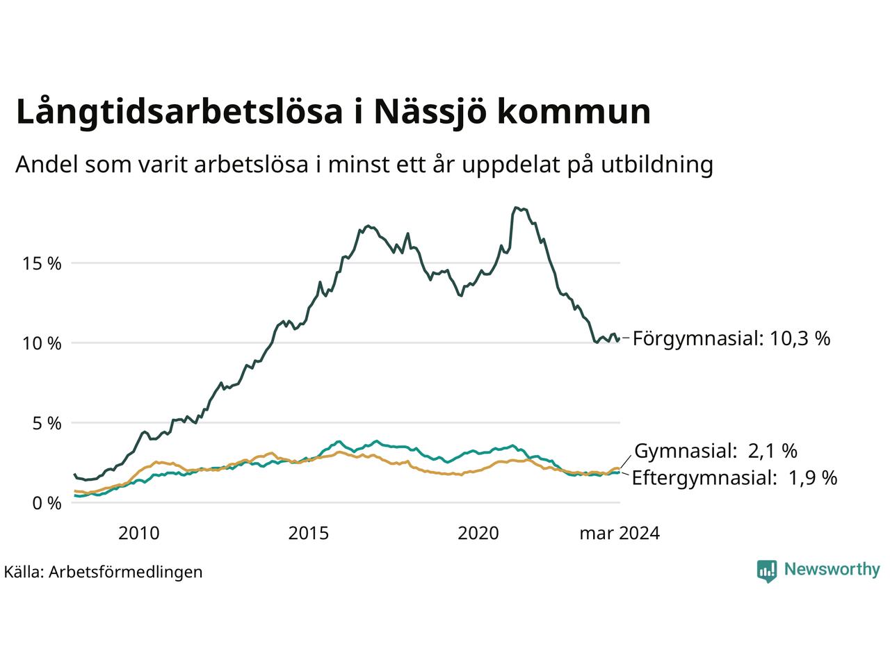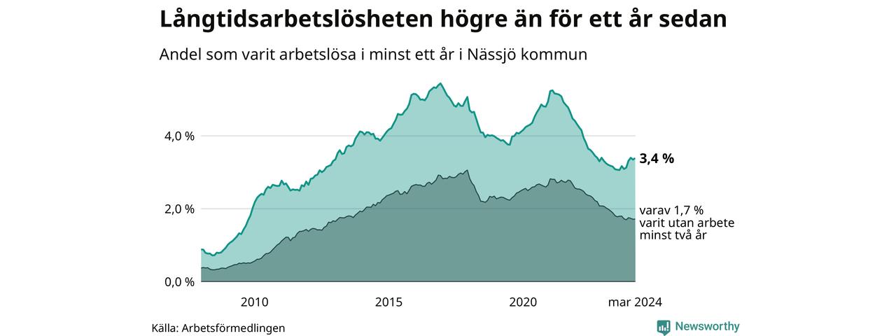 I mars hade 525 Nässjöbor varit arbetslösa i minst ett år, vilket är sex fler än månaden innan. 525 personer motsvarar 3,4 procent av arbetskraften i kommunen – andelen långtidsarbetslösa är 0,2 procentenheter högre än samma månad för ett år sedan.