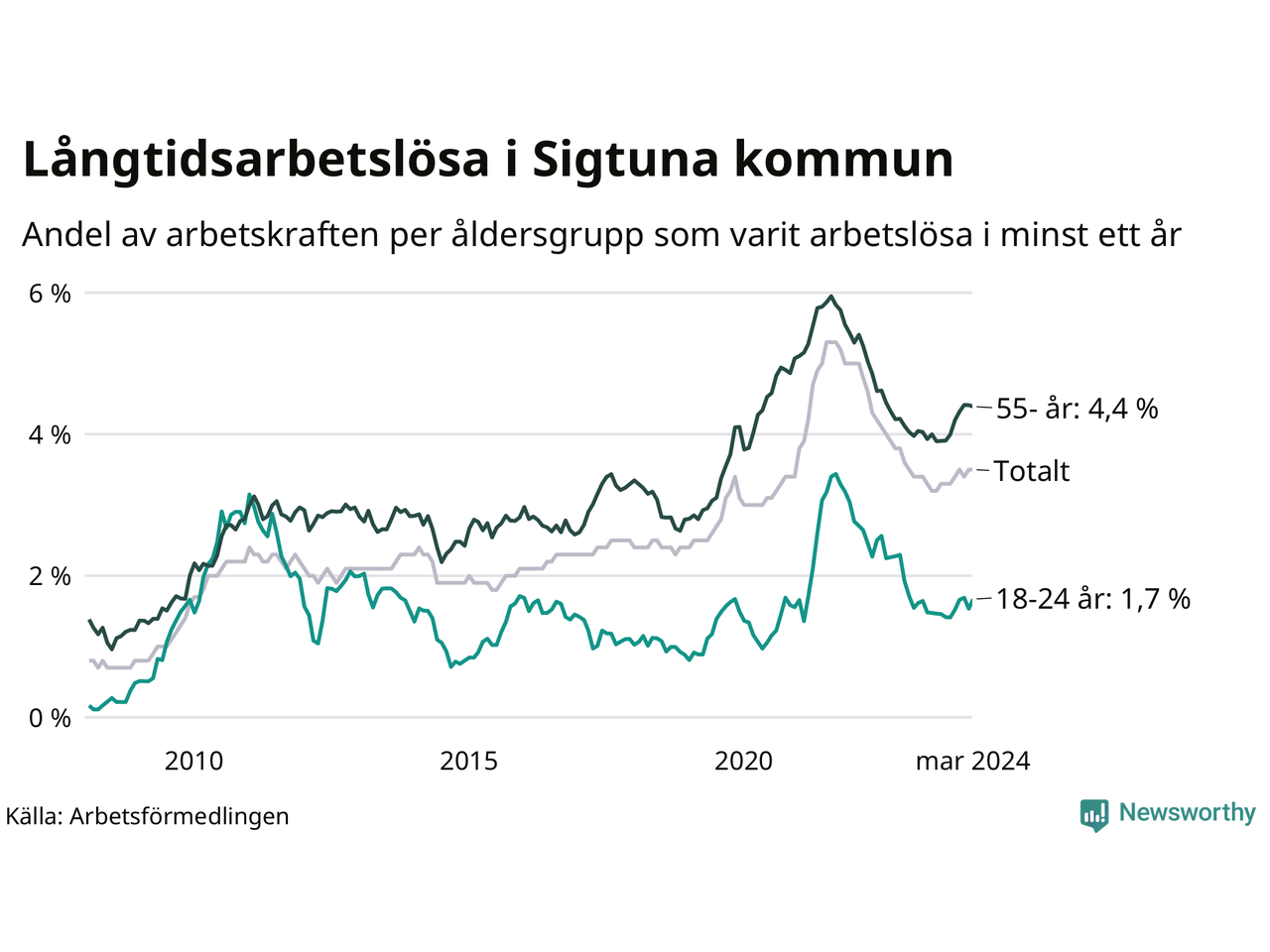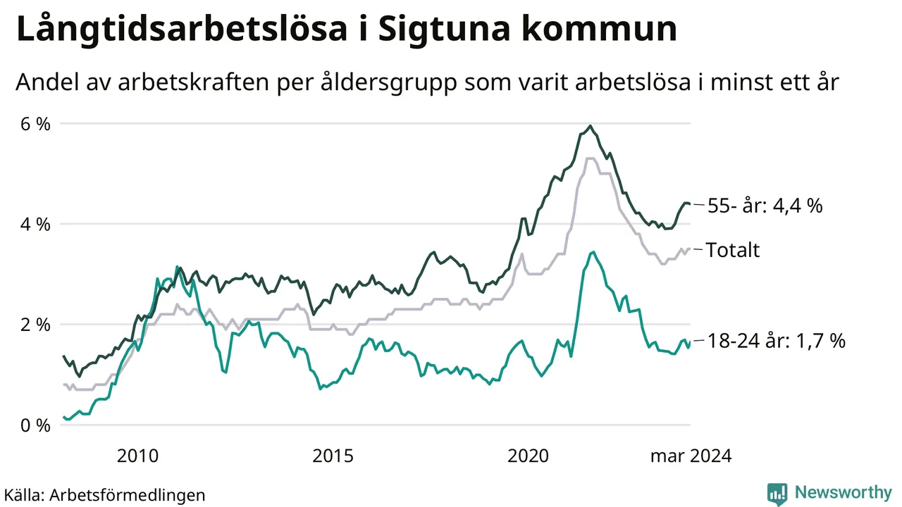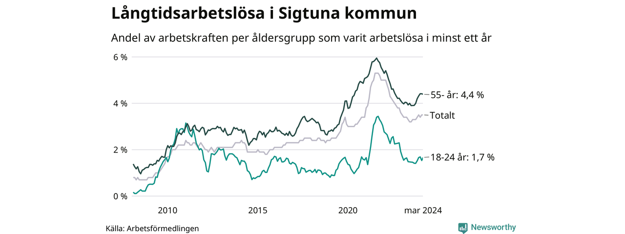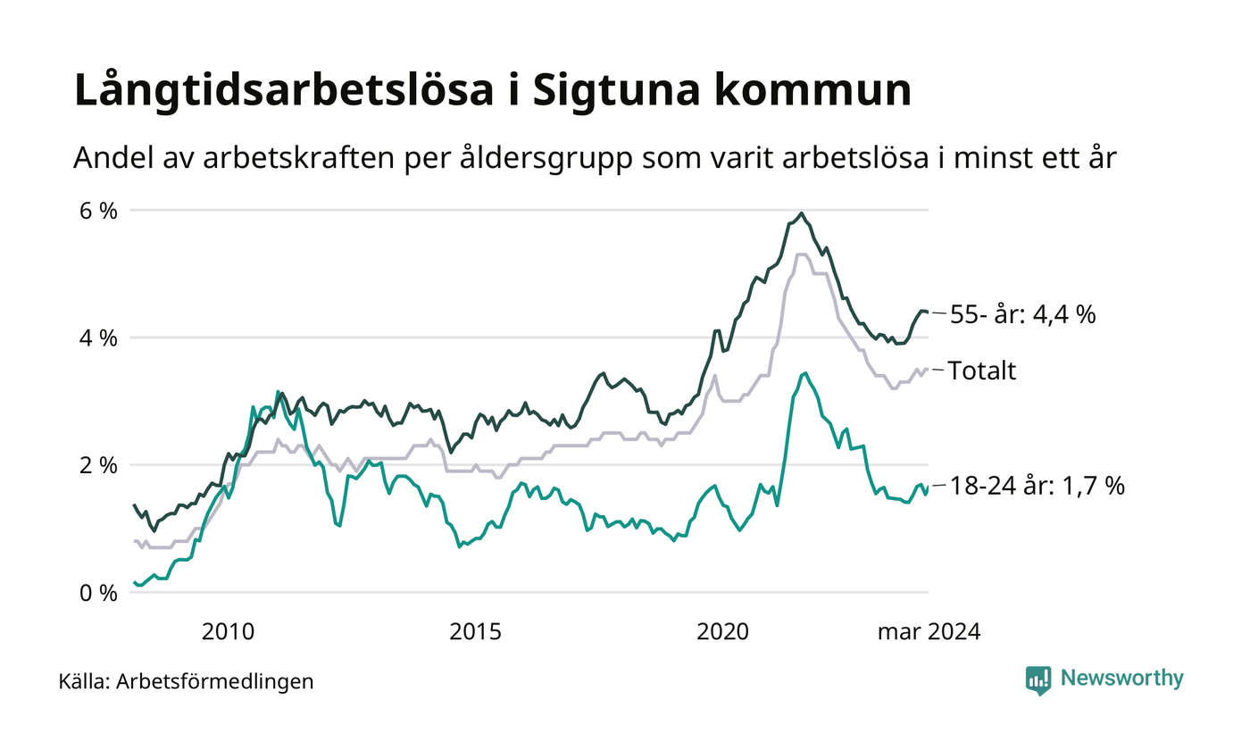Av de 935 personerna som varit arbetslösa i mer än ett år i Sigtuna kommun är 223 personer mellan 55 och 651 år och 46 är mellan 18 och 24 år. För den äldre gruppen är andelen arbetslösa 4,4 procent medan den i den yngre gruppen är 1,7 procent. Även i riket som helhet är långtidsarbetslösheten högre i gruppen äldre.
