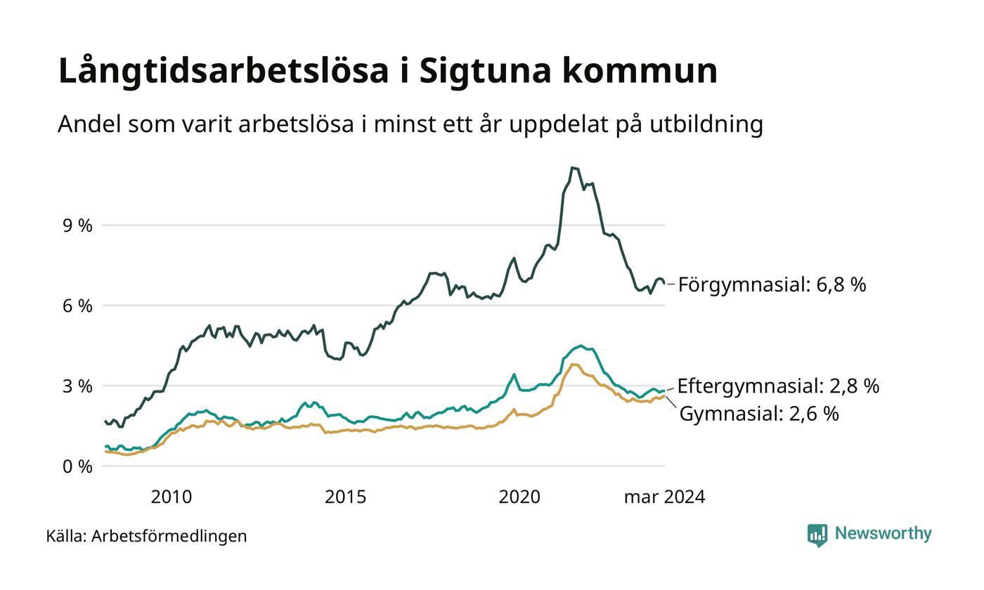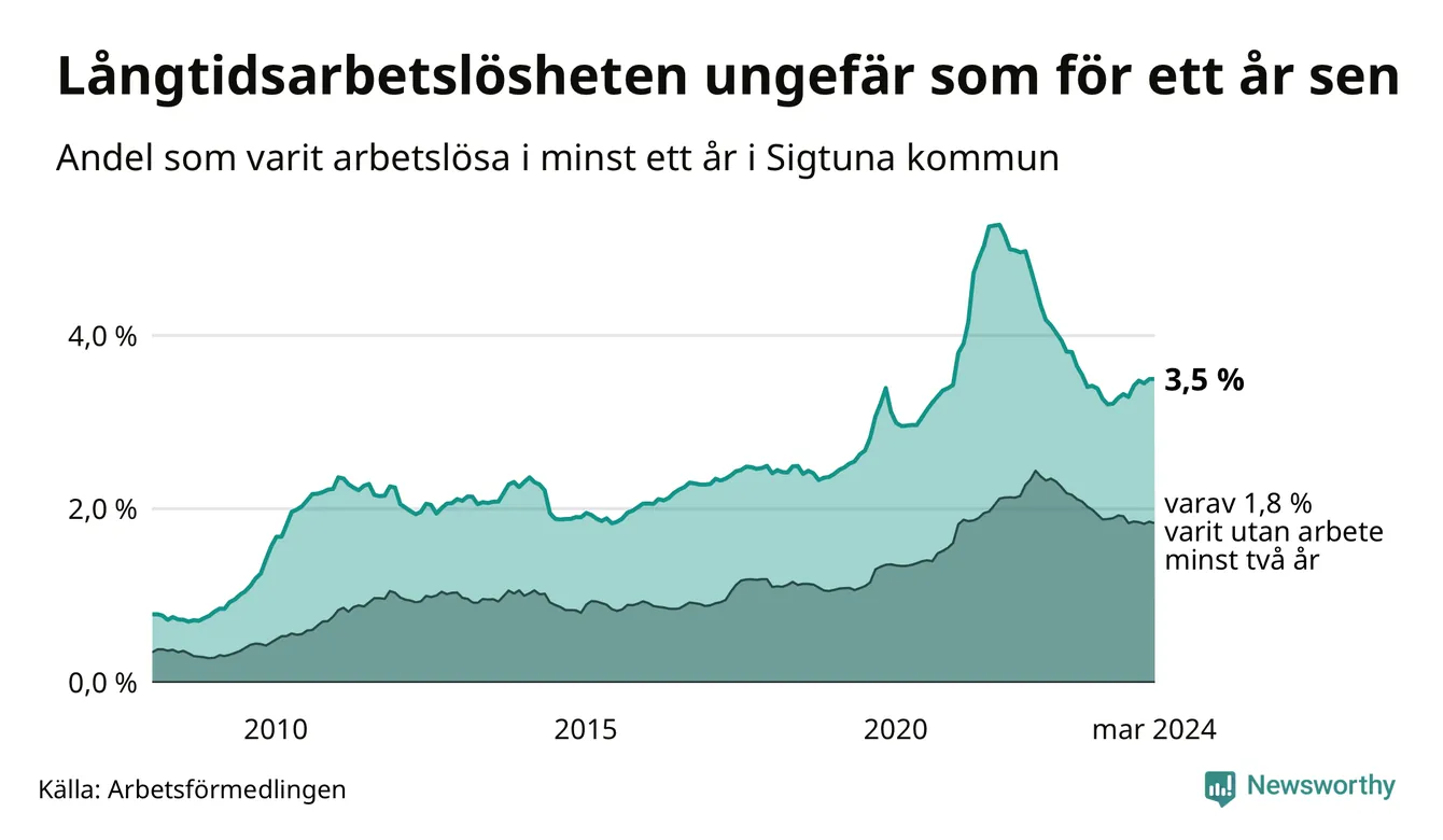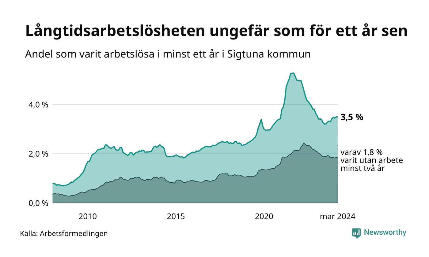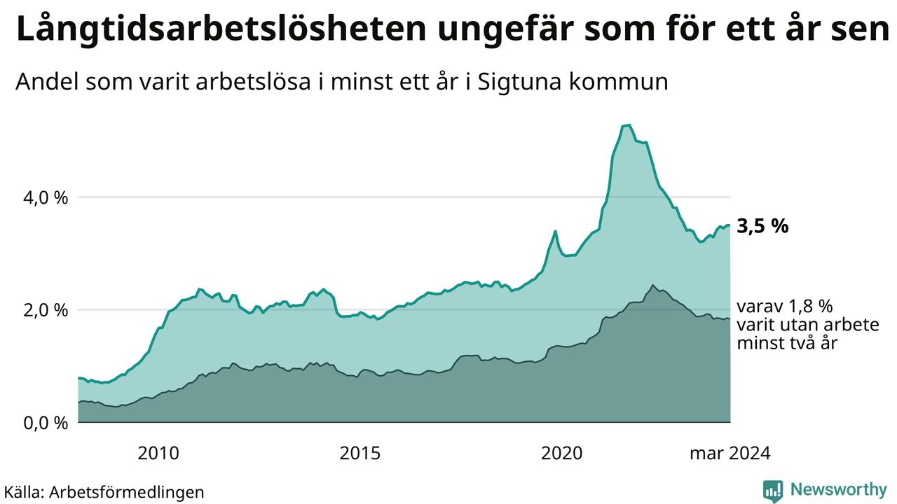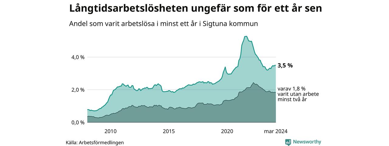 I mars hade 935 Sigtunabor varit arbetslösa i minst ett år, vilket är två fler än månaden innan. 935 personer motsvarar 3,5 procent av arbetskraften i kommunen – andelen långtidsarbetslösa är ungefär på samma nivå som för ett år sedan.