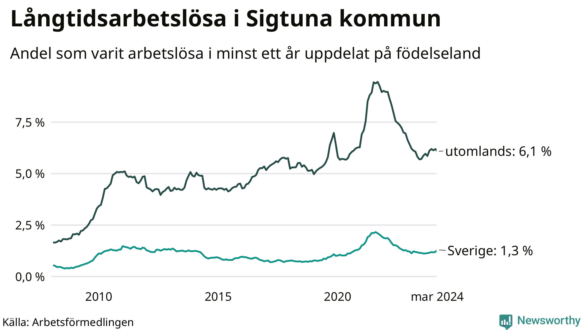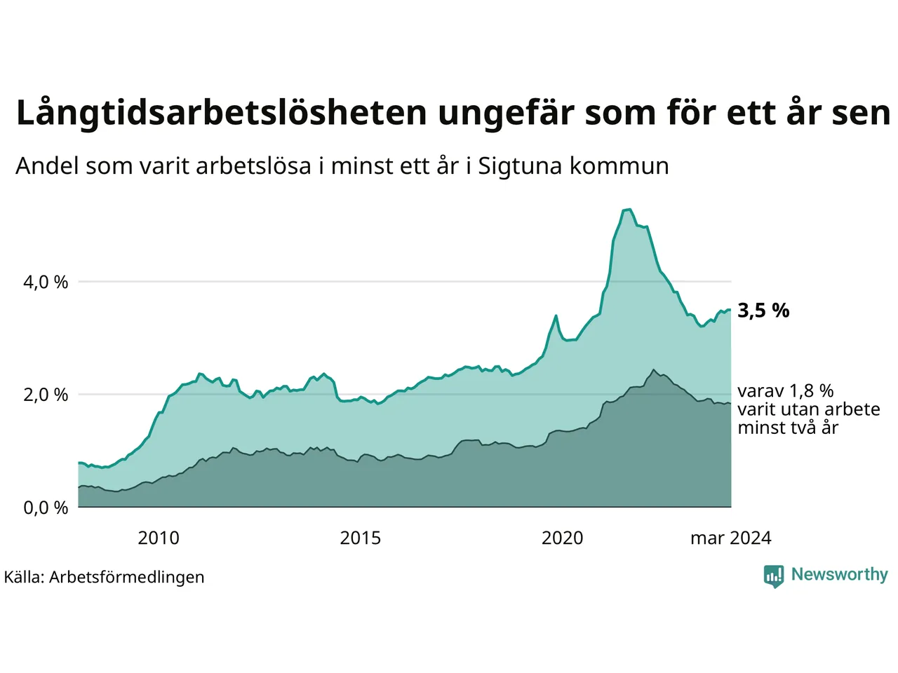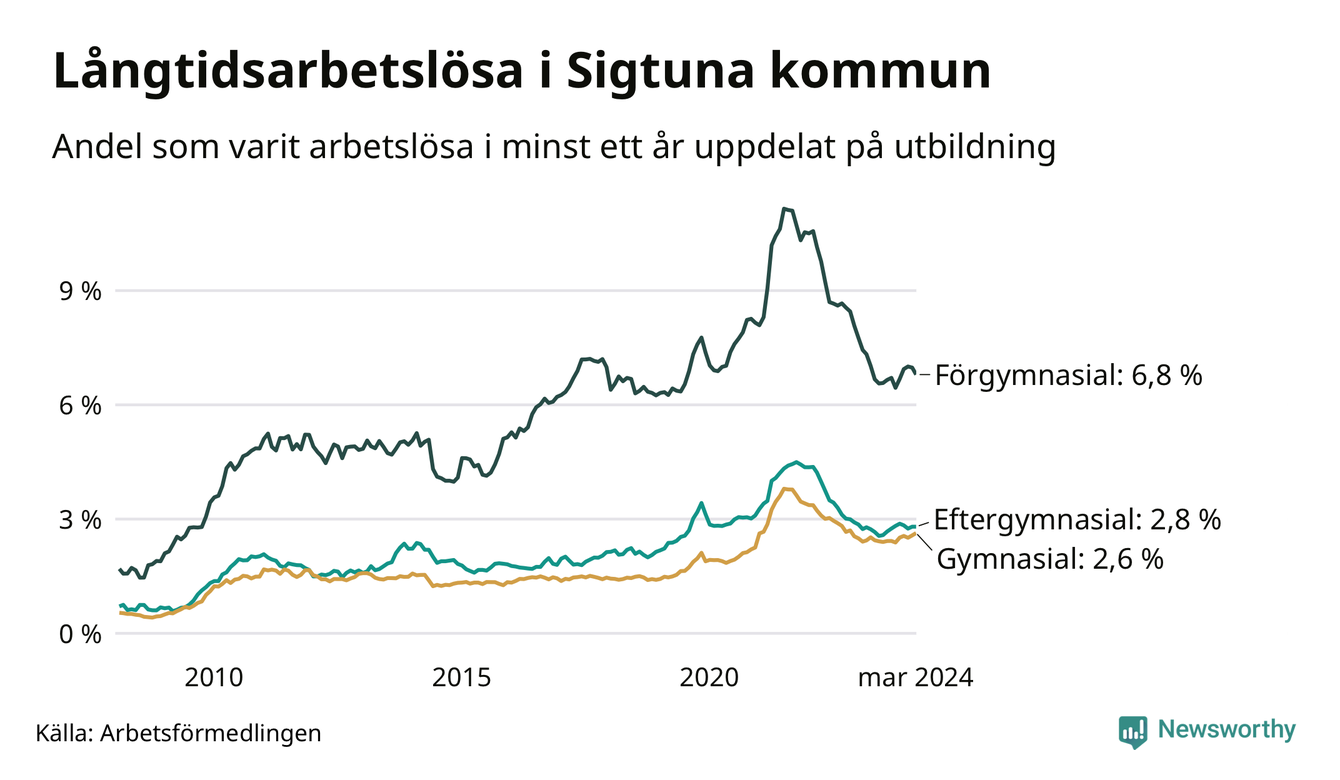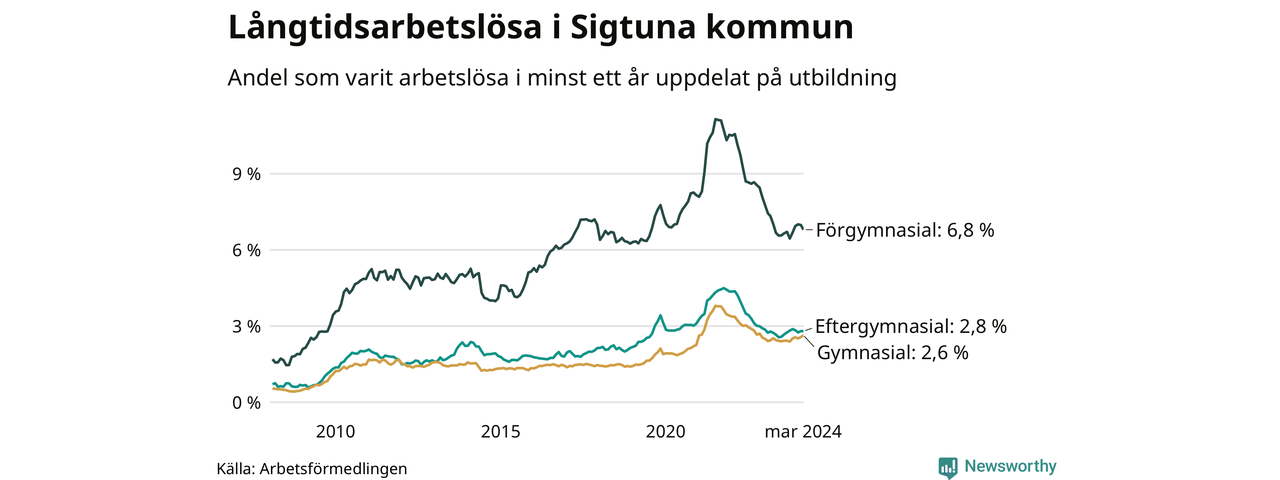 I mars hade 935 Sigtunabor varit arbetslösa i minst ett år, vilket är två fler än månaden innan. 935 personer motsvarar 3,5 procent av arbetskraften i kommunen – andelen långtidsarbetslösa är ungefär på samma nivå som för ett år sedan.