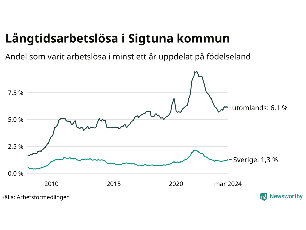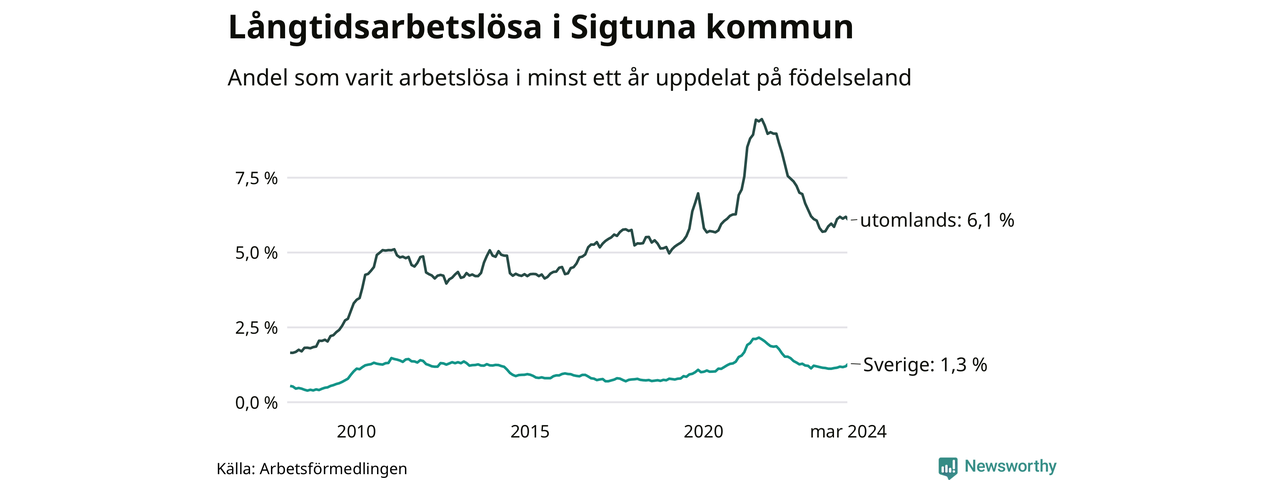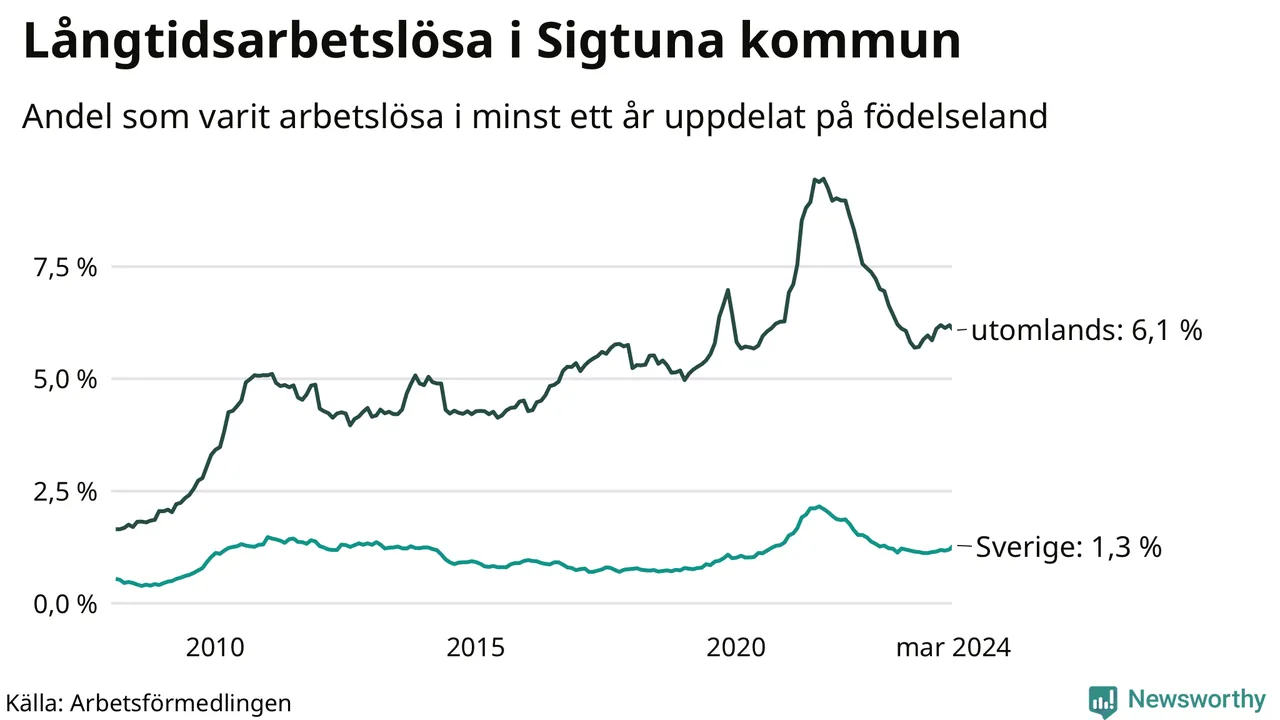 186 av de långtidsarbetslösa i Sigtuna är födda i Sverige, medan 749 är födda utomlands. Det innebär att långtidsarbetslösheten bland Sverigefödda är 1,3 procent, medan den är fem gånger så hög – 6,1 procent – bland födda utomlands. Även i riket som helhet är arbetslösheten högre bland utrikesfödda.