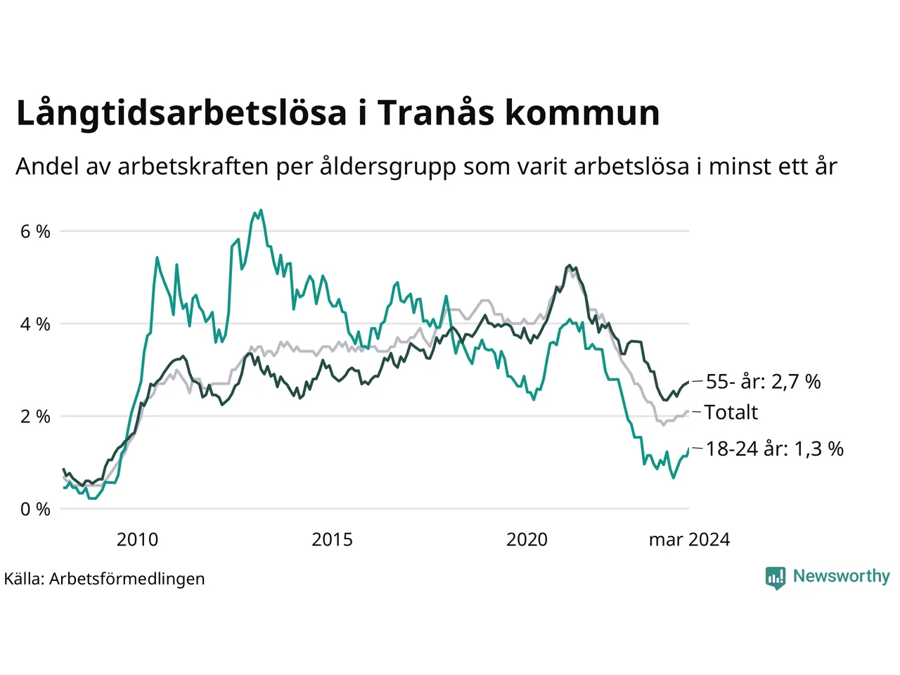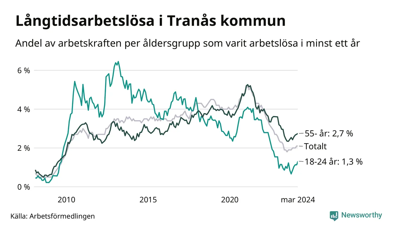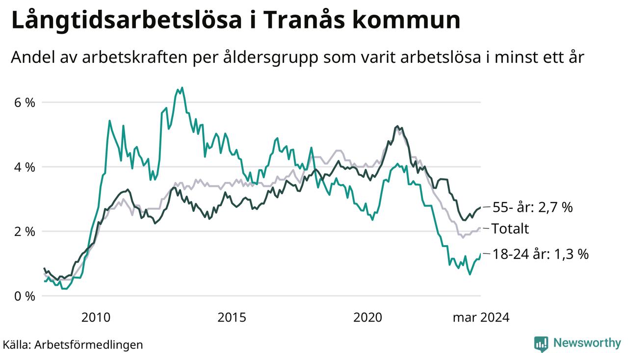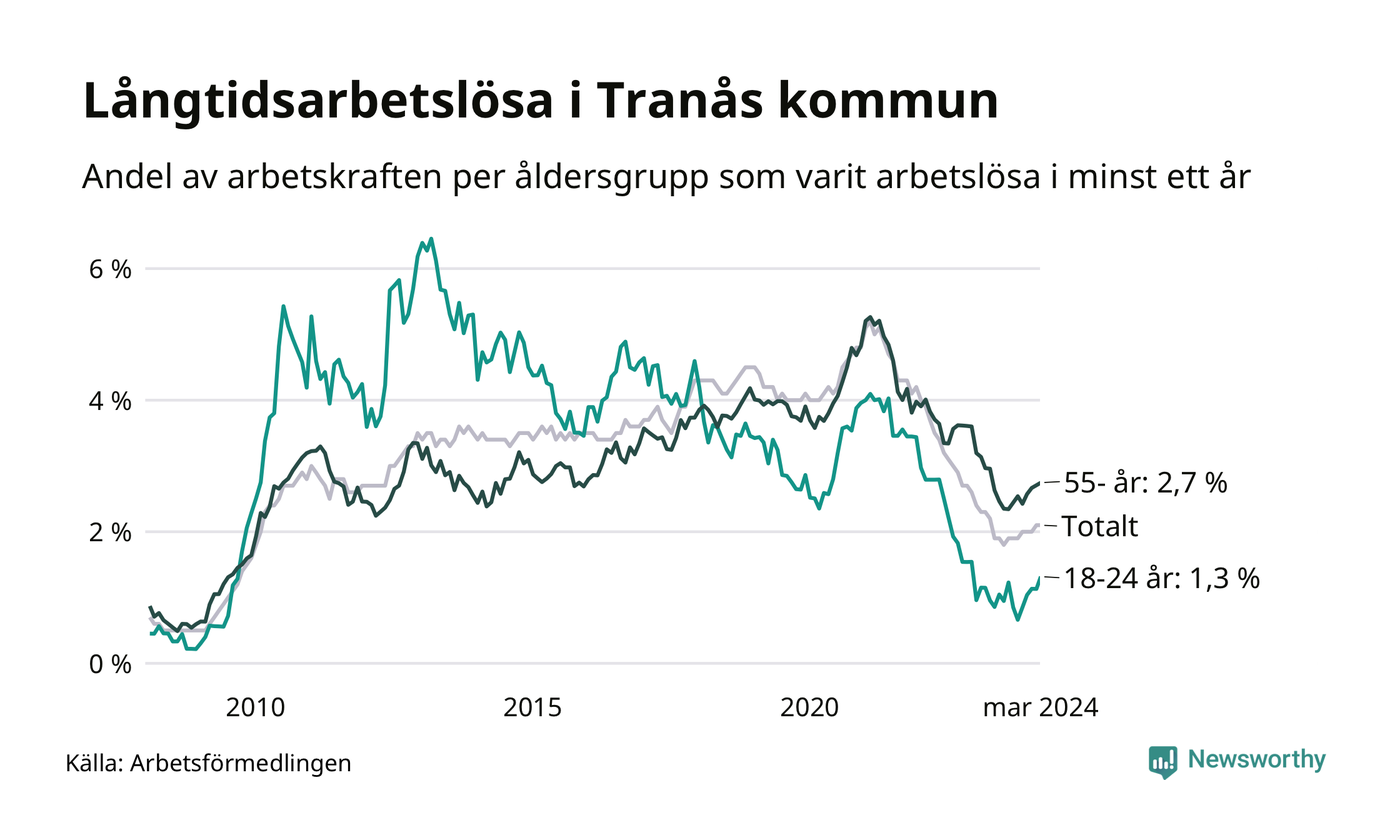 Av de 183 personerna som varit arbetslösa i mer än ett år i Tranås kommun är 53 personer mellan 55 och 651 år och 14 är mellan 18 och 24 år. För den äldre gruppen är andelen arbetslösa 2,7 procent medan den i den yngre gruppen är 1,3 procent. Även i riket som helhet är långtidsarbetslösheten högre i gruppen äldre.