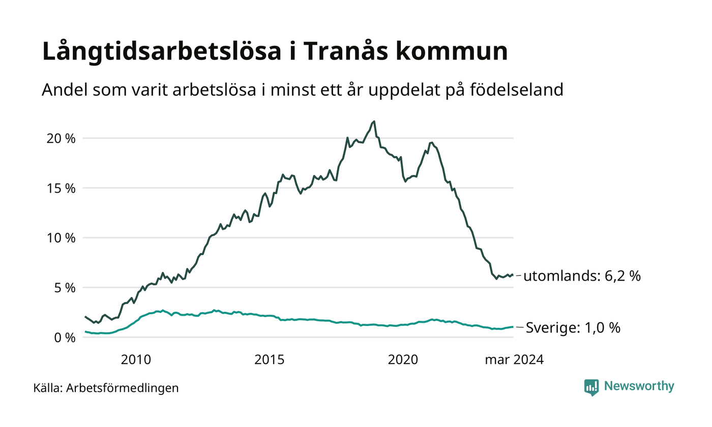 73 av de långtidsarbetslösa i Tranås är födda i Sverige, medan 110 är födda utomlands. Det innebär att långtidsarbetslösheten bland Sverigefödda är 1,0 procent, medan den är sex gånger så hög – 6,2 procent – bland födda utomlands. Även i riket som helhet är arbetslösheten högre bland utrikesfödda.
