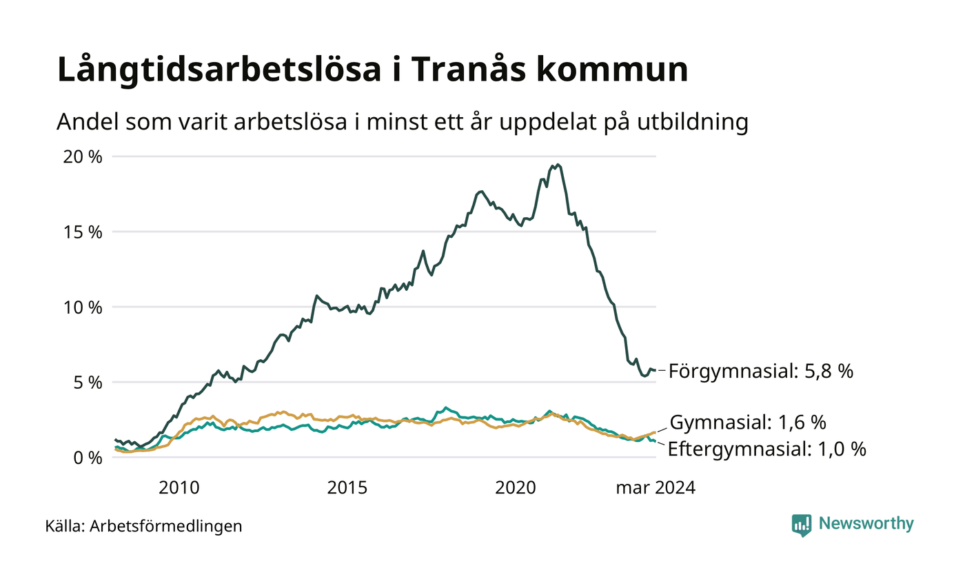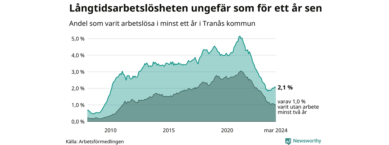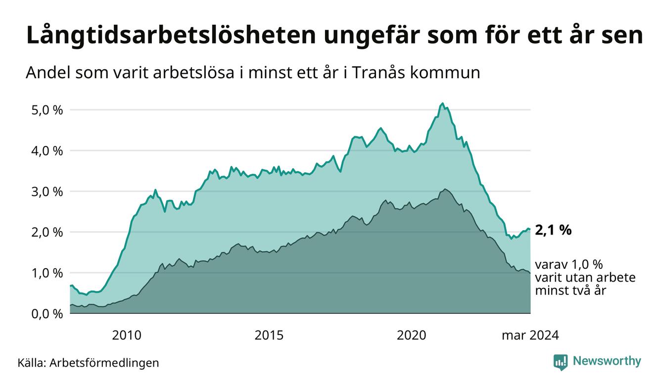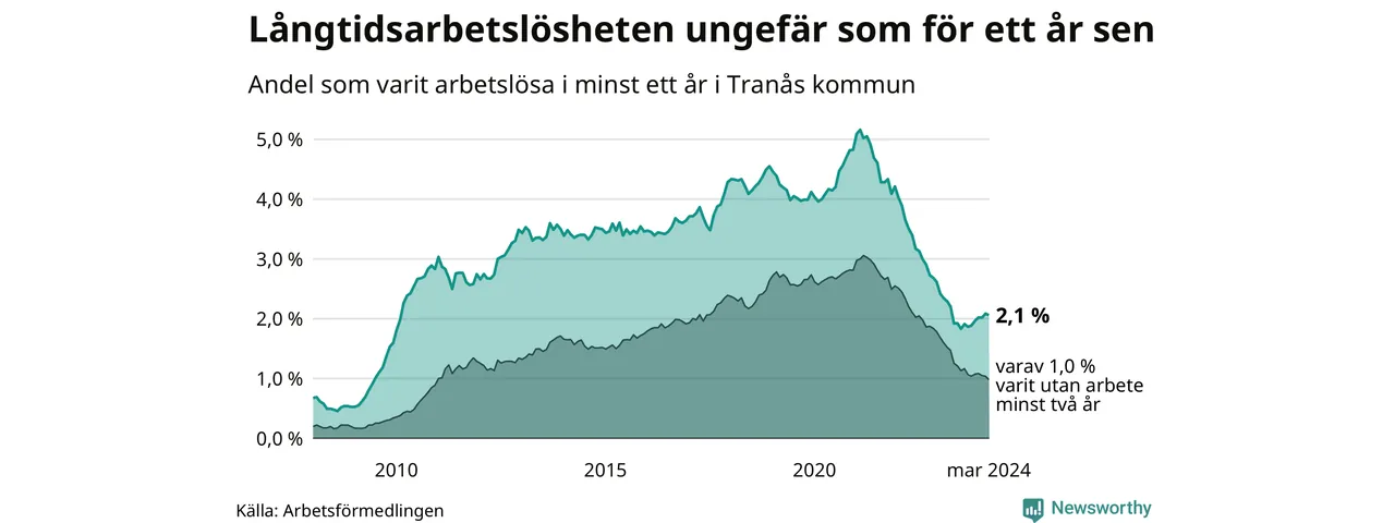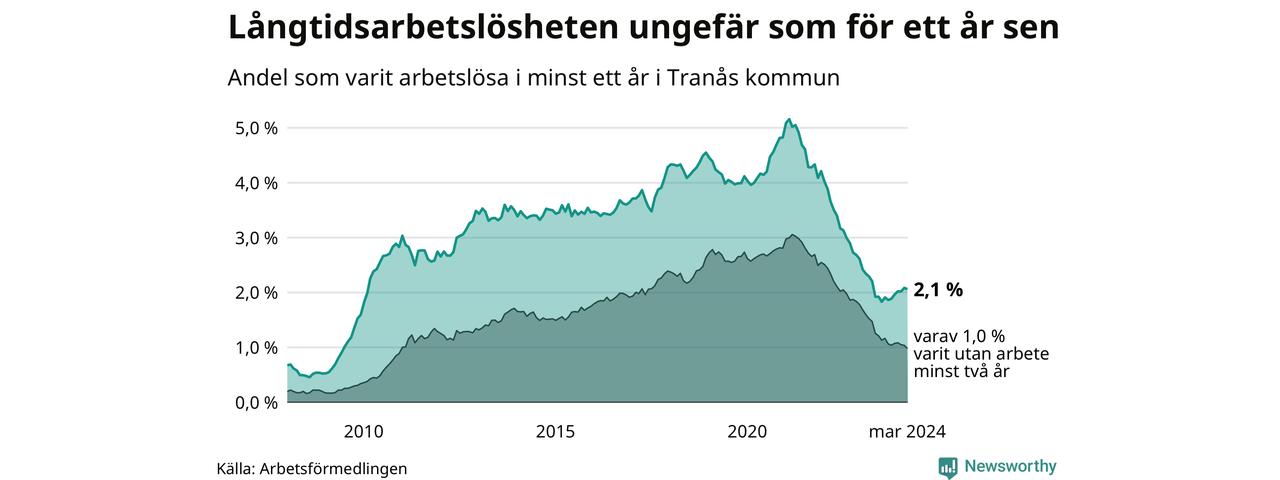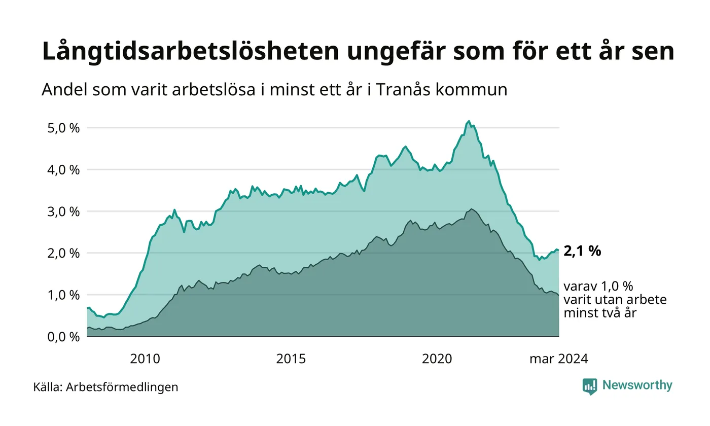 I mars hade 183 Tranåsbor varit arbetslösa i minst ett år, vilket är två färre än månaden innan. Det är den första månaden sedan september 2023 som antalet arbetslösa minskar. 183 personer motsvarar 2,1 procent av arbetskraften i kommunen – andelen långtidsarbetslösa är ungefär på samma nivå som för ett år sedan.