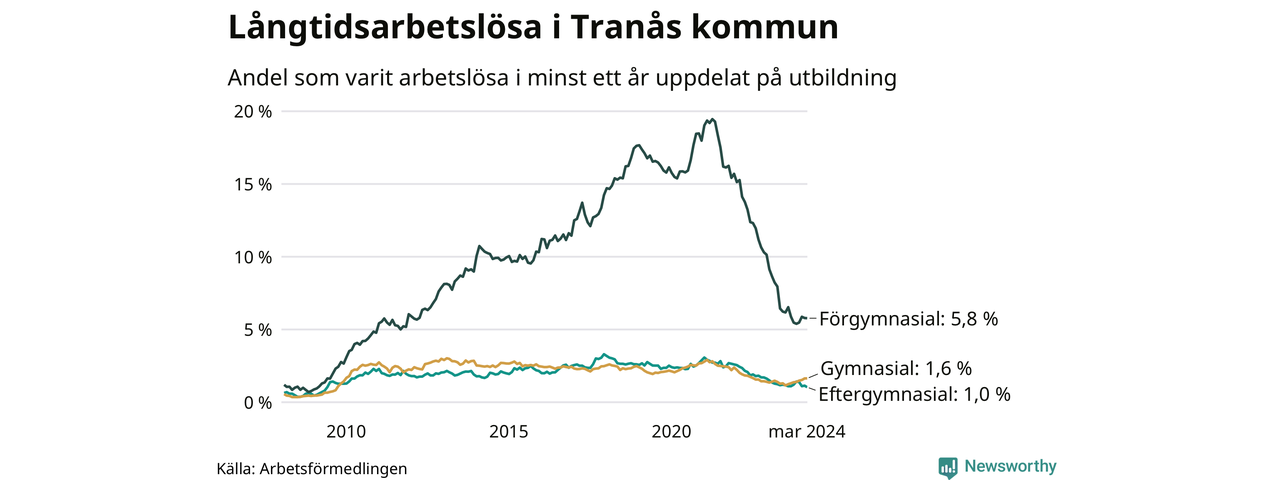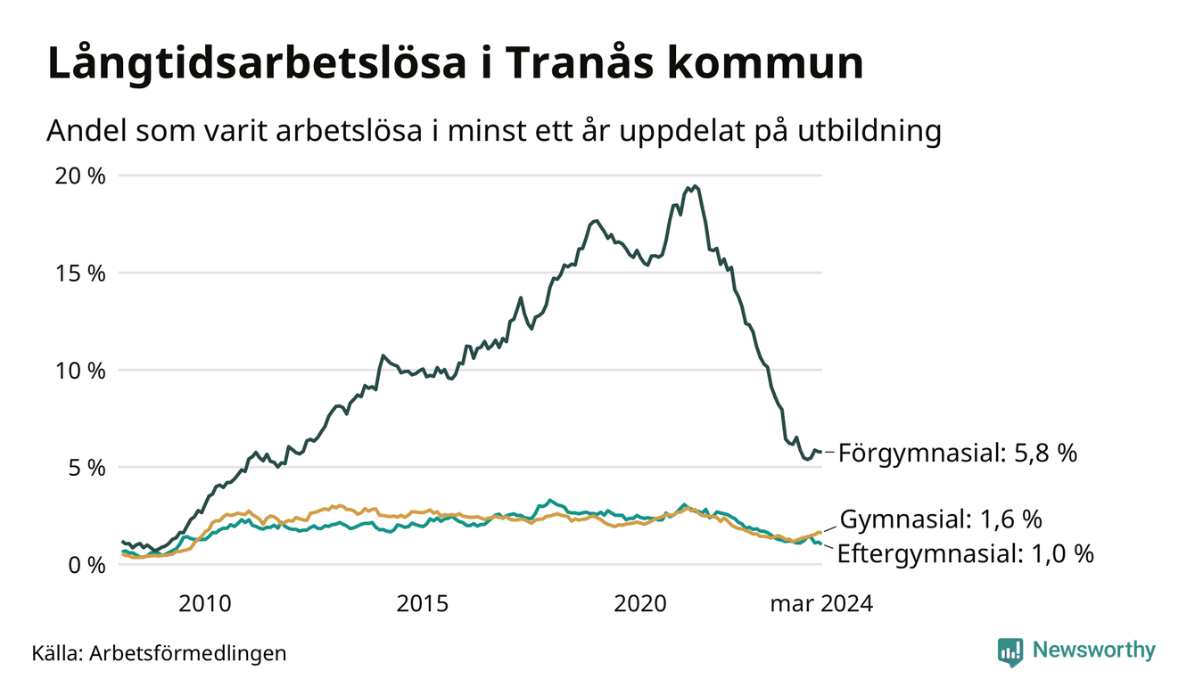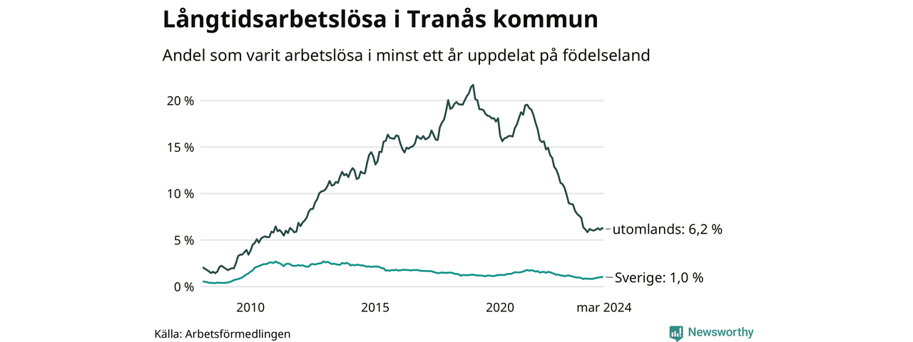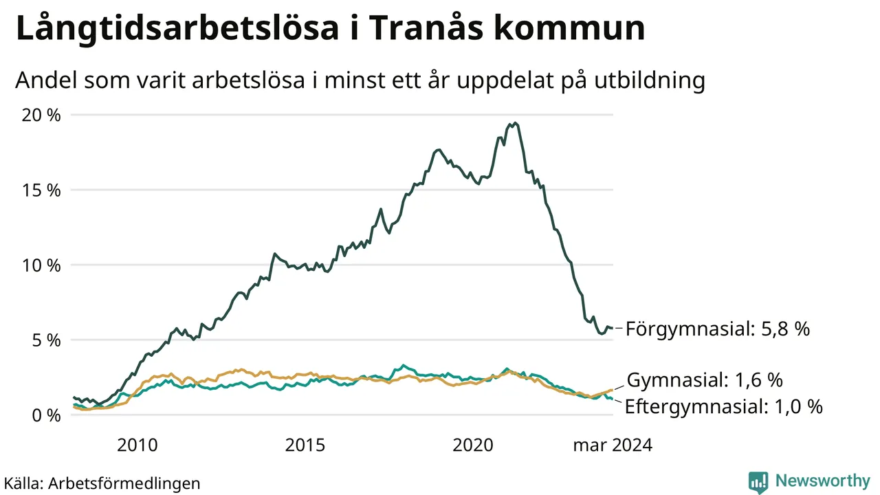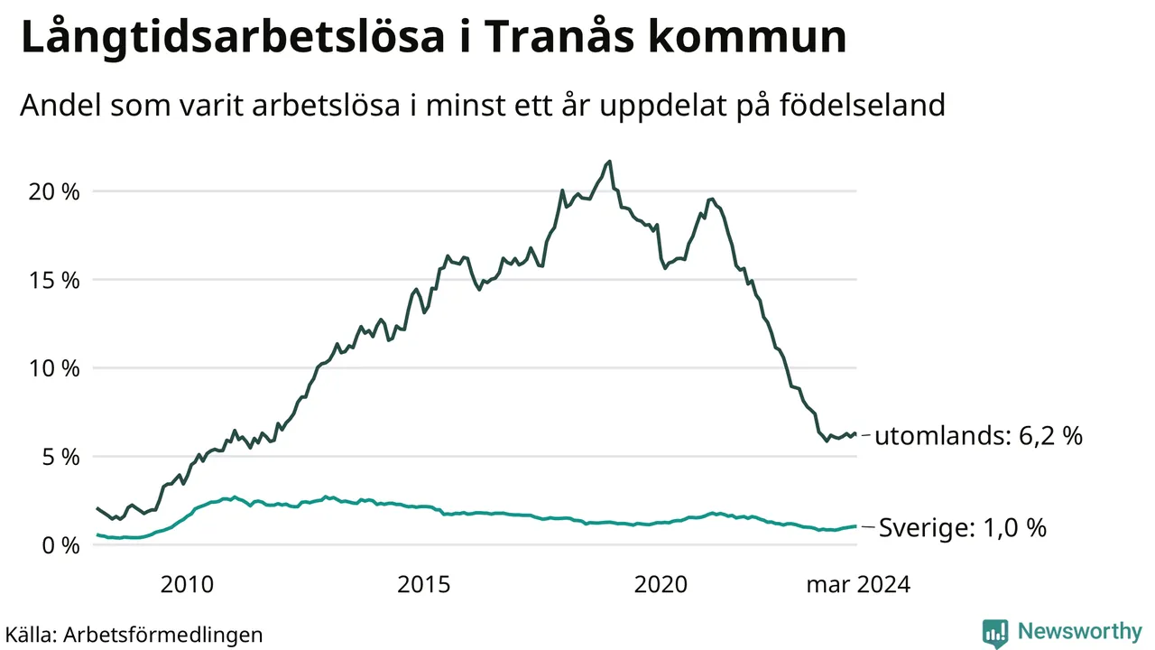 I mars hade 183 Tranåsbor varit arbetslösa i minst ett år, vilket är två färre än månaden innan. Det är den första månaden sedan september 2023 som antalet arbetslösa minskar. 183 personer motsvarar 2,1 procent av arbetskraften i kommunen – andelen långtidsarbetslösa är ungefär på samma nivå som för ett år sedan.