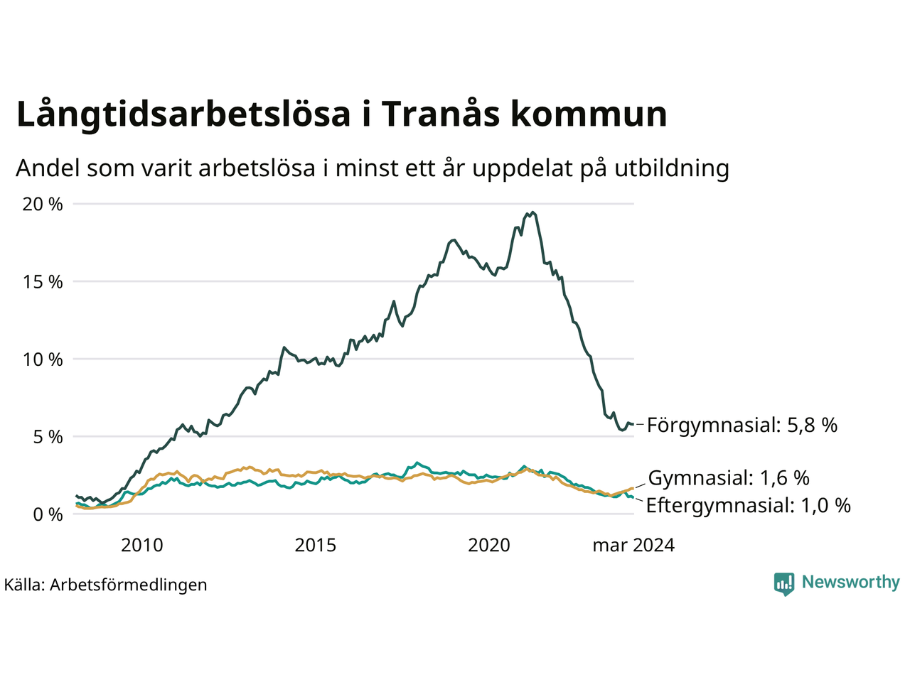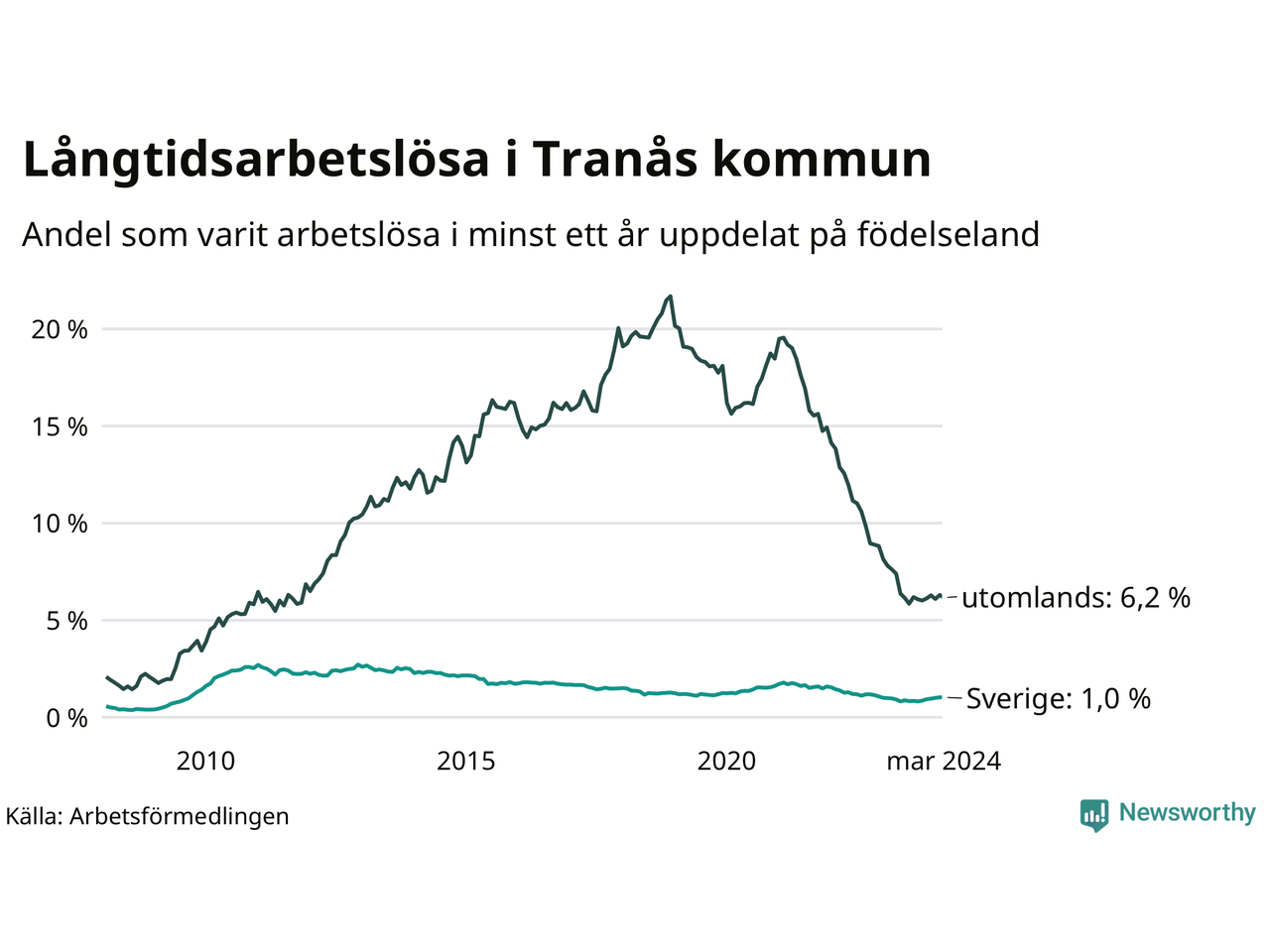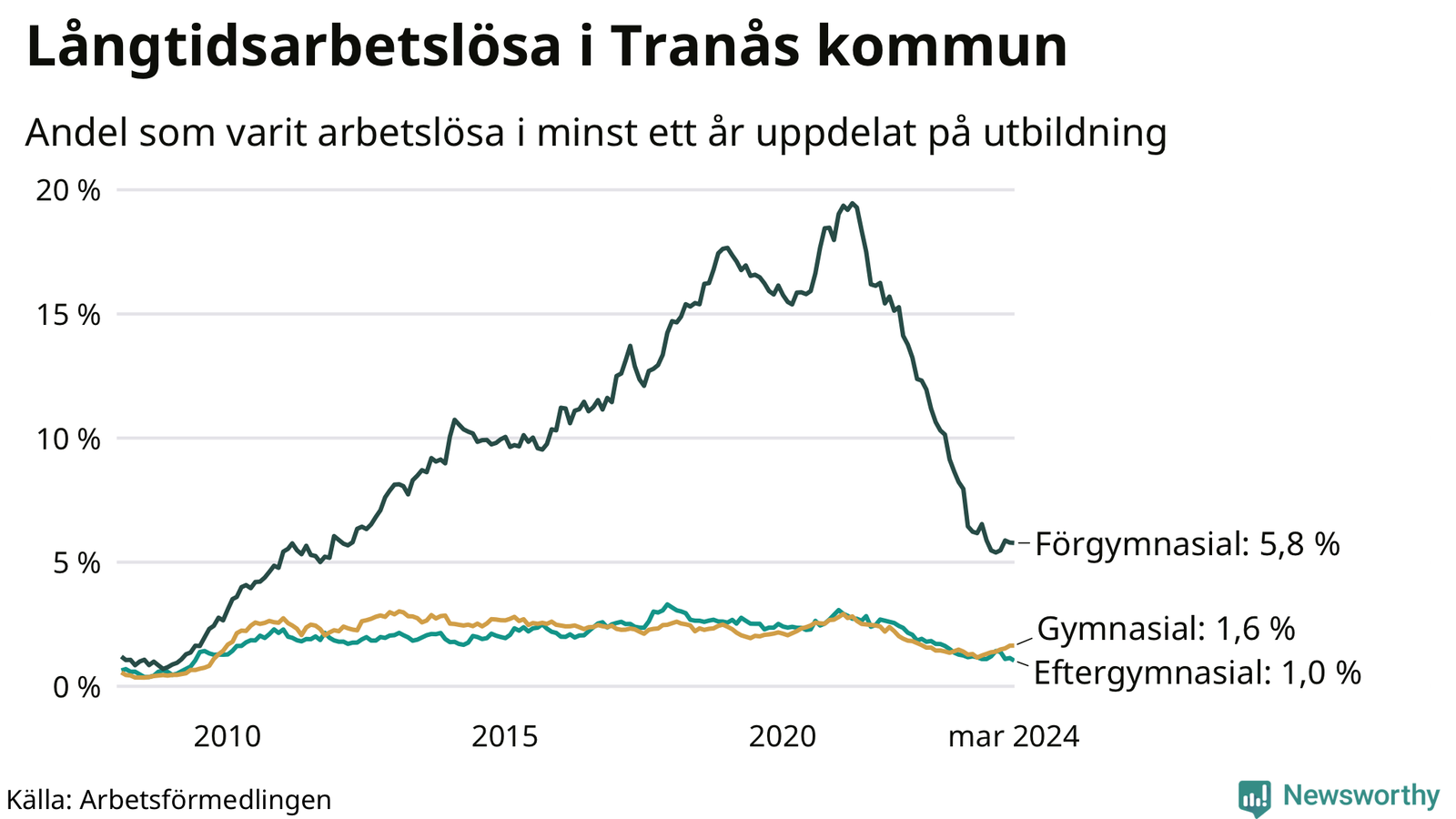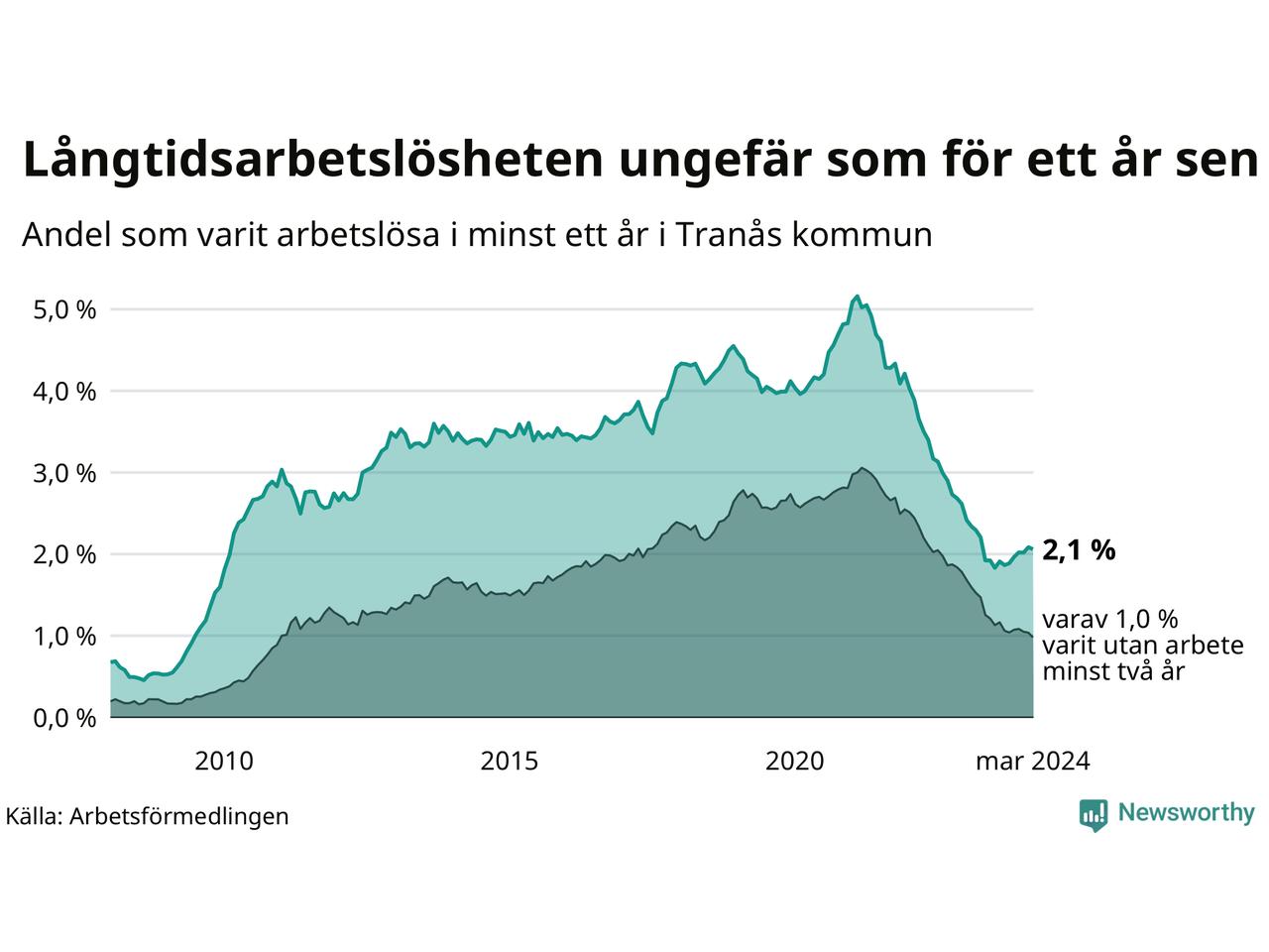 I mars hade 183 Tranåsbor varit arbetslösa i minst ett år, vilket är två färre än månaden innan. Det är den första månaden sedan september 2023 som antalet arbetslösa minskar. 183 personer motsvarar 2,1 procent av arbetskraften i kommunen – andelen långtidsarbetslösa är ungefär på samma nivå som för ett år sedan.