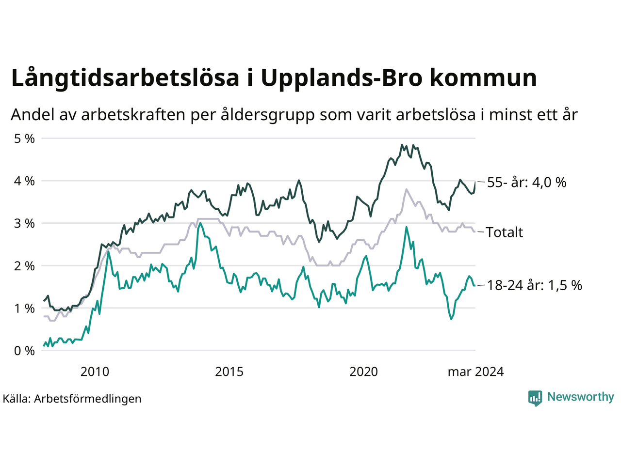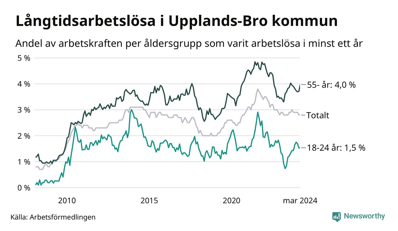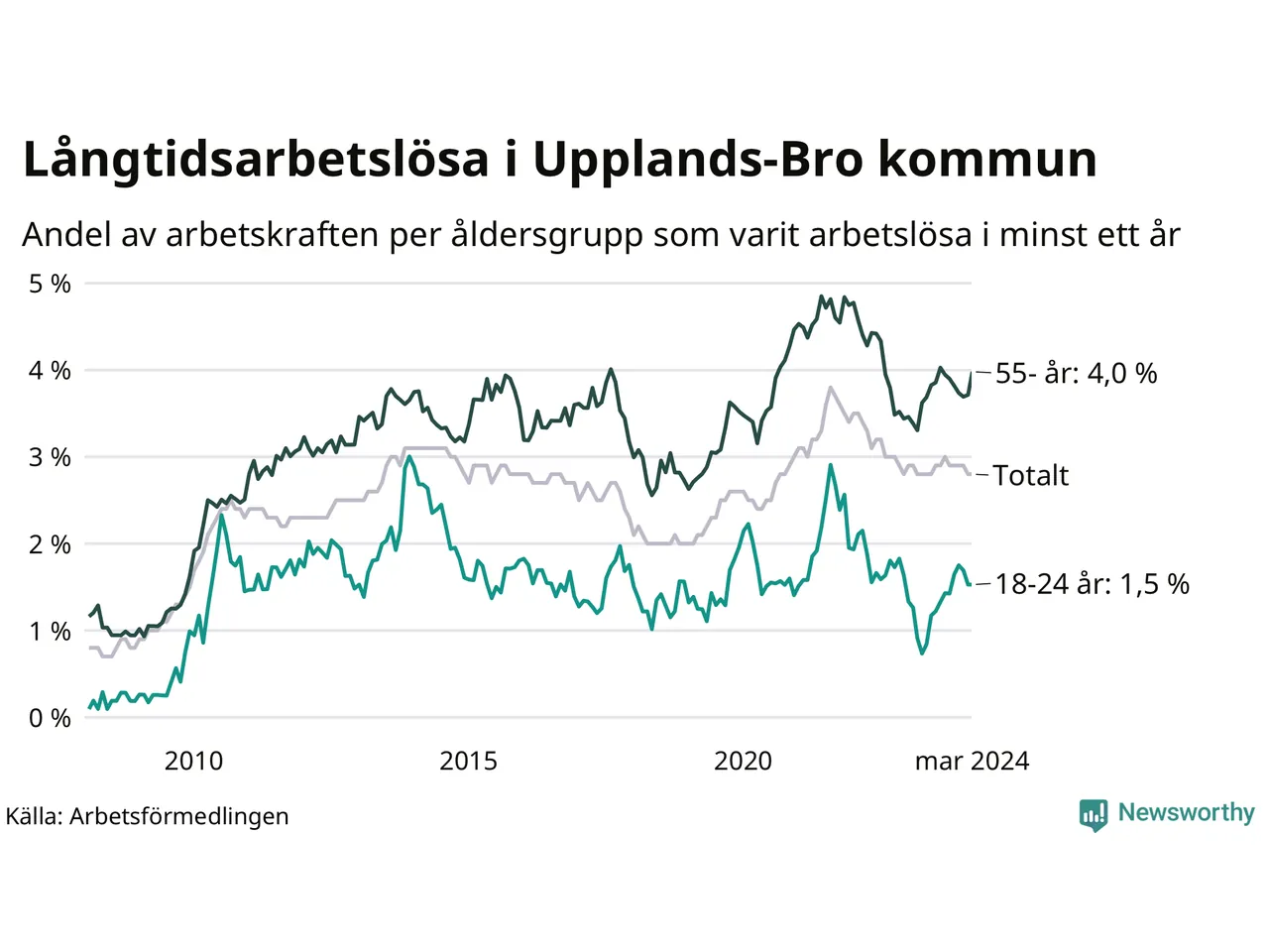 Av de 465 personerna som varit arbetslösa i mer än ett år i Upplands-Bro kommun är 114 personer mellan 55 och 651 år och 28 är mellan 18 och 24 år. För den äldre gruppen är andelen arbetslösa 4,0 procent medan den i den yngre gruppen är 1,5 procent. Även i riket som helhet är långtidsarbetslösheten högre i gruppen äldre.