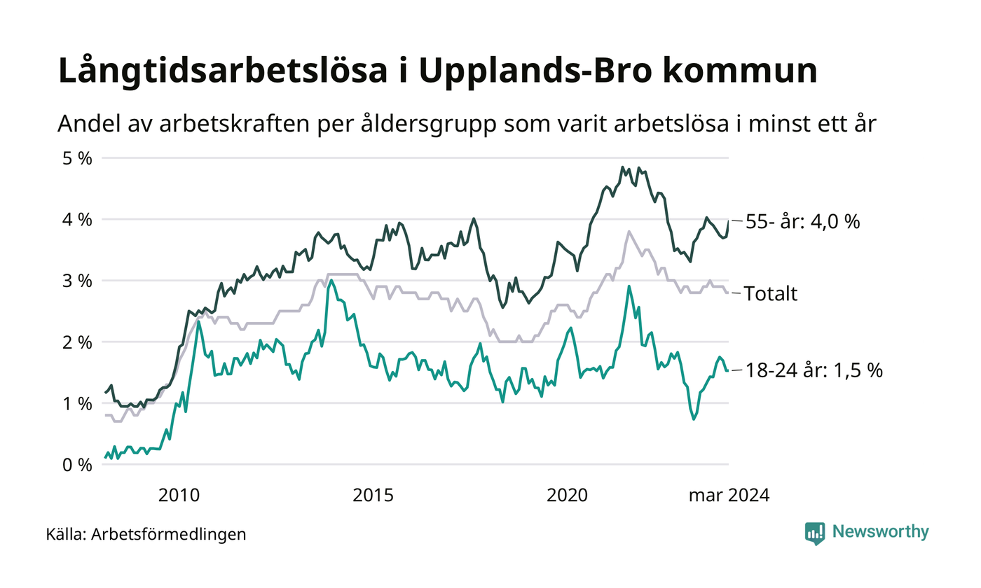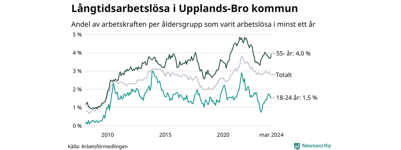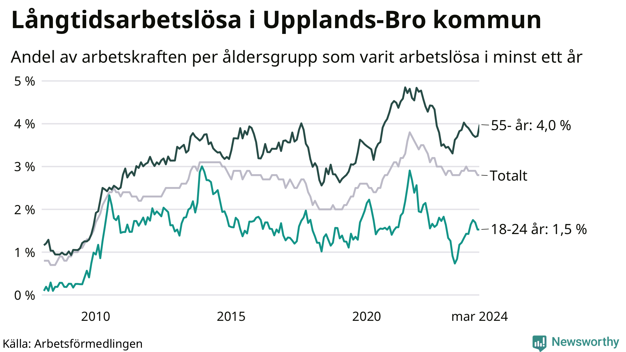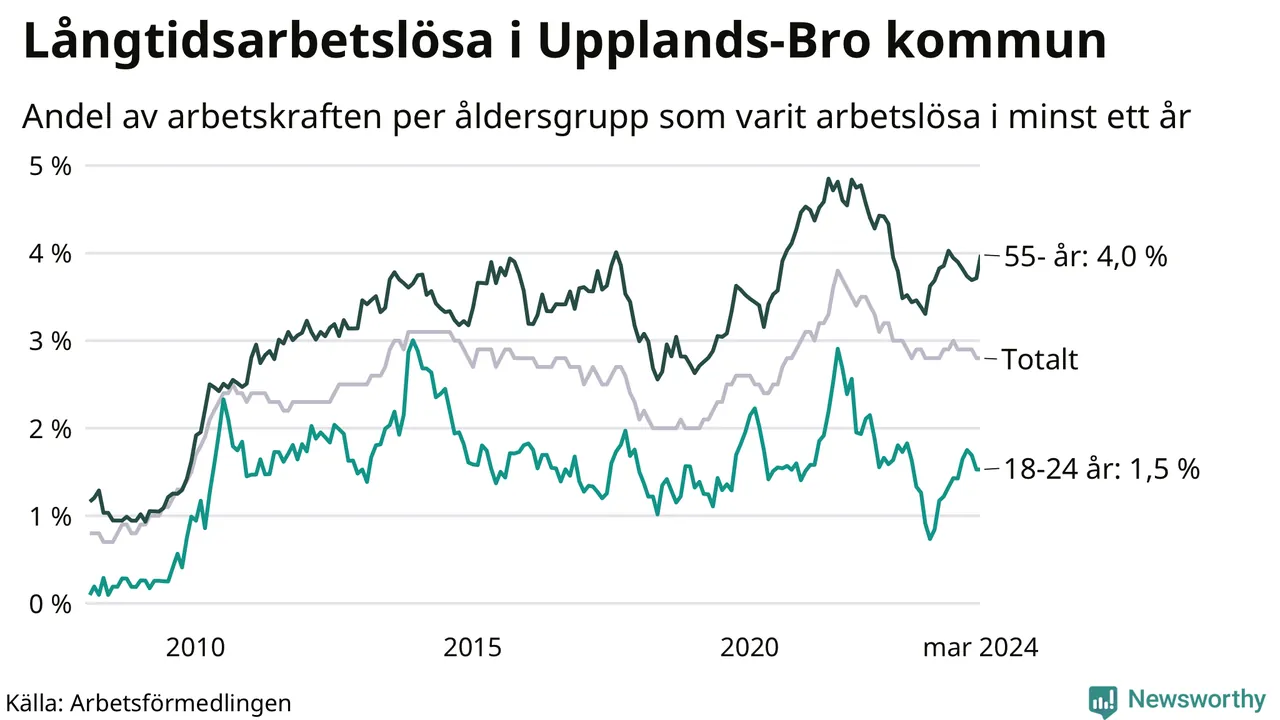Av de 465 personerna som varit arbetslösa i mer än ett år i Upplands-Bro kommun är 114 personer mellan 55 och 651 år och 28 är mellan 18 och 24 år. För den äldre gruppen är andelen arbetslösa 4,0 procent medan den i den yngre gruppen är 1,5 procent. Även i riket som helhet är långtidsarbetslösheten högre i gruppen äldre.