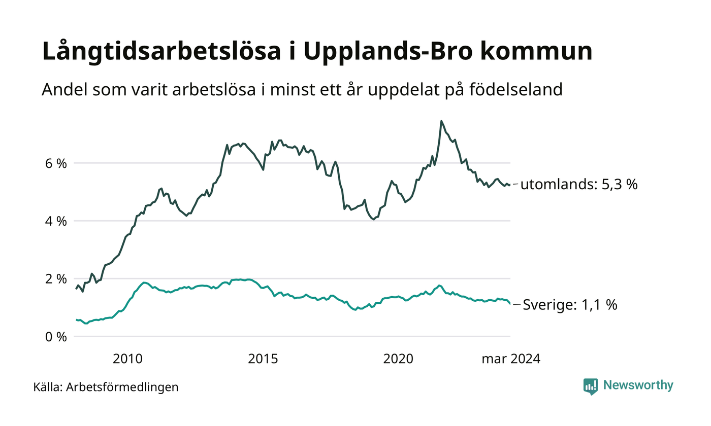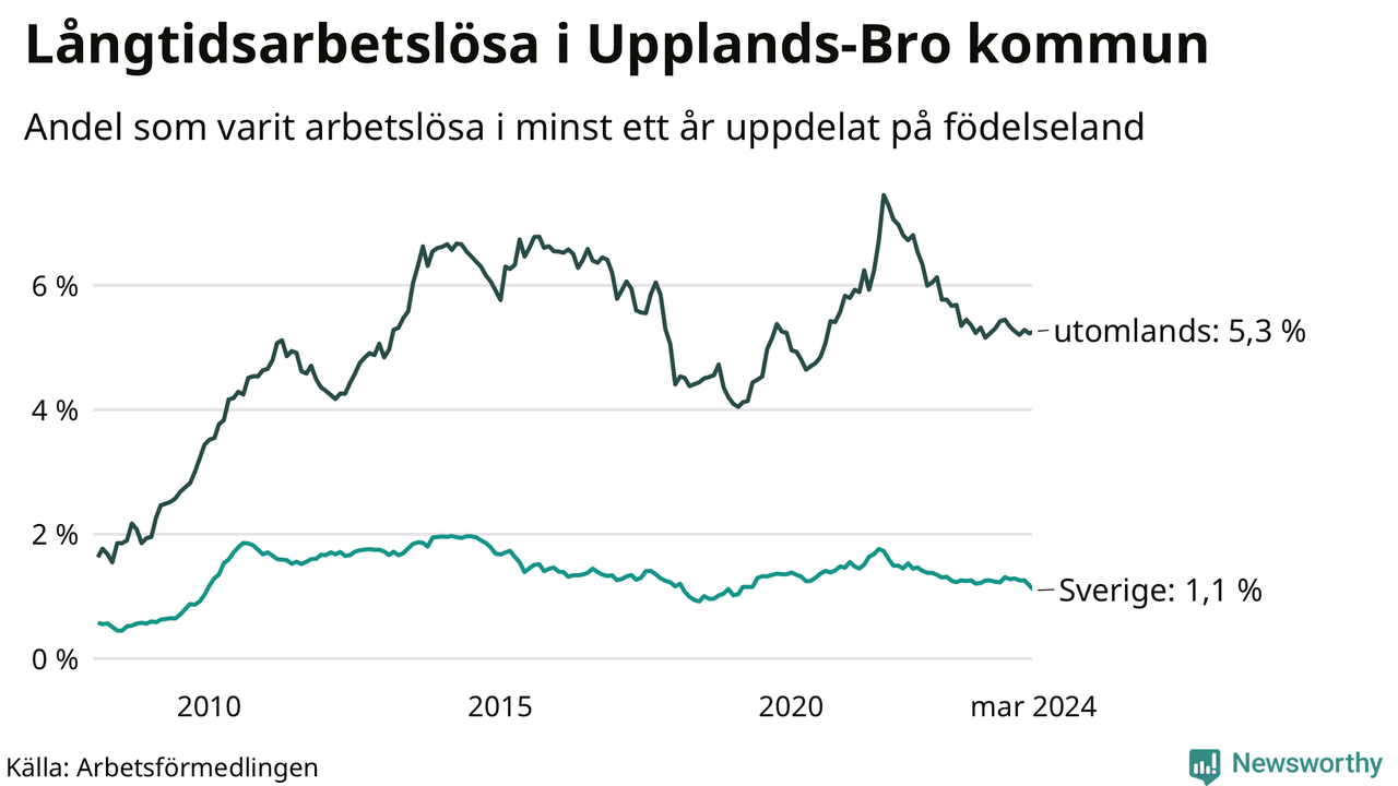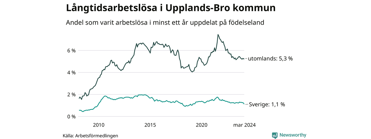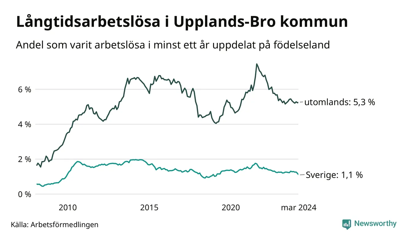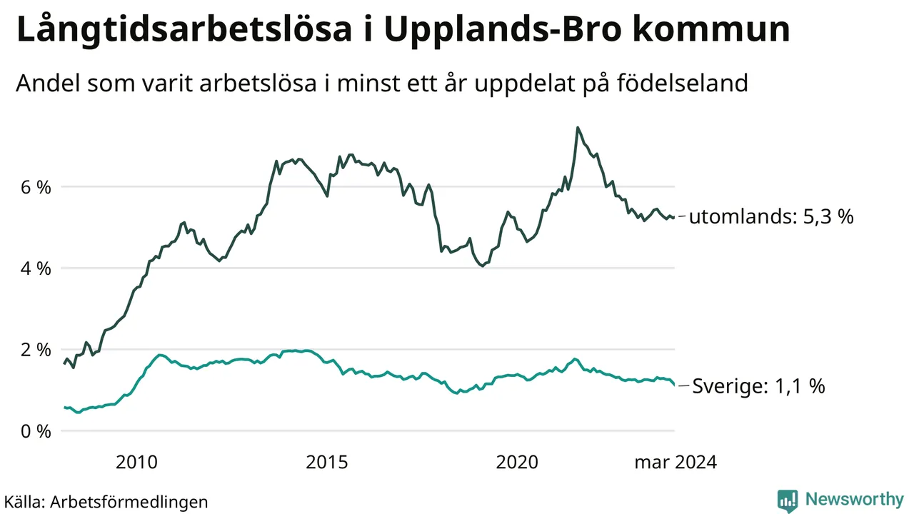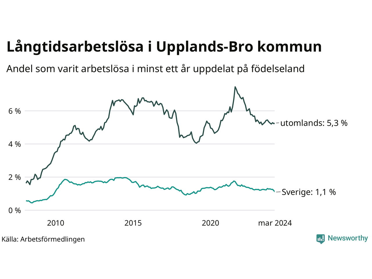 107 av de långtidsarbetslösa i Upplands-Bro är födda i Sverige, medan 358 är födda utomlands. Det innebär att långtidsarbetslösheten bland Sverigefödda är 1,1 procent, medan den är fem gånger så hög – 5,3 procent – bland födda utomlands. Även i riket som helhet är arbetslösheten högre bland utrikesfödda.