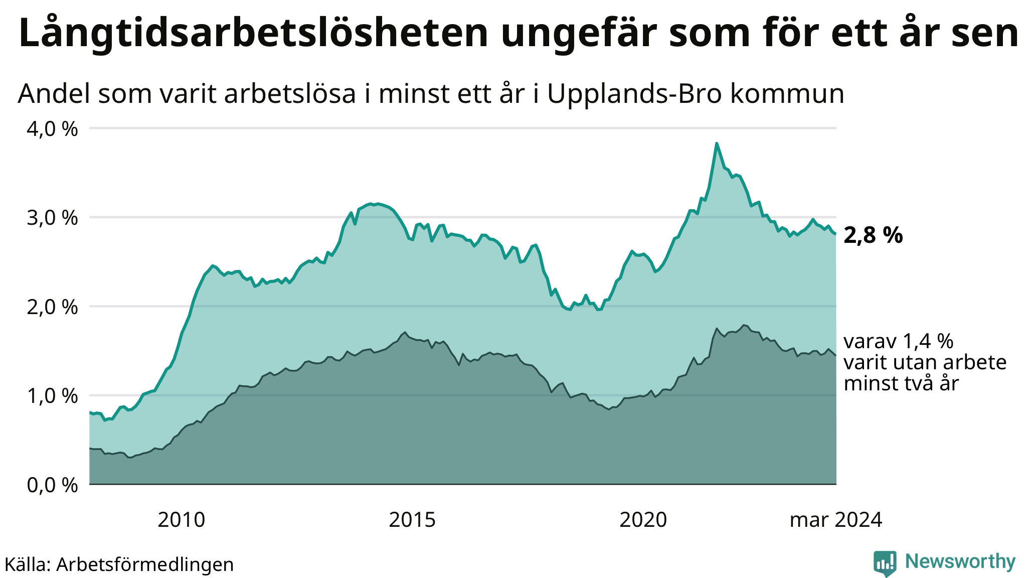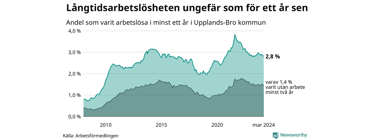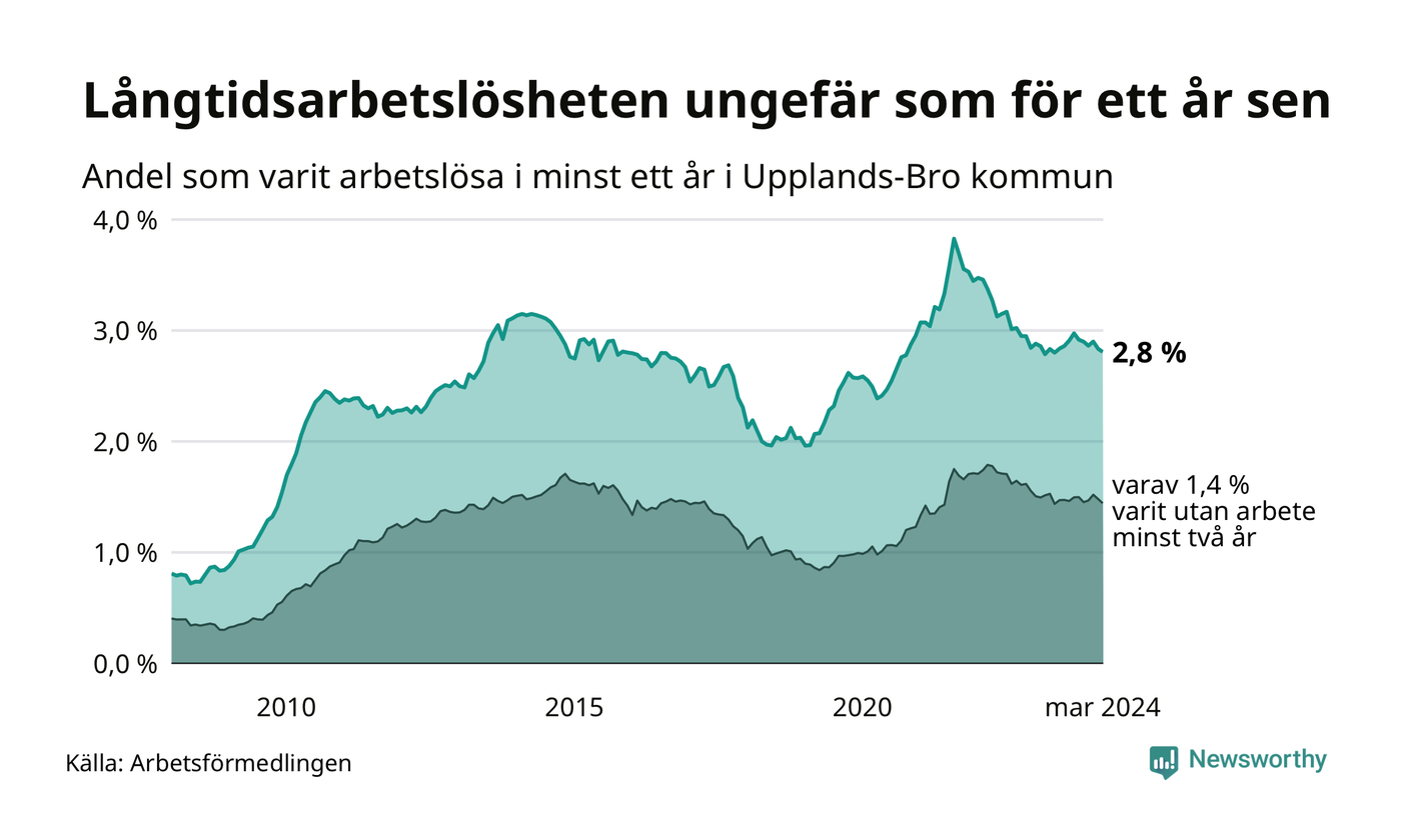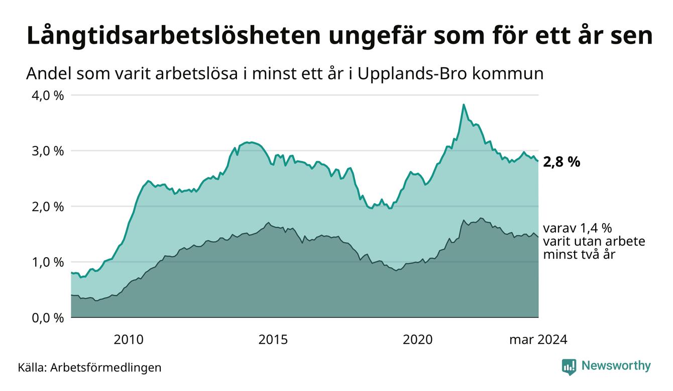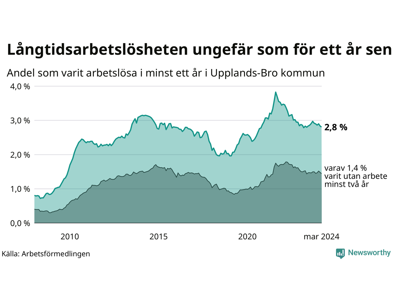 I mars hade 465 Upplands-Brobor varit arbetslösa i minst ett år, vilket är fyra färre än månaden innan. 465 personer motsvarar 2,8 procent av arbetskraften i kommunen – andelen långtidsarbetslösa är ungefär på samma nivå som för ett år sedan.