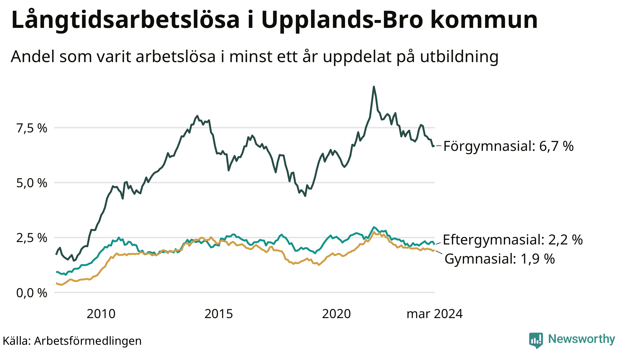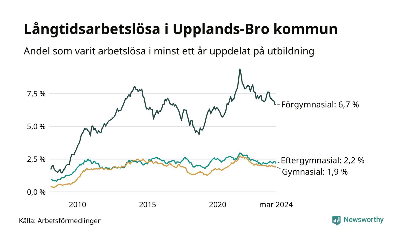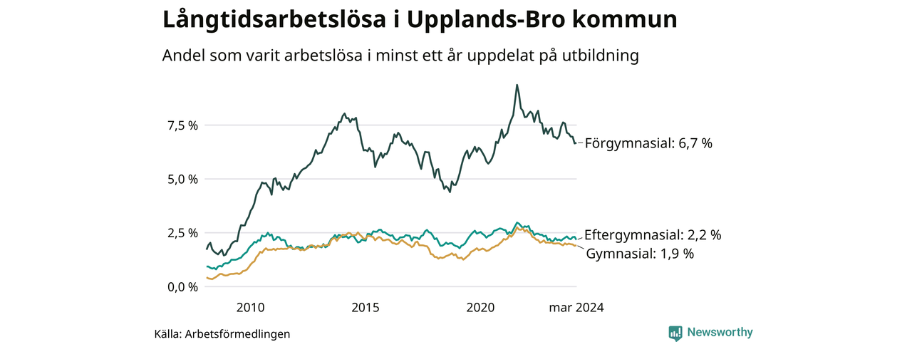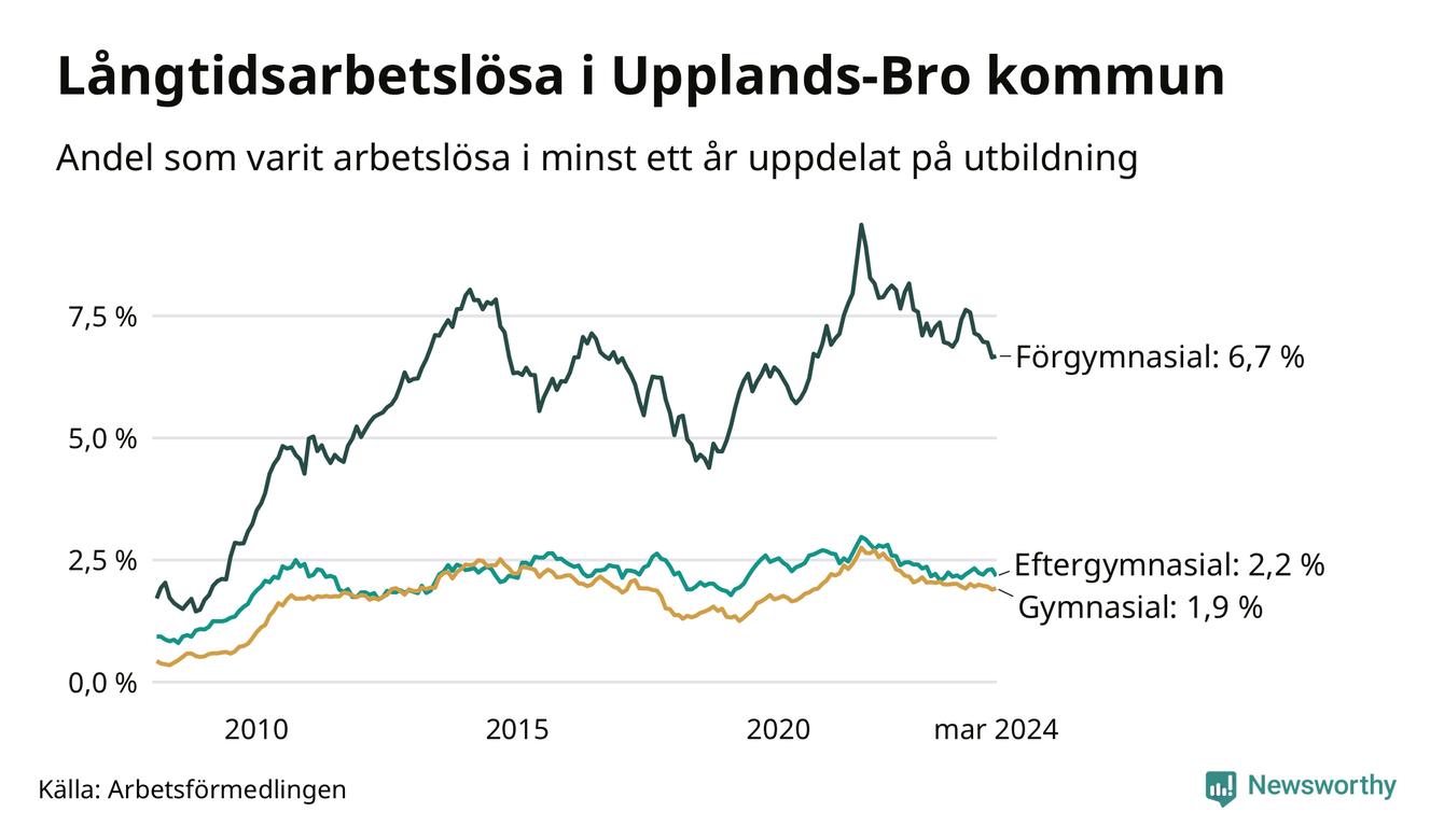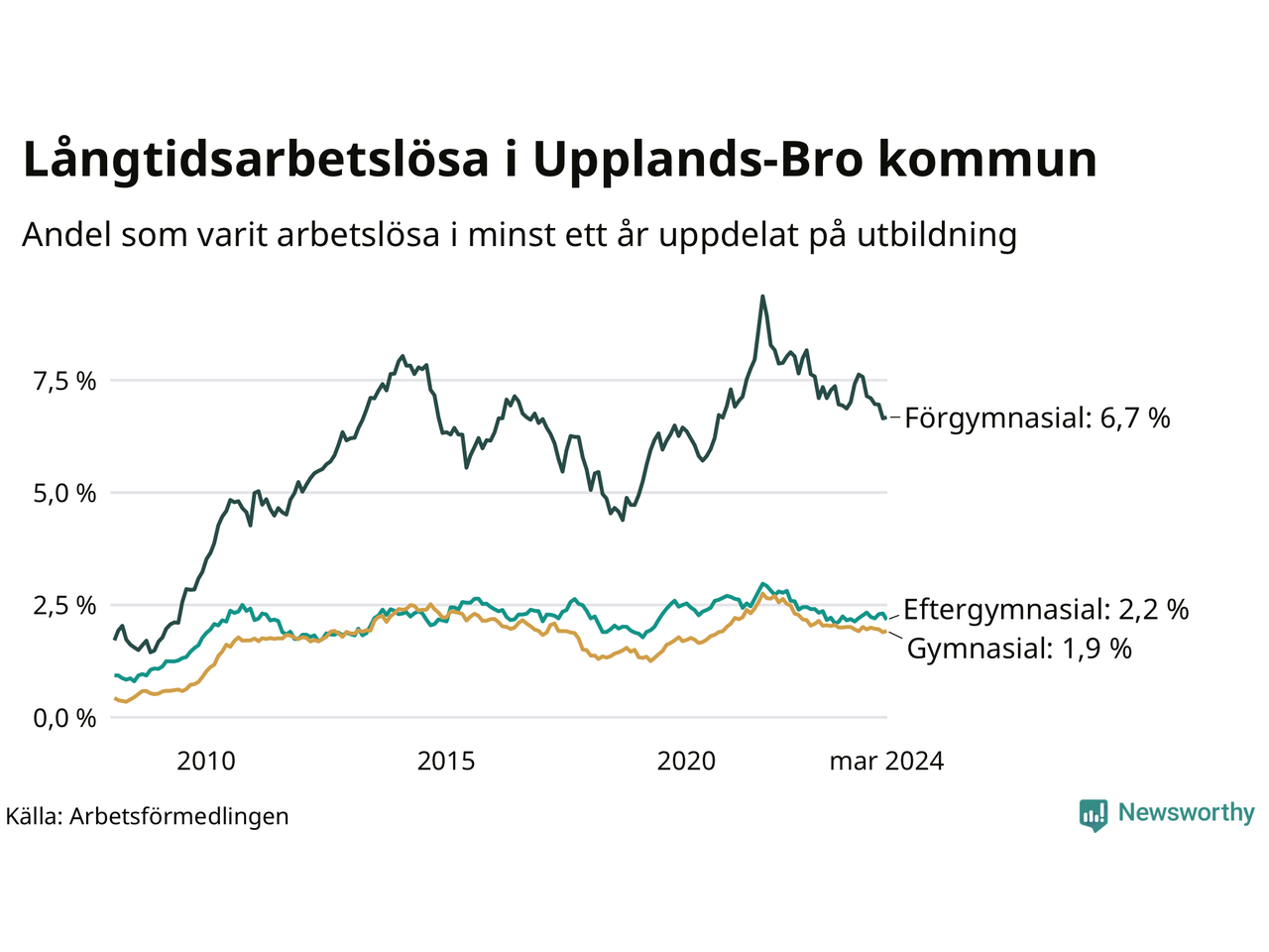 I mars hade 465 Upplands-Brobor varit arbetslösa i minst ett år, vilket är fyra färre än månaden innan. 465 personer motsvarar 2,8 procent av arbetskraften i kommunen – andelen långtidsarbetslösa är ungefär på samma nivå som för ett år sedan.