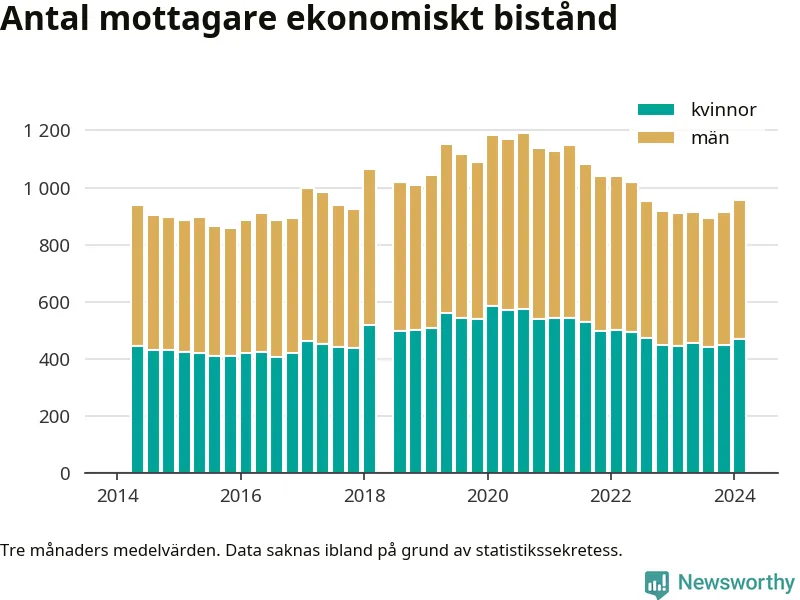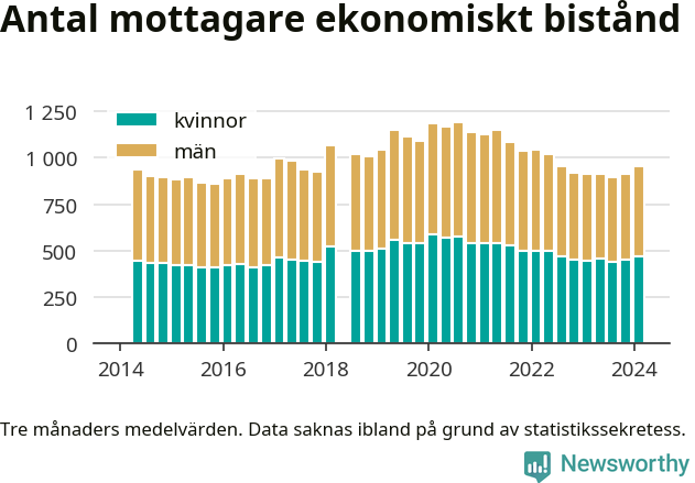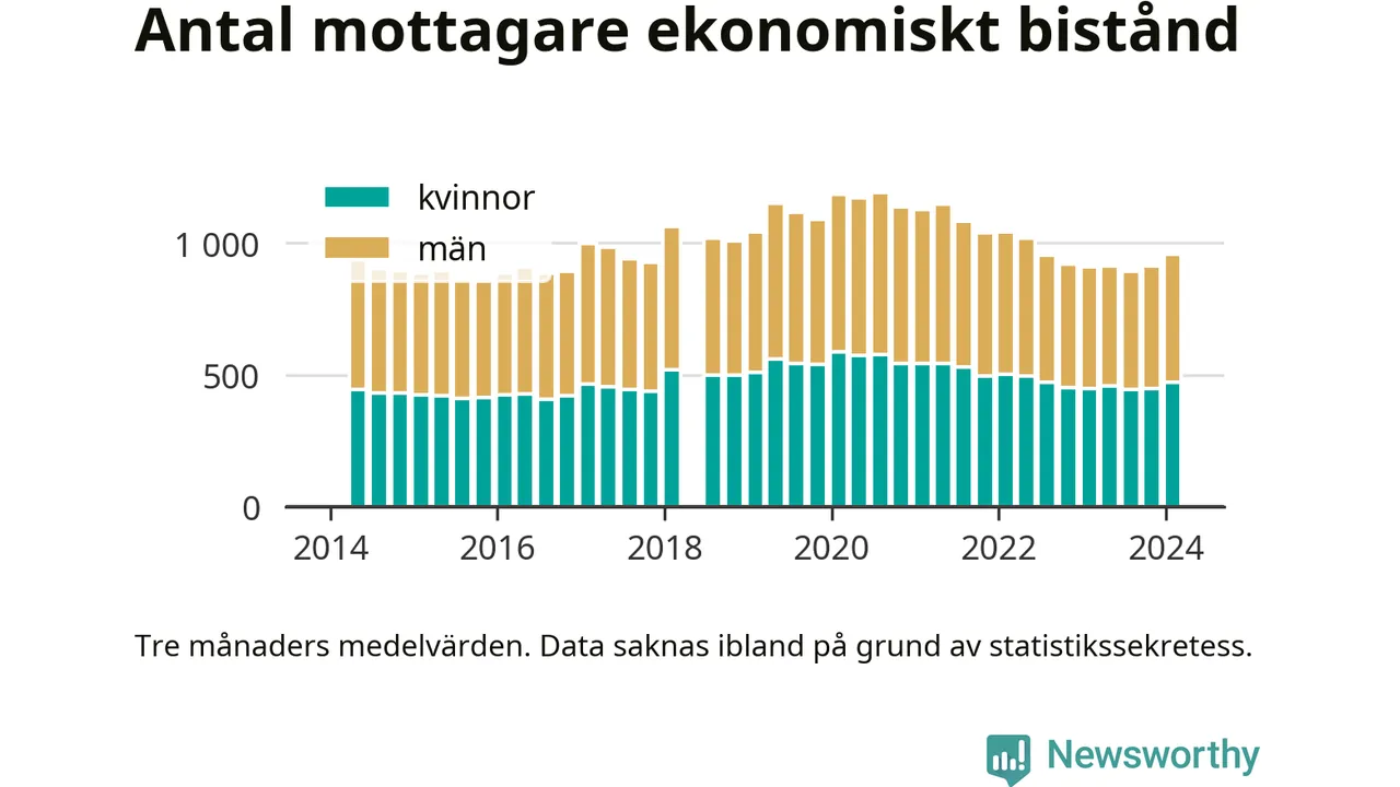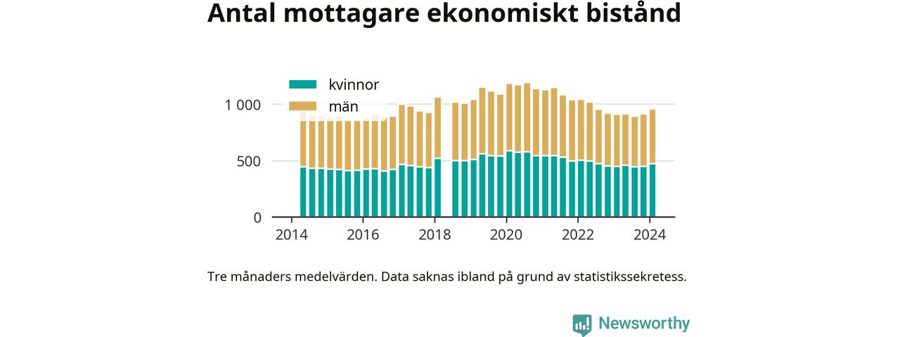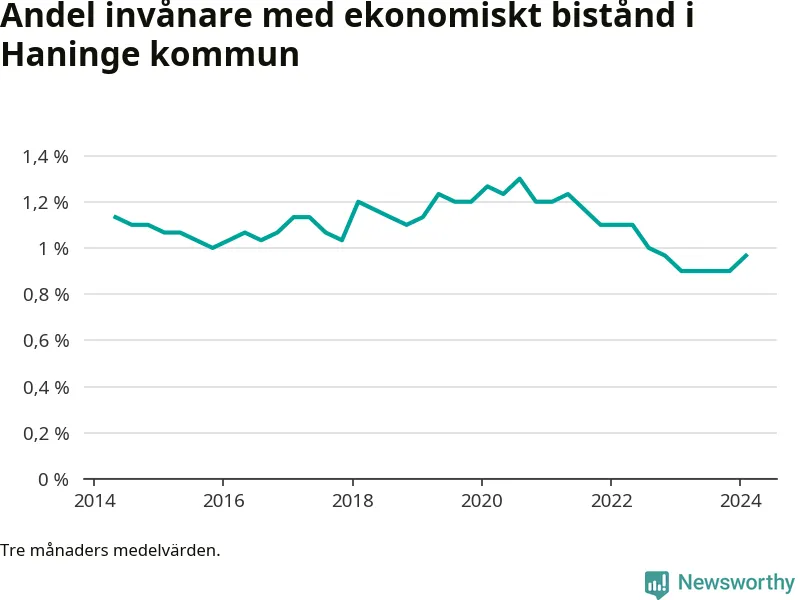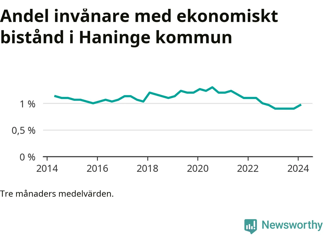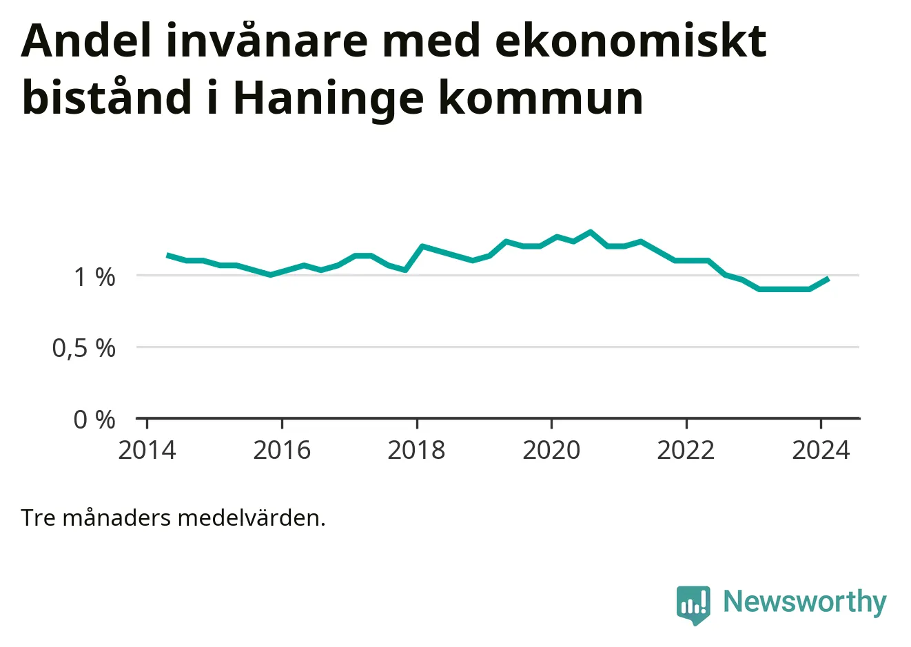 Den högsta andelen biståndstagare under det senaste decenniet hade kommunen under sommaren 2020 (1,3 procent), och den lägsta andelen under vintern 2023 (0,9 procent).