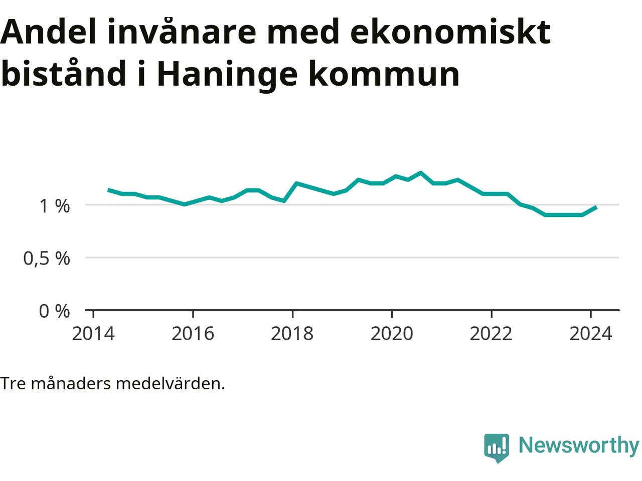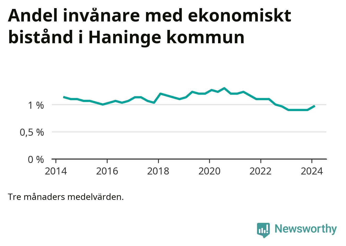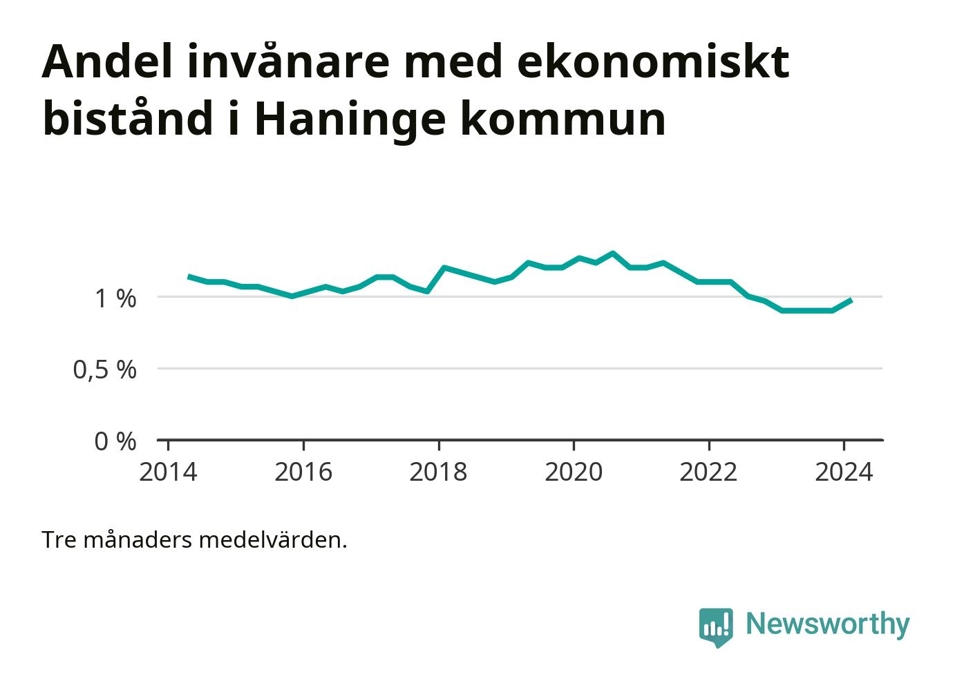 I genomsnitt 957 personer per månad fick ekonomiskt bistånd i Haninge kommun under vintermånaderna (december till februari), vilket motsvarar 1,0 procent av den vuxna befolkningen. Det är marginellt mer än i höstas, och något större andel än under vintern för ett år sedan.